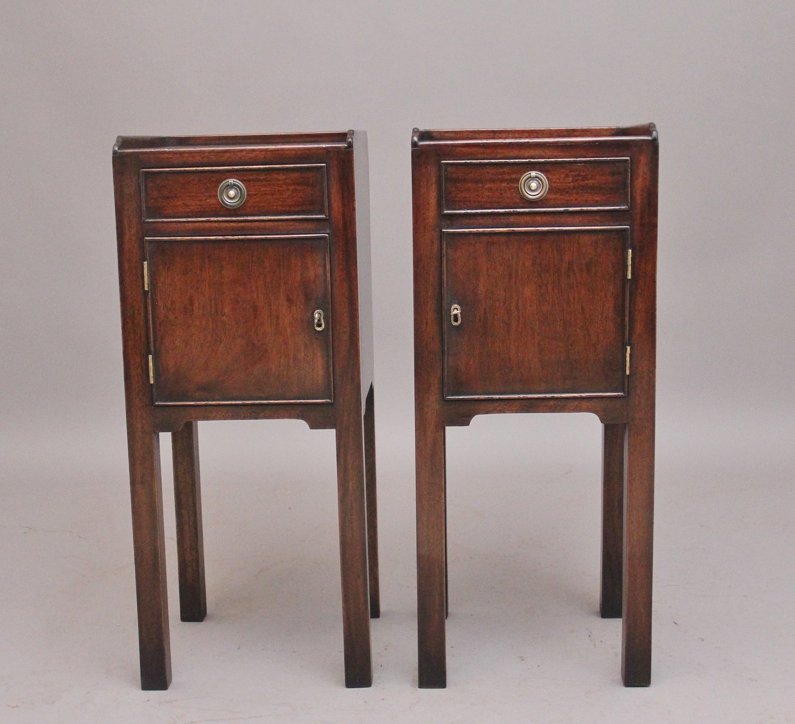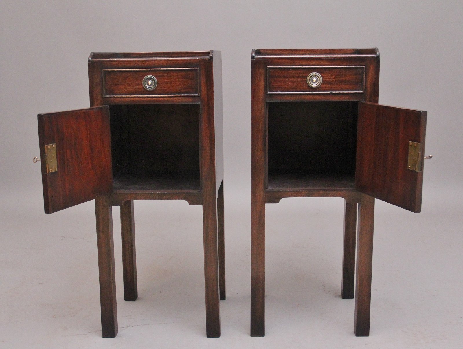 A nice decorative pair of early 20th Century mahogany bedside cupboards, lovely figured tops having a three quarter shaped gallery above a hinged cupboard door opening to reveal a large compartment space, single oak lined drawer below with the original brass ring handle, supported on four elegant square legs united by a decorative shaped stretcher. Circa 1920.
