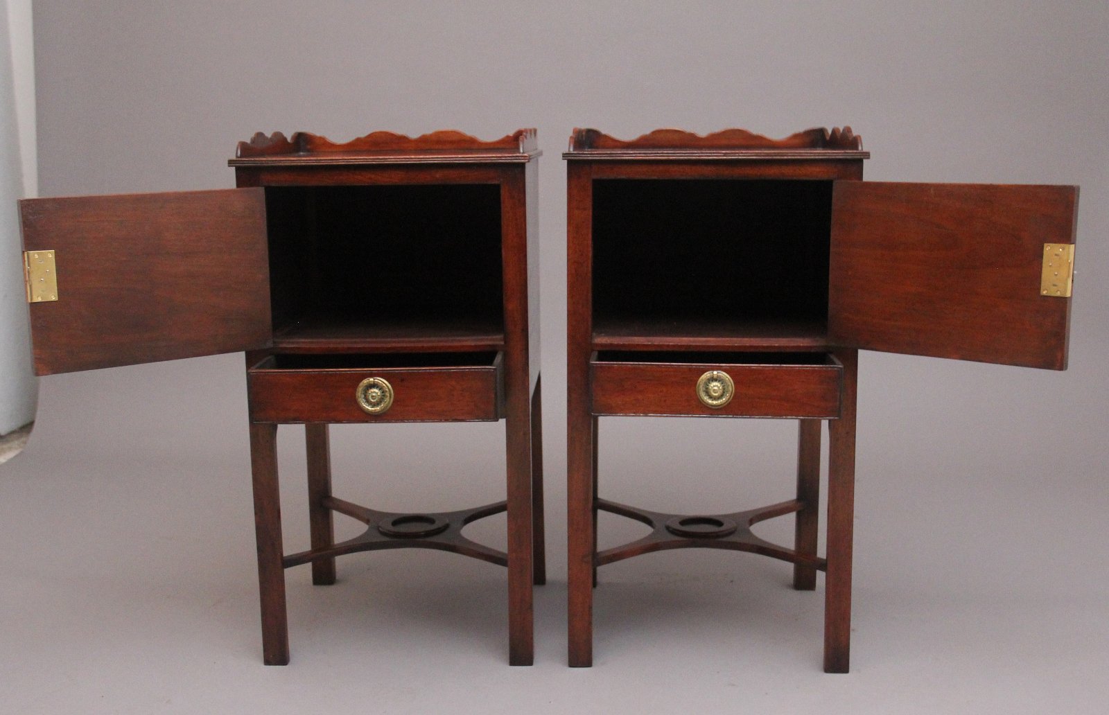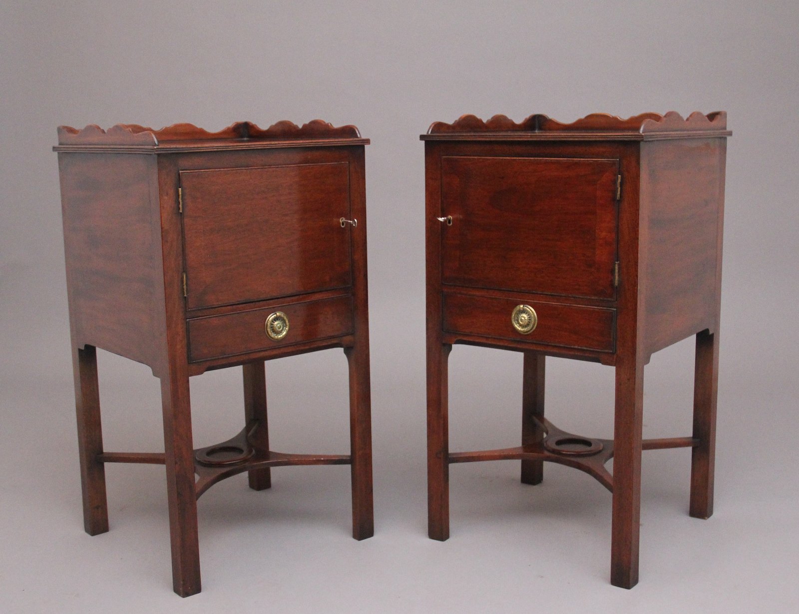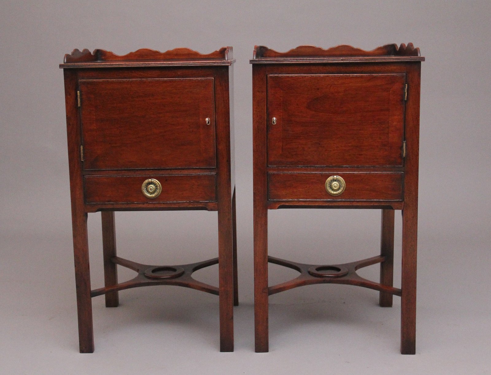 A nice decorative pair of early 20th Century mahogany bedside cupboards, lovely figured tops having a three quarter shaped gallery above a hinged cupboard door opening to reveal a large compartment space, single drawer below with the original brass ring handle, supported on four elegant square legs united by a decorative shaped stretcher. Circa 1920.