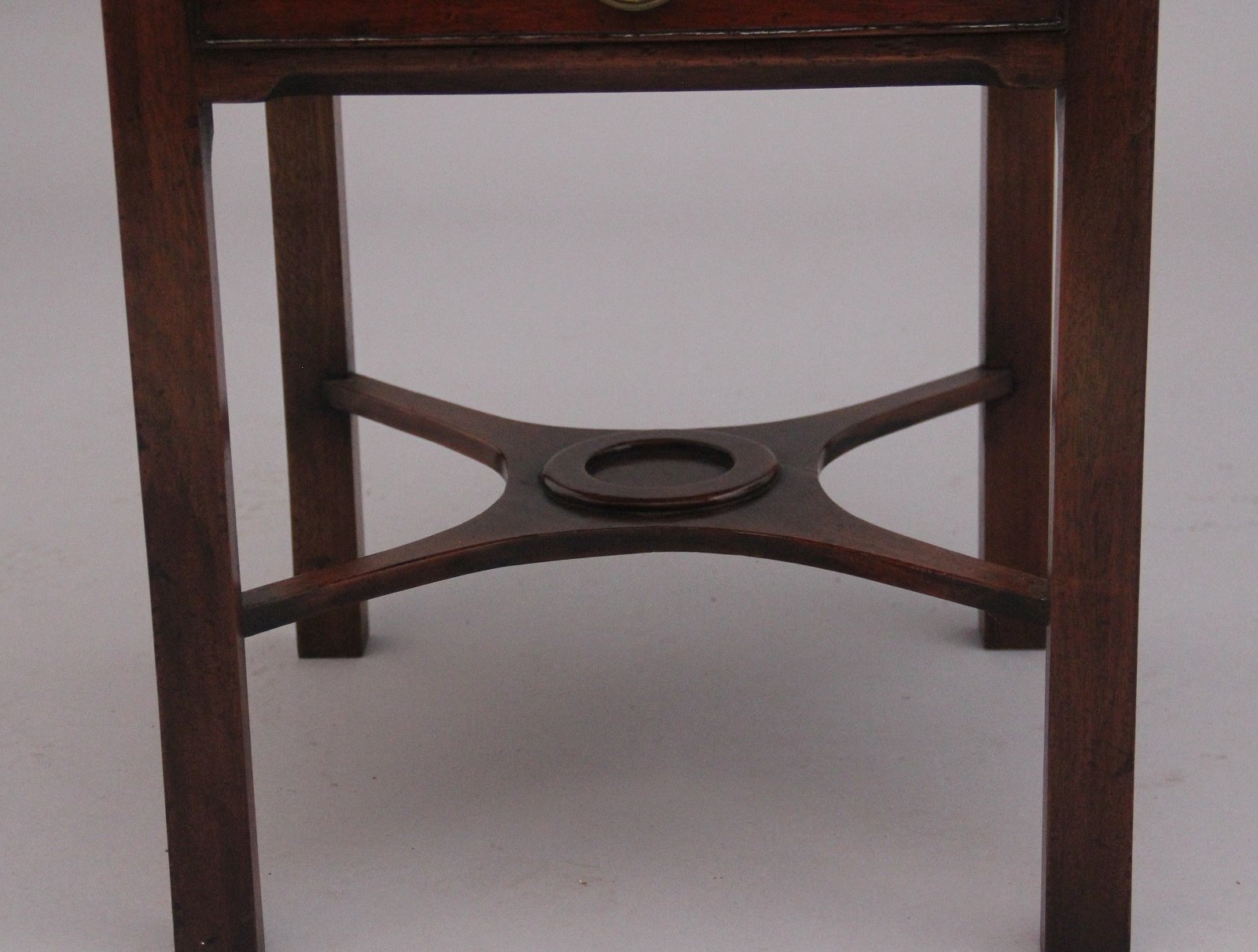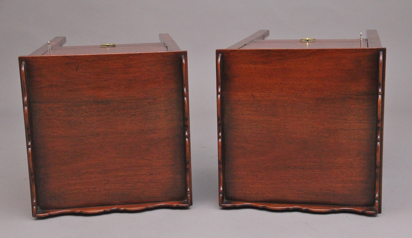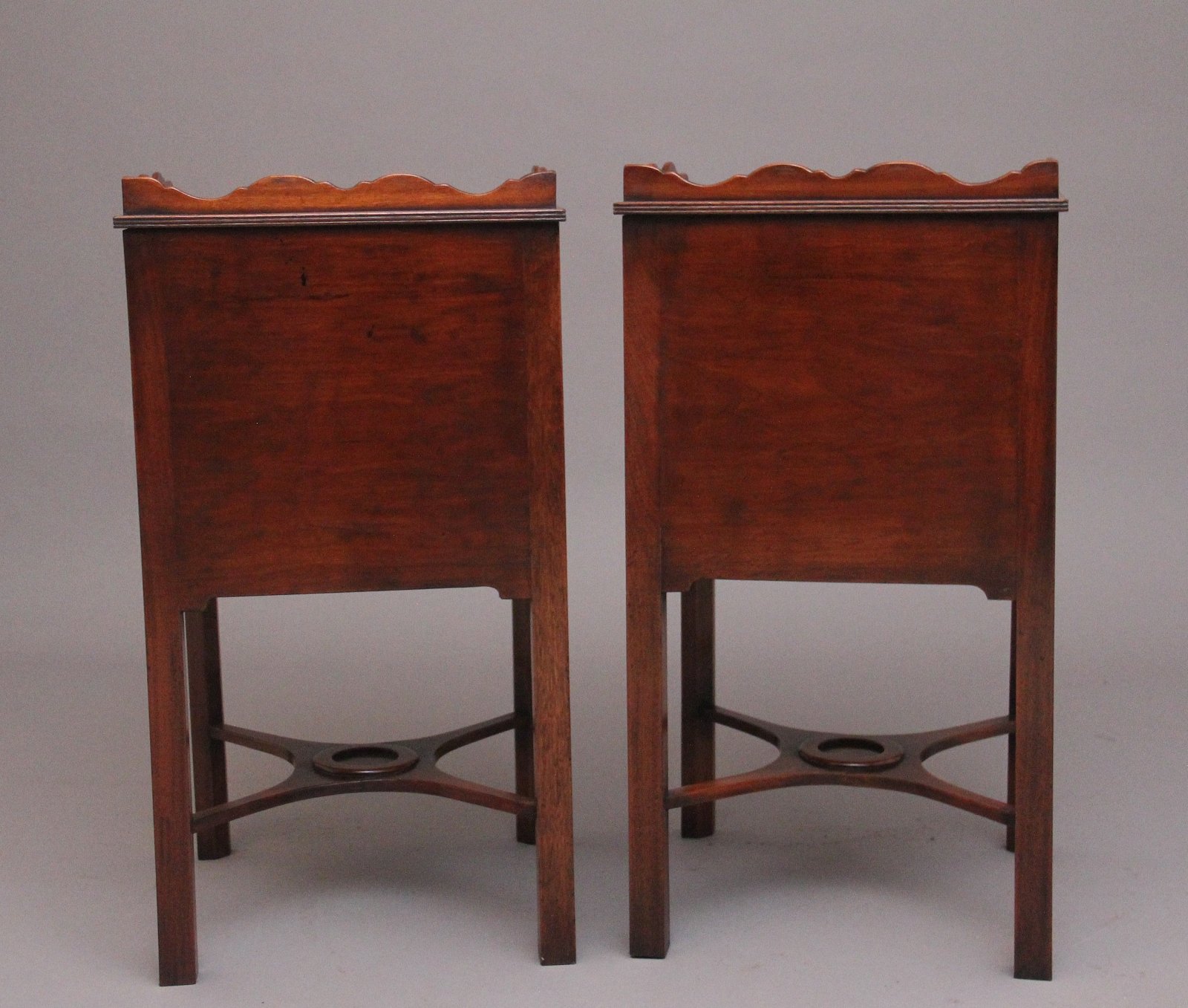A nice decorative pair of early 20th Century mahogany bedside cupboards, lovely figured tops having a three quarter shaped gallery above a hinged cupboard door opening to reveal a large compartment space, single drawer below with the original brass ring handle, supported on four elegant square legs united by a decorative shaped stretcher. Circa 1920.