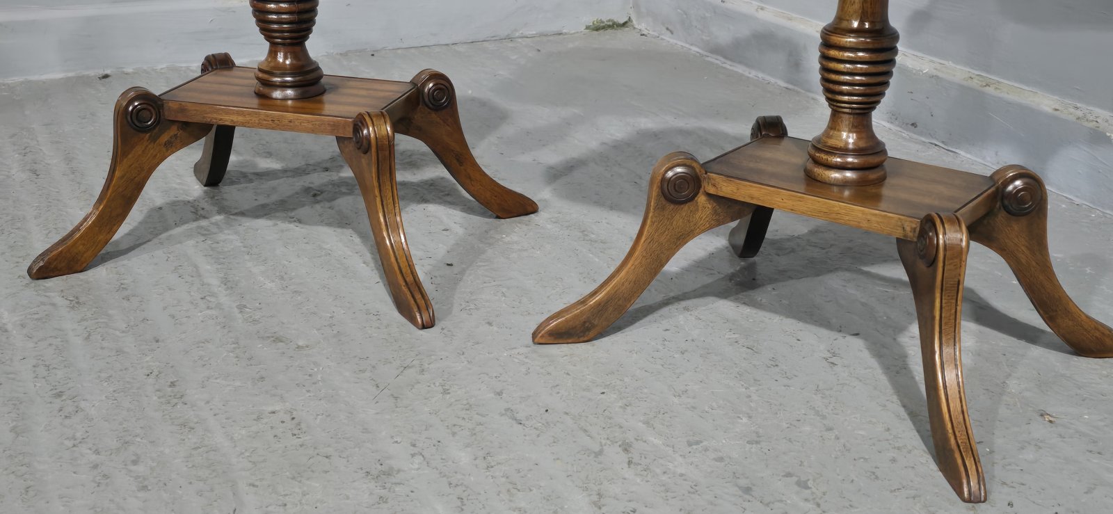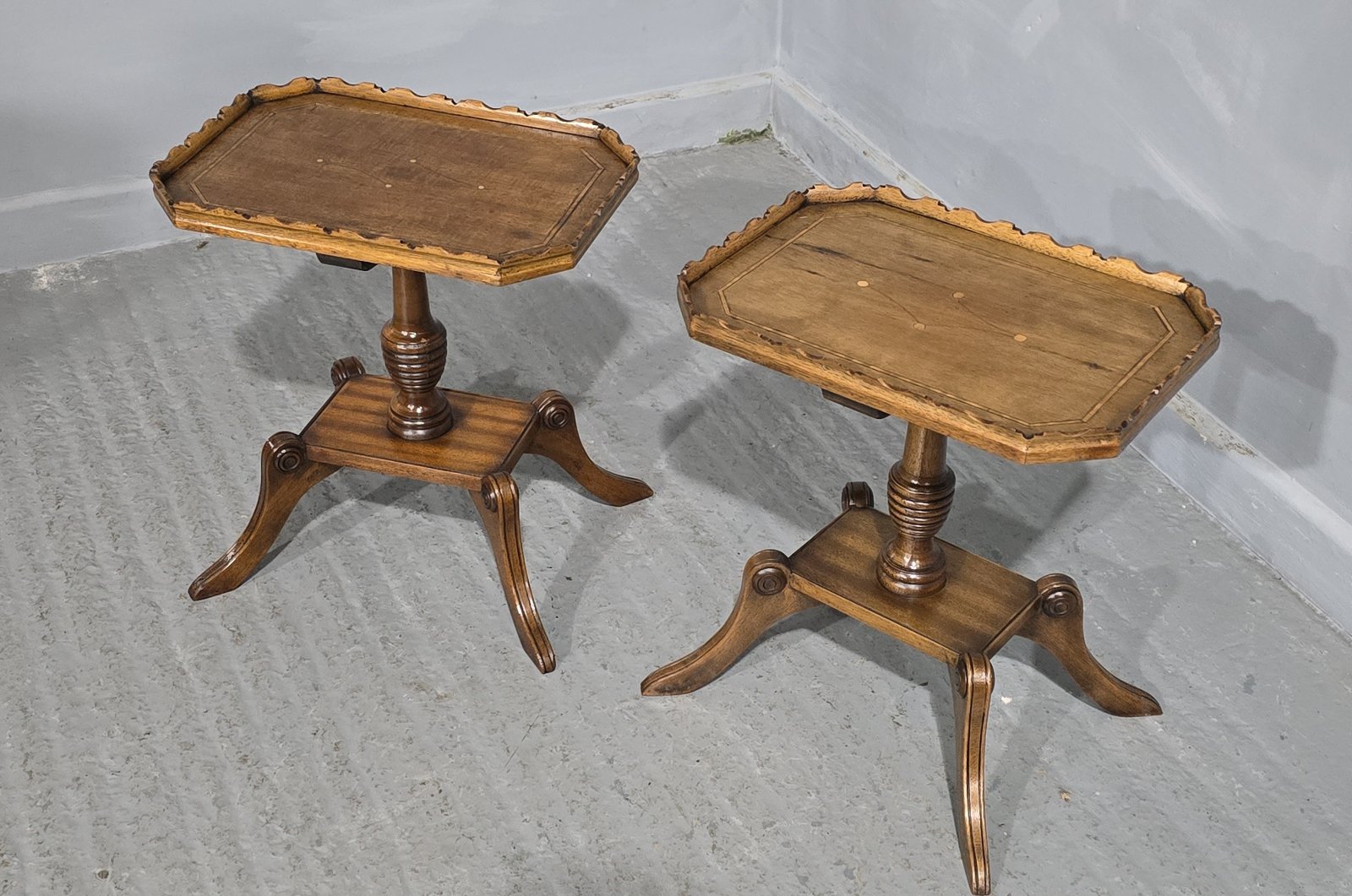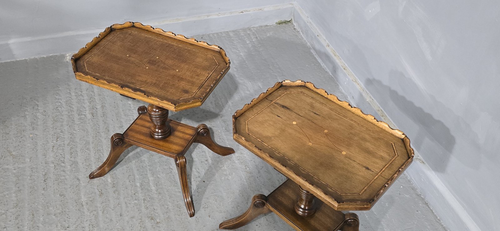 Very nice pair of English walnut wine tables with inlaid tops, slight difference in colour, but in excellent overall condition.