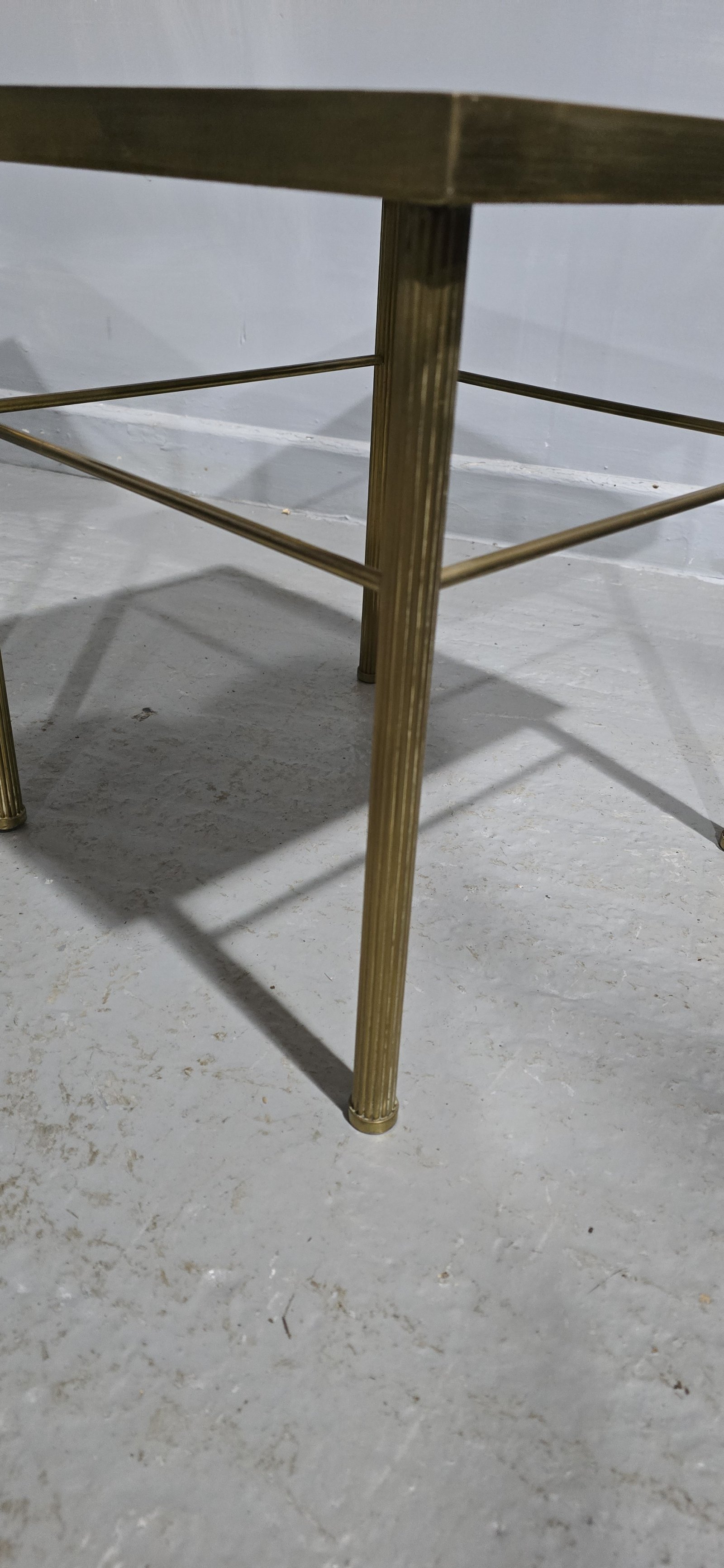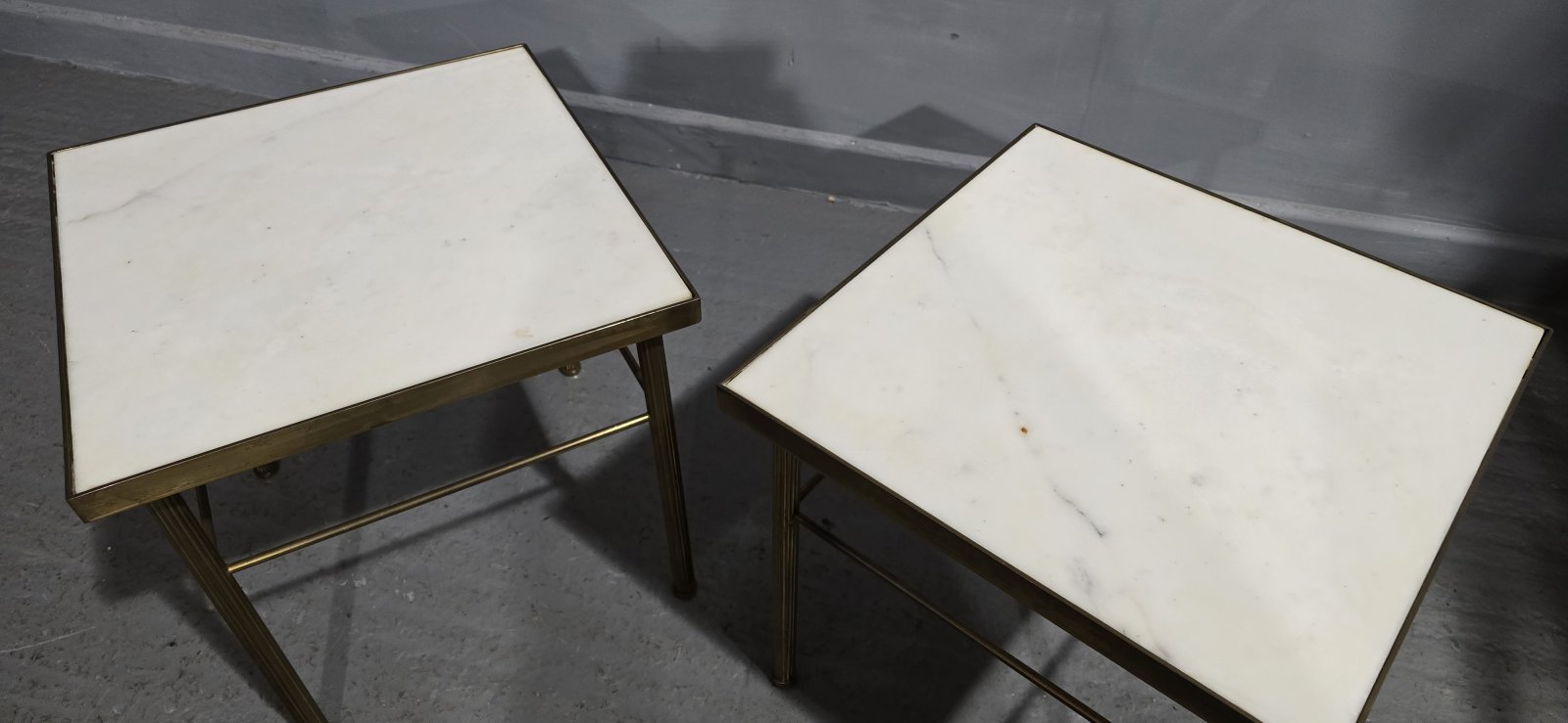 A very good pair of French heavy brass and white marble topped end or lamp tables with reeded legs, in overall very good original condition.