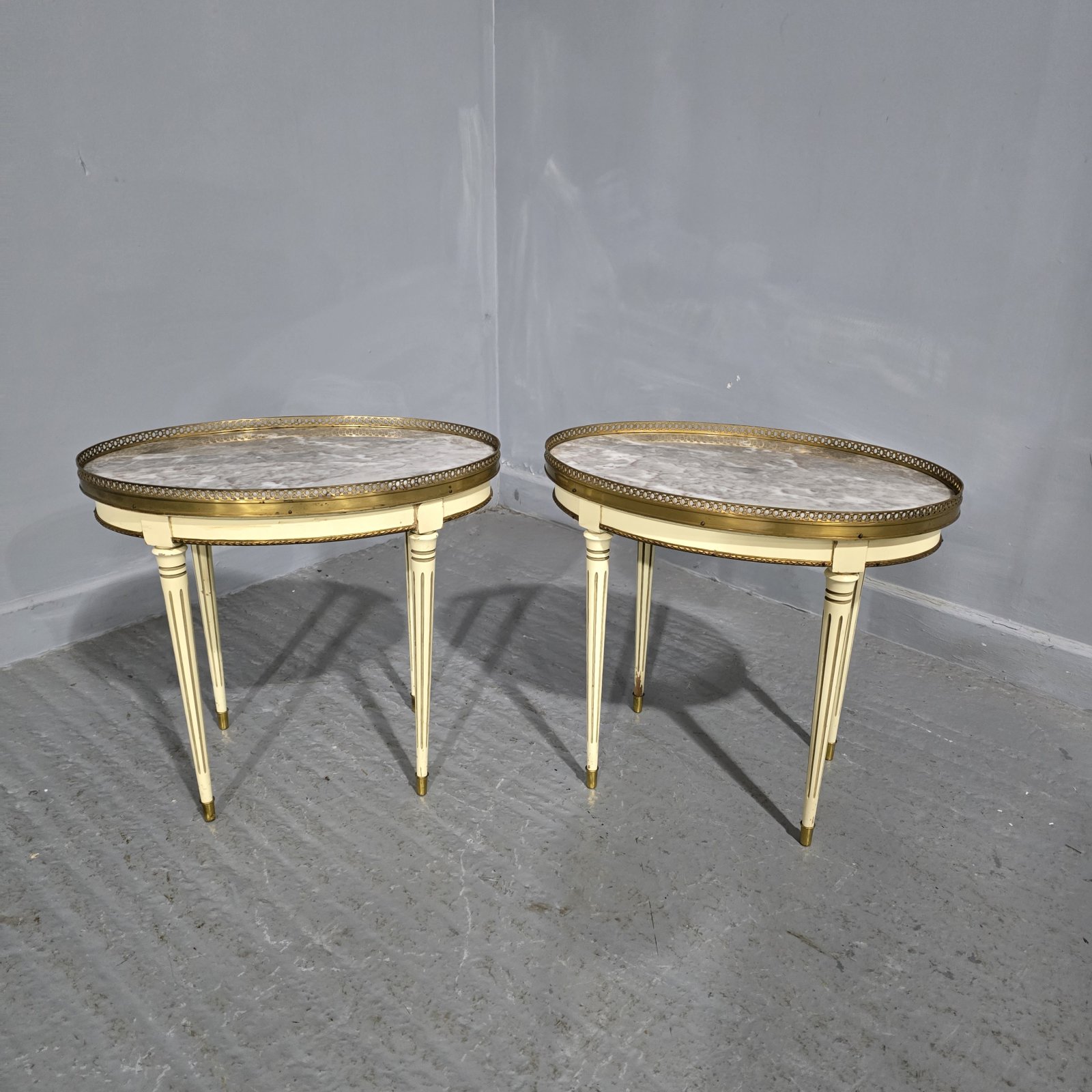 A good pair of French painted lamp tables with grey verigated marble tops surrounded by brass galleries, brass tipped legs, in overall very good condition.
