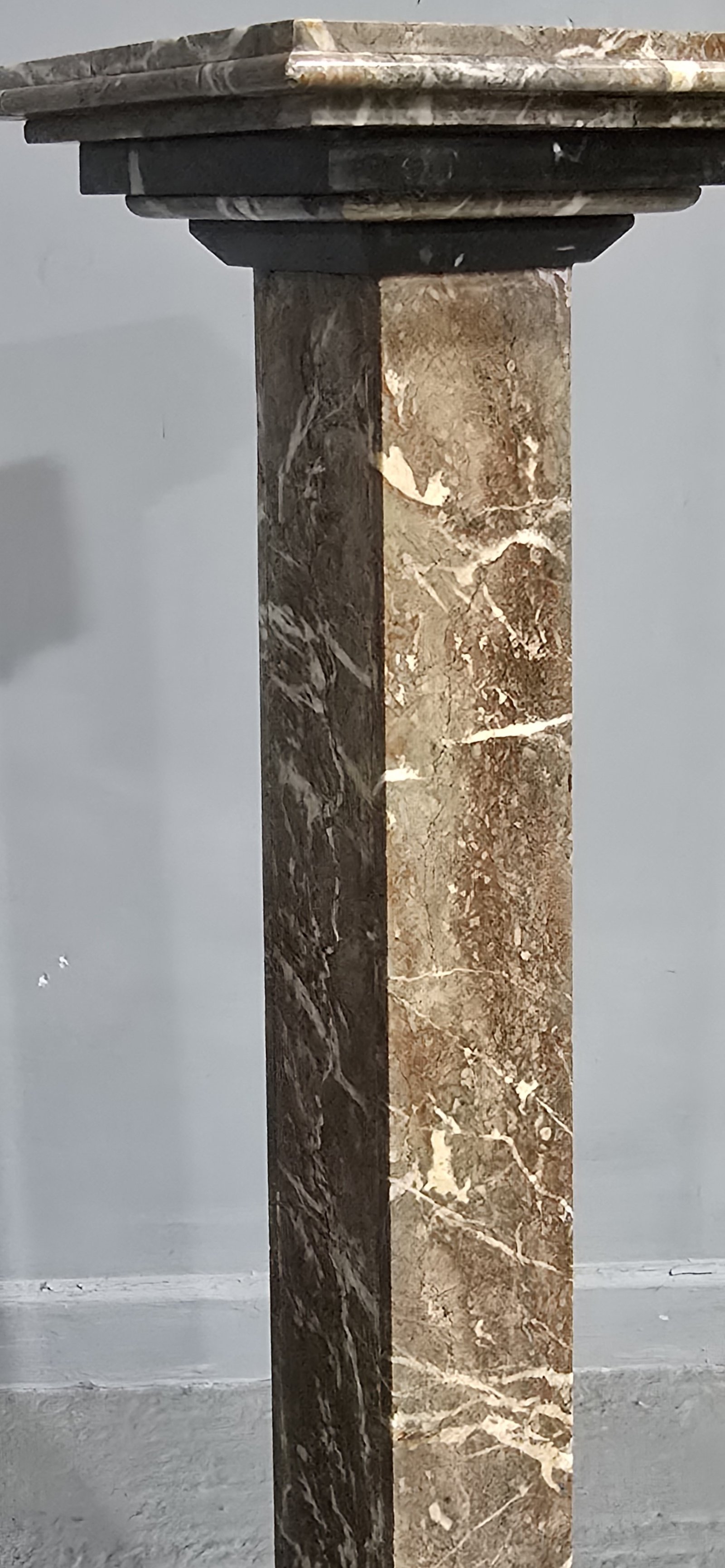 A pair of early XXth century rouge marble columns, each having square top for display above a stepped collar and tapering pedestal terminating in heavy square plinth base. This antique pair of columns is in home ready condition. c1910