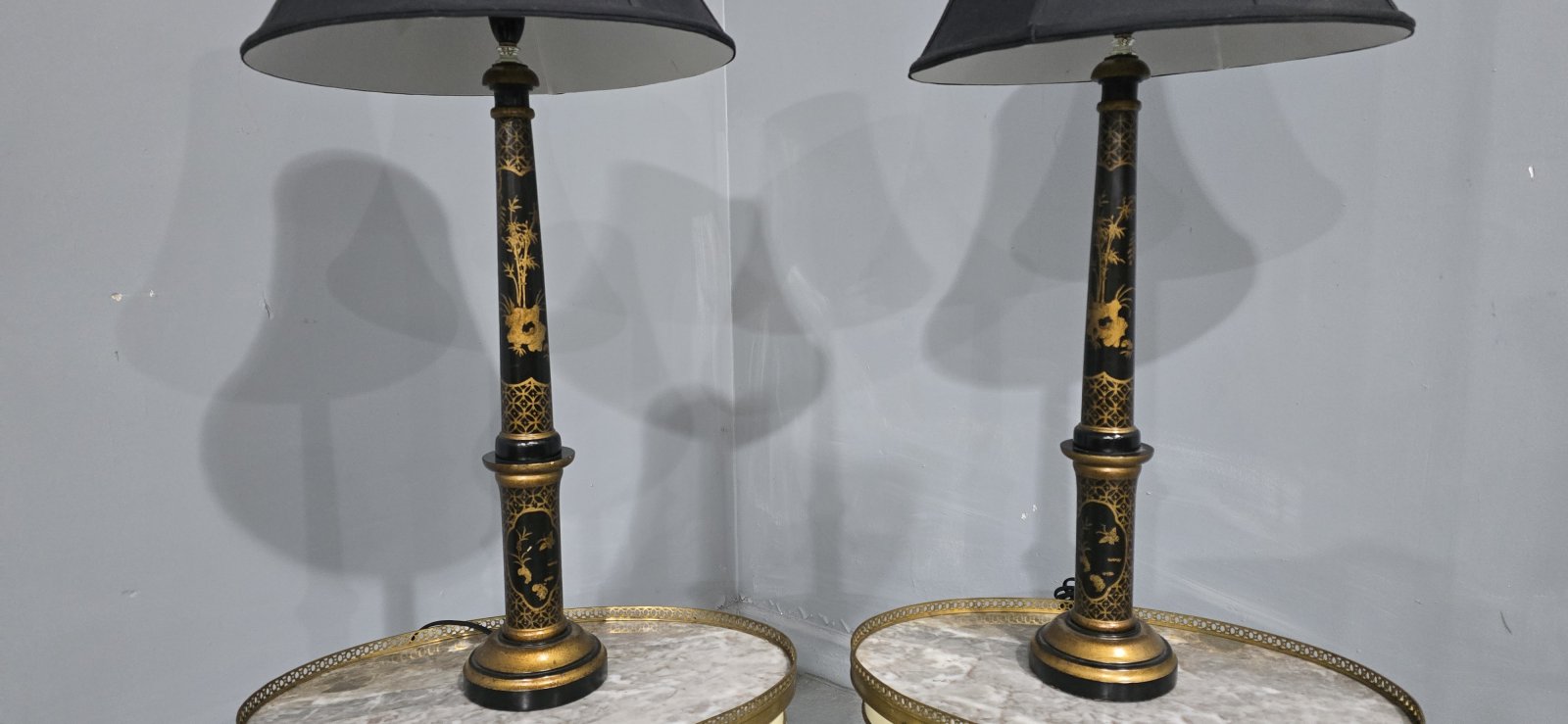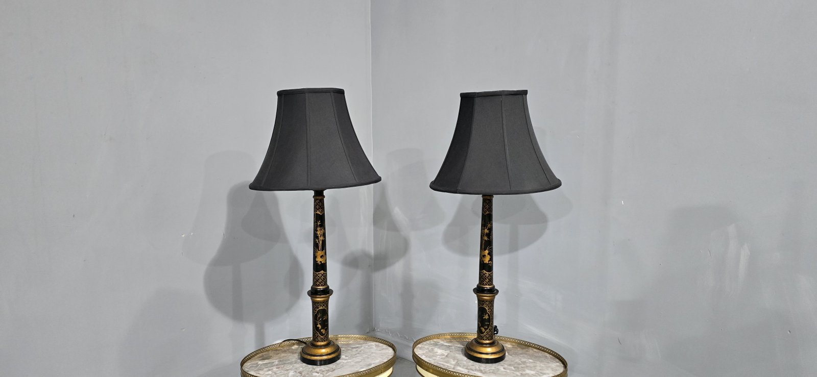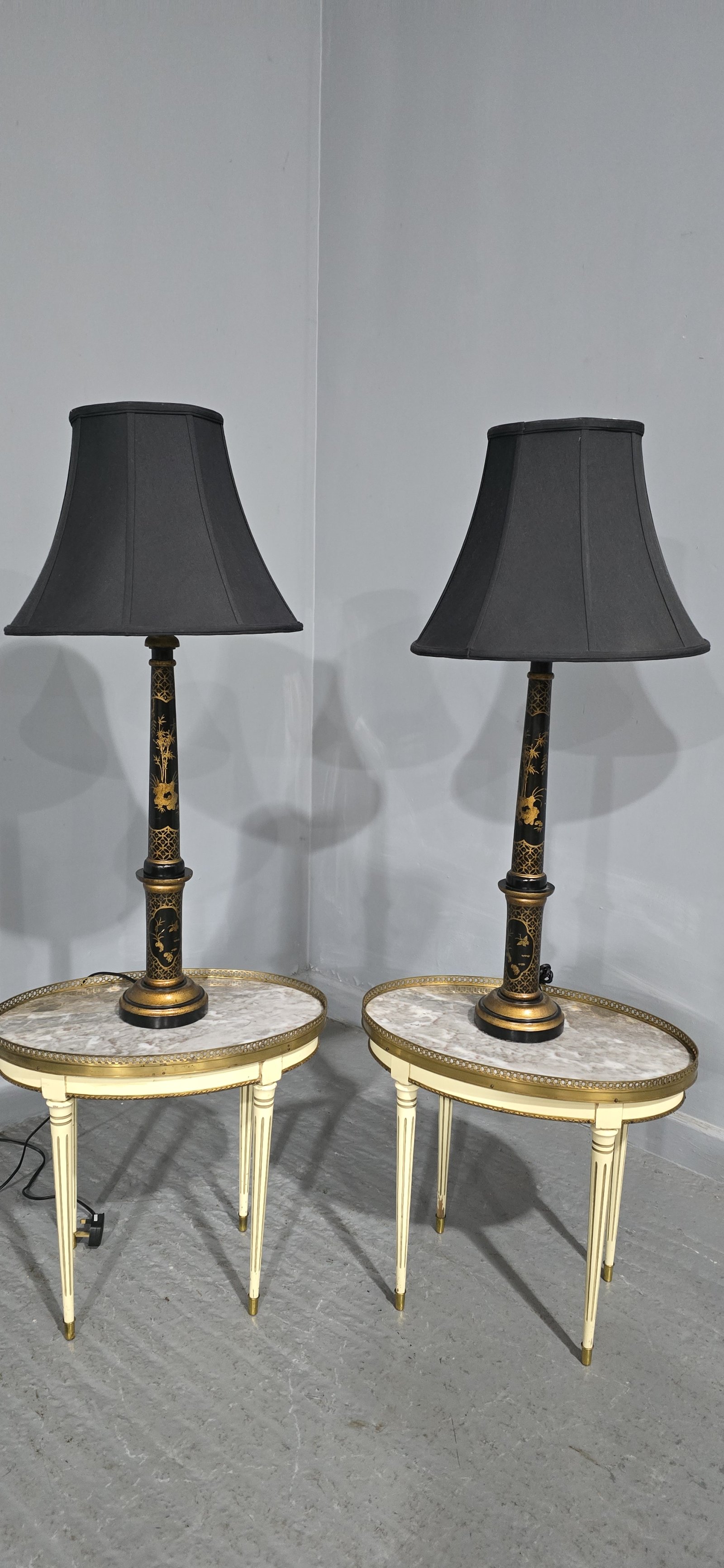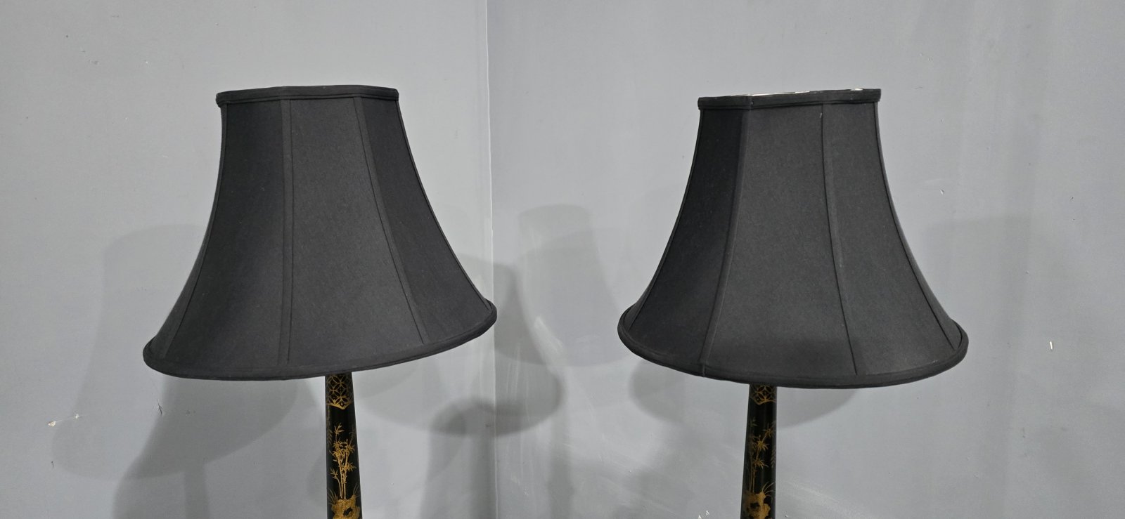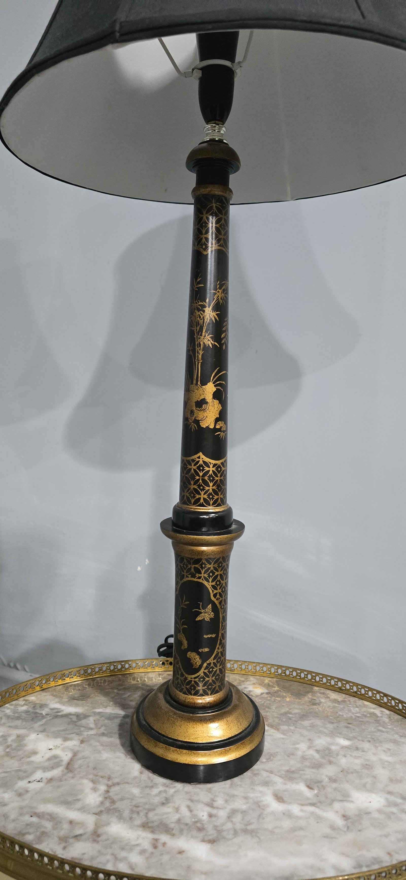 Very good pair of black laquered and gilded tall table lamps with black shades (optional), in very good original condition.