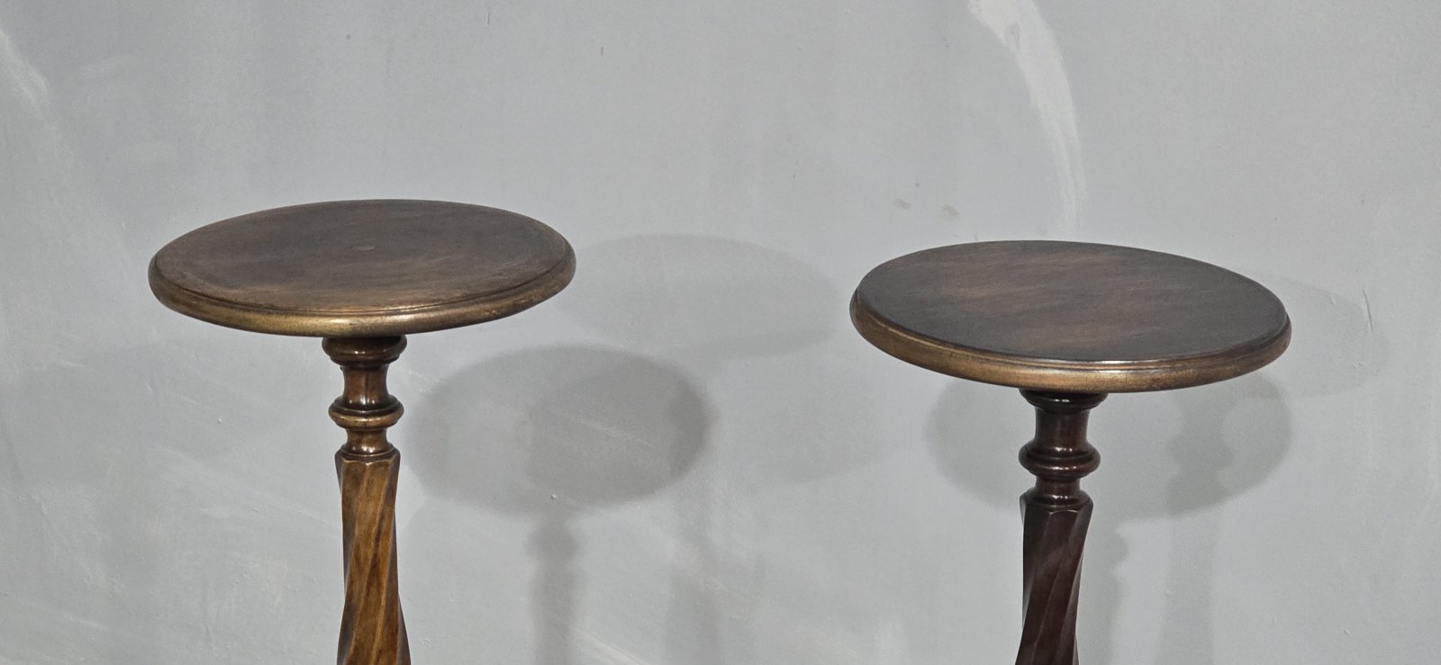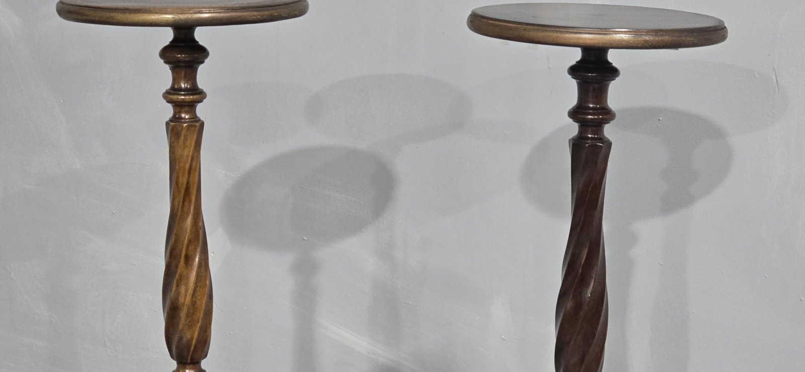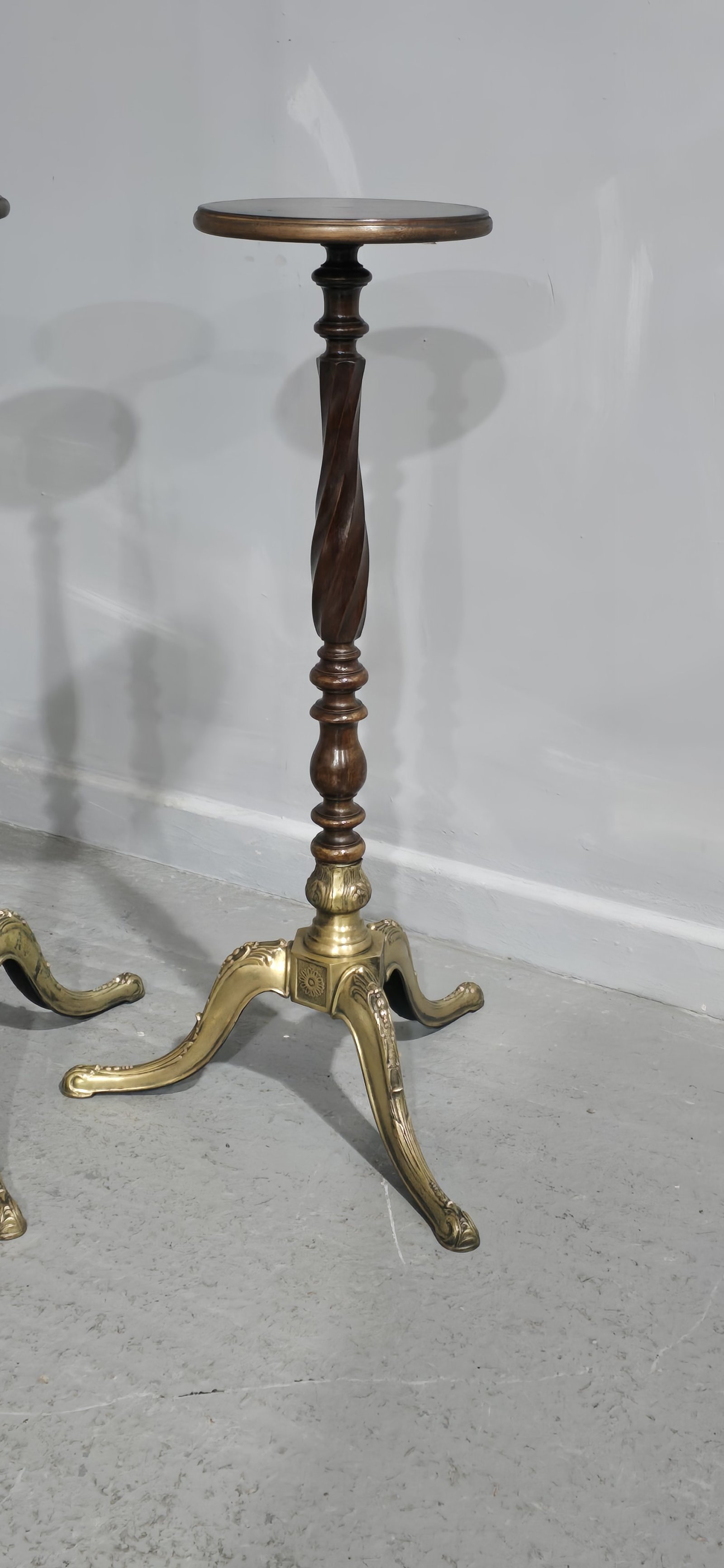 See shipping detailsA very good pair of twisted mahogany torchere stands with brass three leg base, in overall excellent condition.