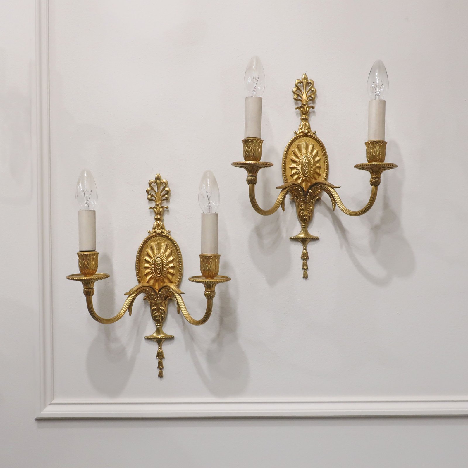 A very good quality pair of English Adam style, twin arm, gilt bronze wall lights dating from the early 20th century. The lights have beaded detail to the oval backplates and honeysuckle motif to the top, with cascading bells flowers. The two curved reeded arms feature foliate design, and terminate to leaf design bobeche trays and cups.