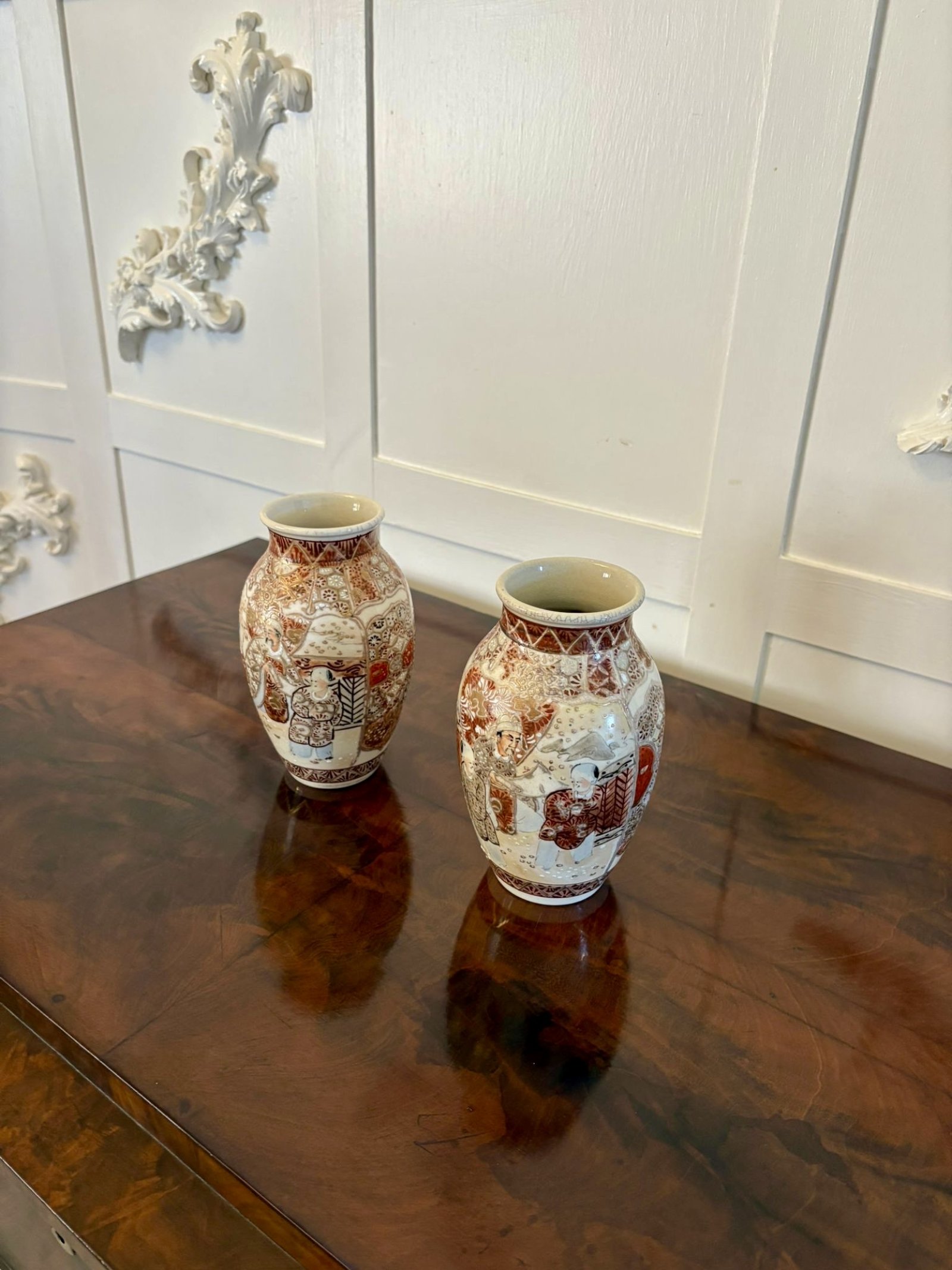 Pair of antique Edwardian quality satsuma vases having wonderful hand painted panels in red, gold, blue and white decorated with wisemen.