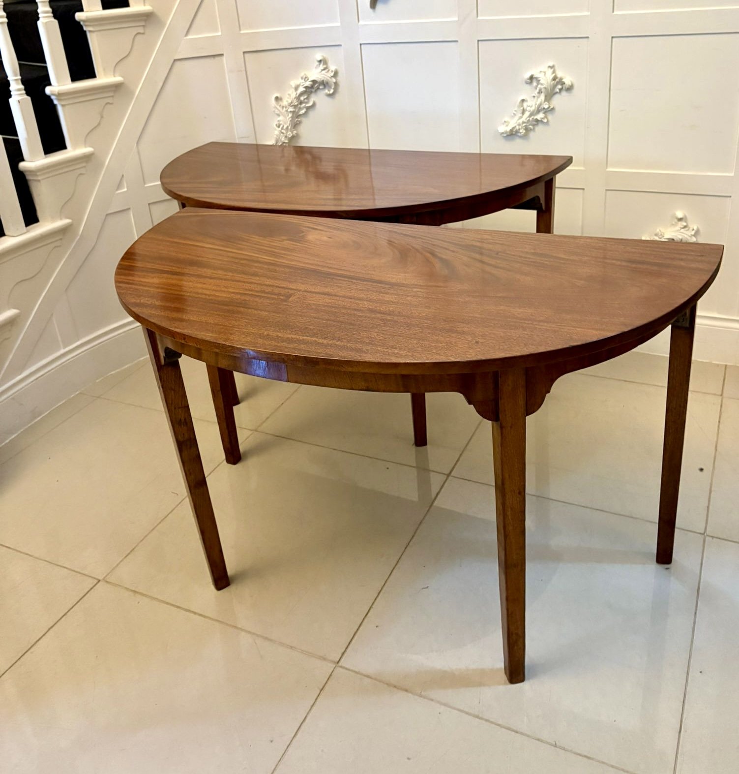 Pair of antique George III quality figured mahogany shaped demi lune console tables having a quality figured mahogany demi lune shape top, mahogany frieze with elegant shape bracket supports standing on a square tapering leg.