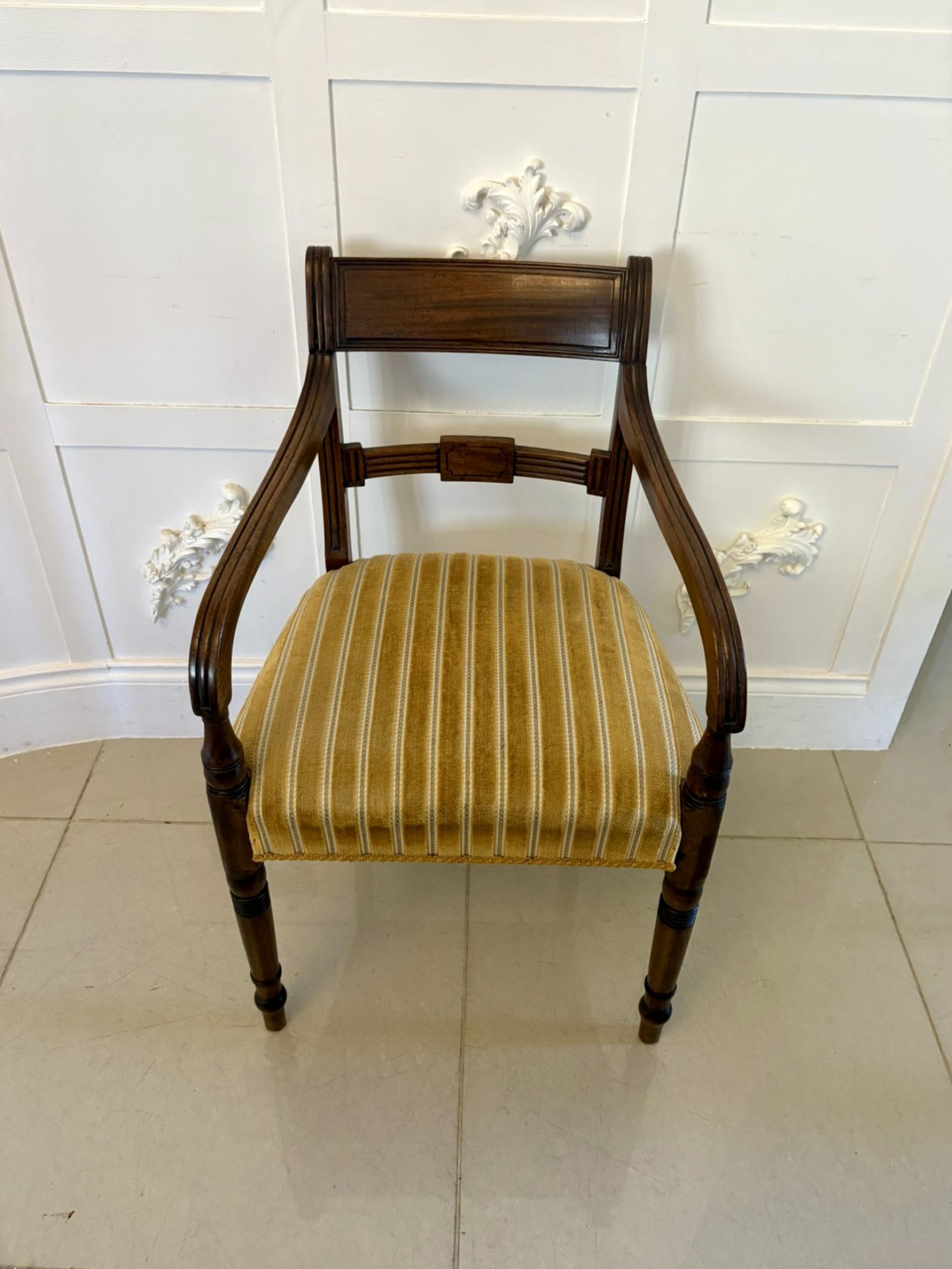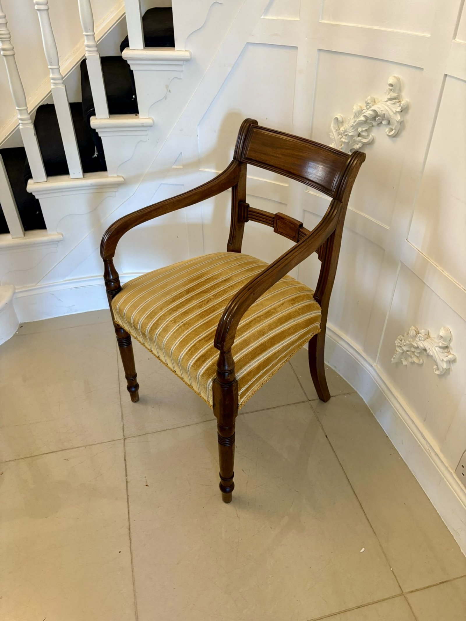 Pair of antique George III quality mahogany desks chairs having a mahogany shaped reeded top rail and centre splat, shaped reeded open arms with turned supports, upholstered seats in a quality fabric standing on elegant turned tapering legs to the front and out swept back legs.