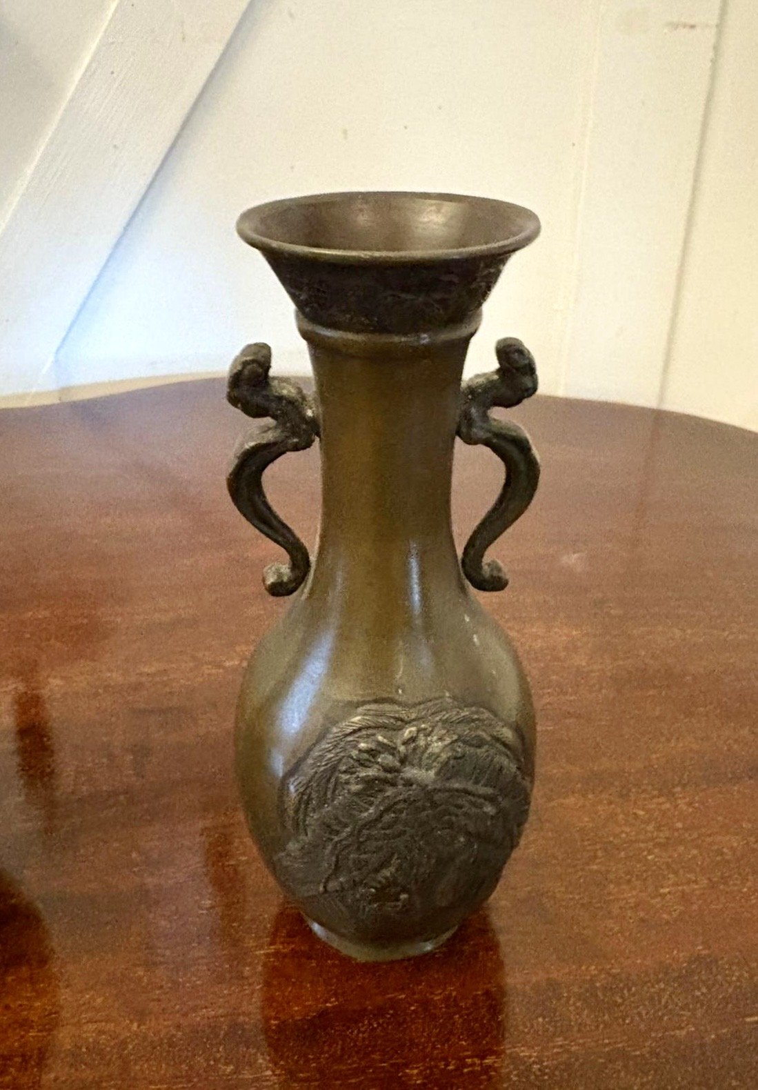 An exquisite pair of Japanese Meiji-period bronze vases beautifully cast and finely detailed. Each vase displays an elegant baluster silhouette enriched with crisply modelled foliate relief panels and adorned with sculptural mythological beast handles—classic hallmarks of refined Meiji craftsmanship.