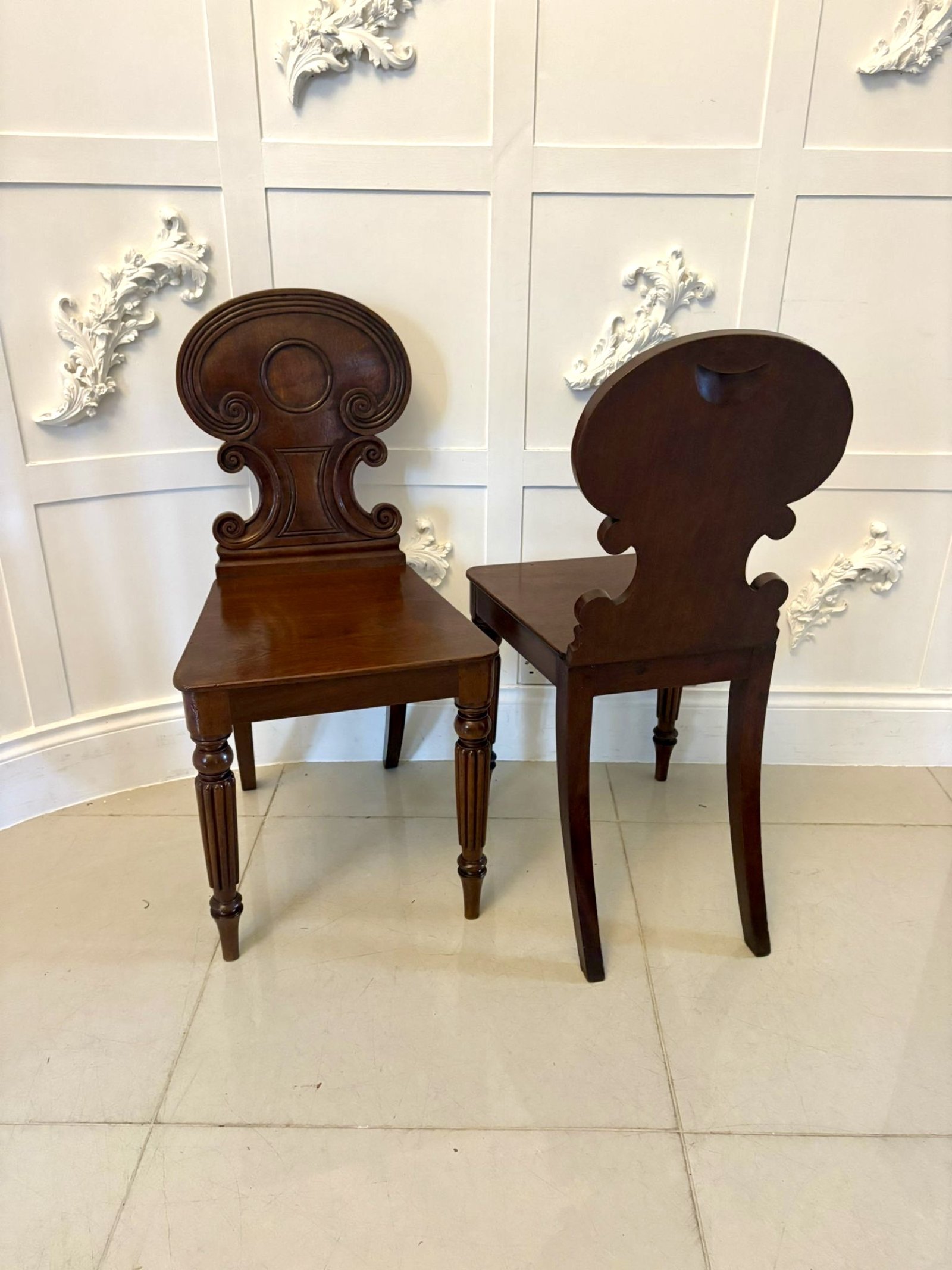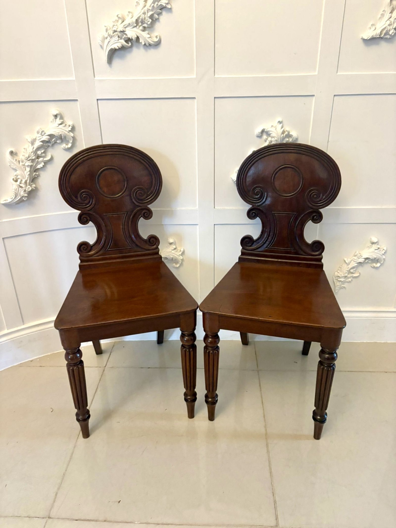 Pair of antique Regency quality carved figured mahogany hall chairs having quality carved figured mahogany shaped backs with reeded carved scrolls, solid figured mahogany seats standing on turned reeded tapering legs to the front and out swept back legs.