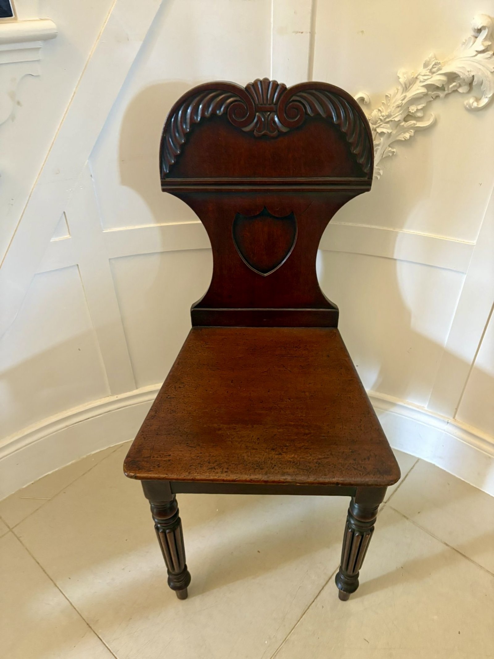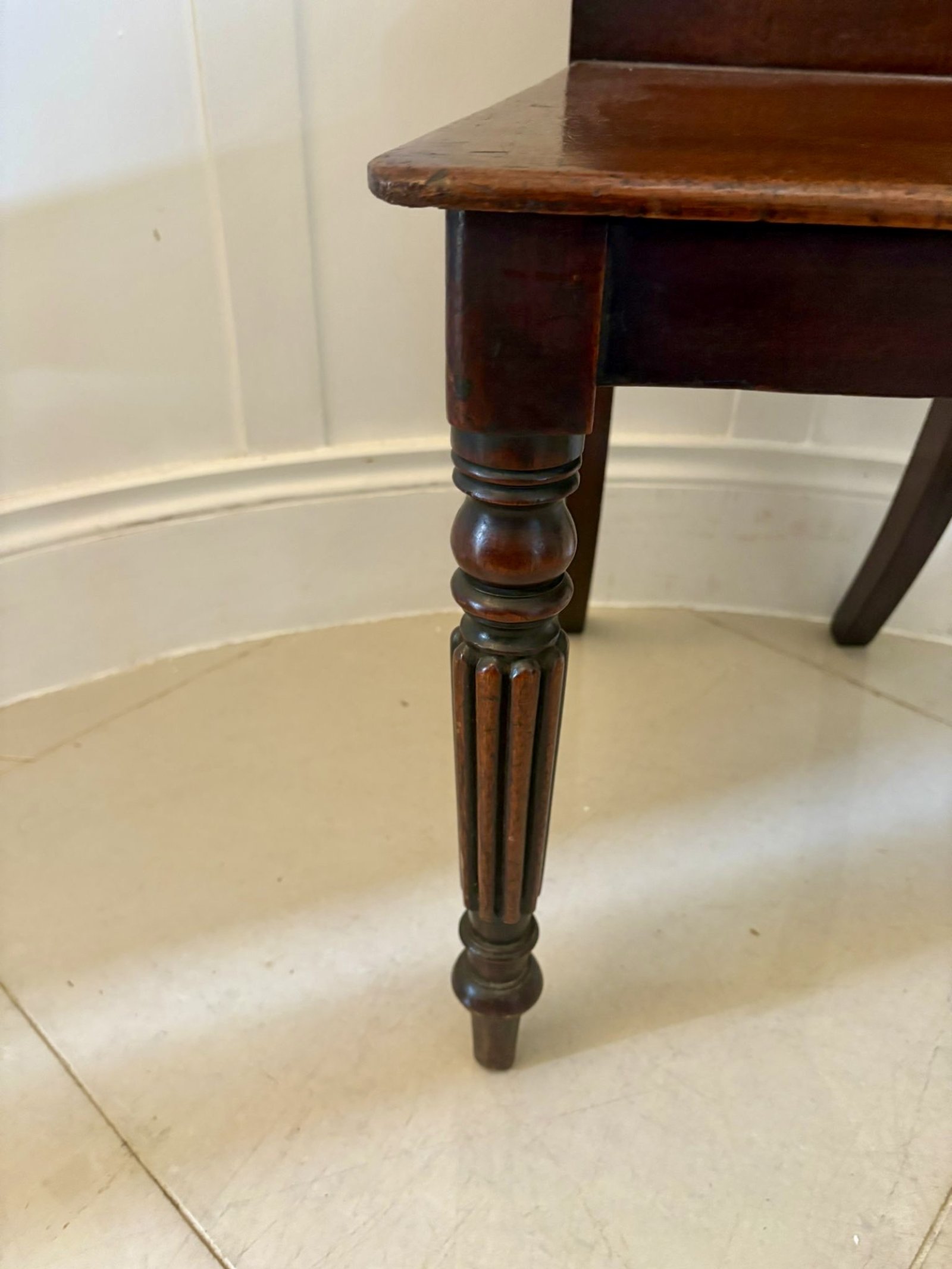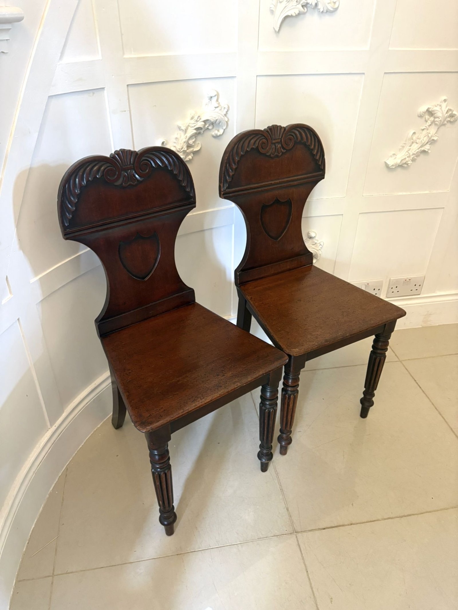 Pair of antique regency quality carved mahogany hall chairs having a quality carved mahogany shaped back, solid mahogany seats standing on elegant turned reeded tapering legs to the front and out swept back legs.
