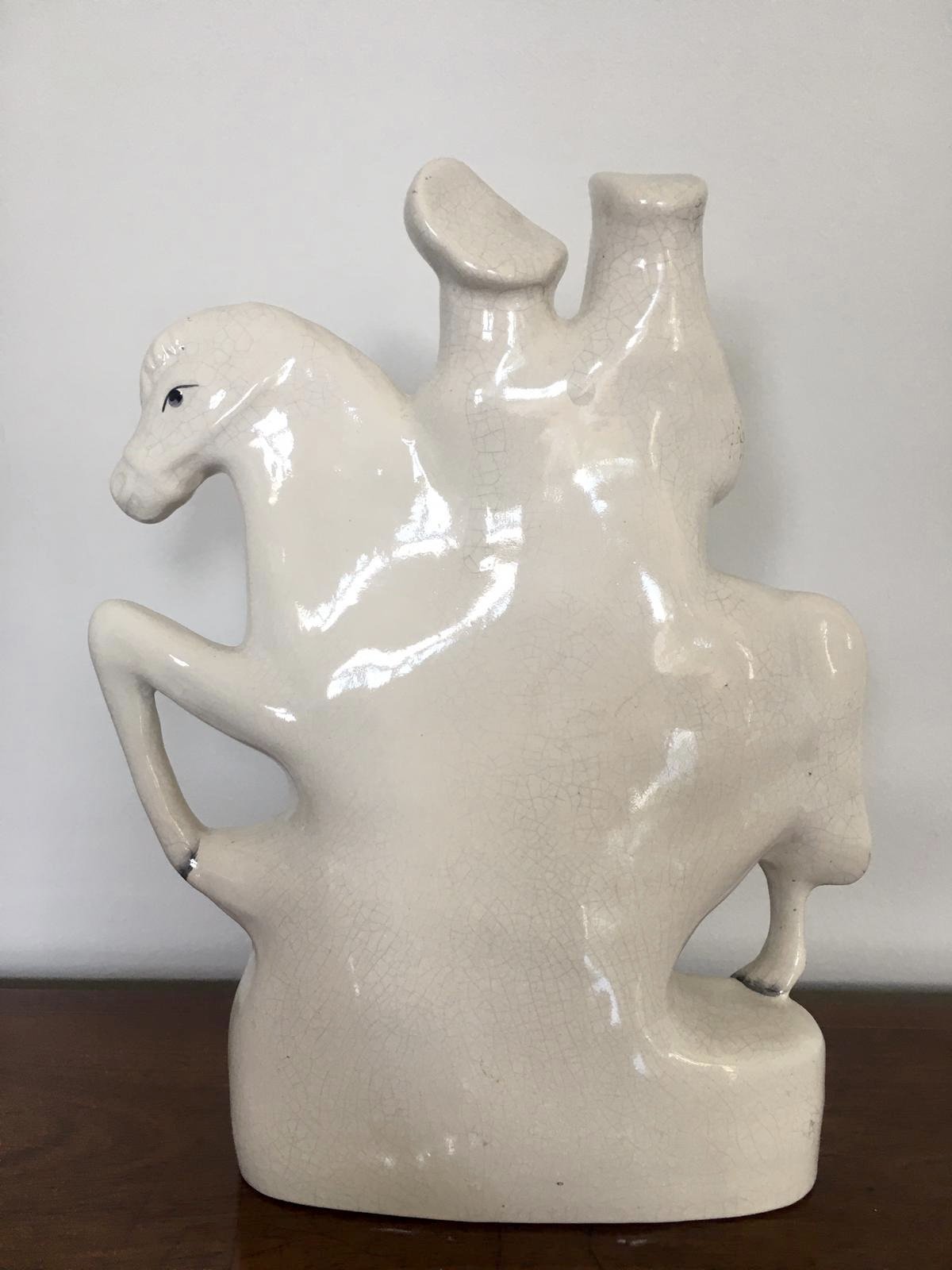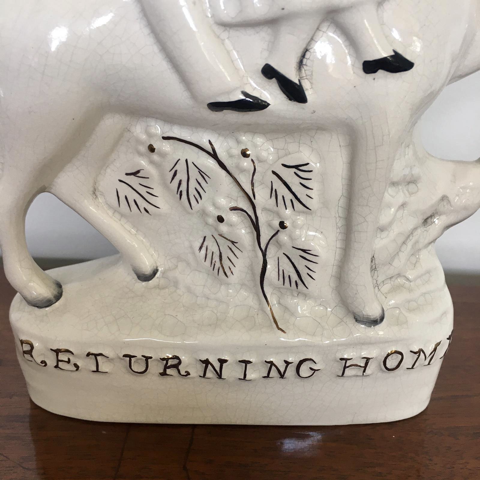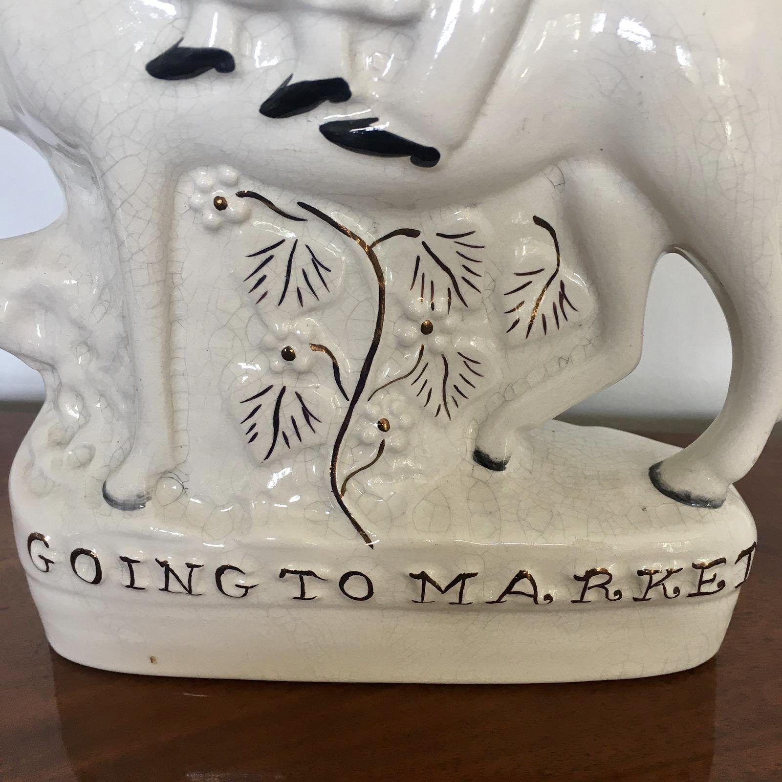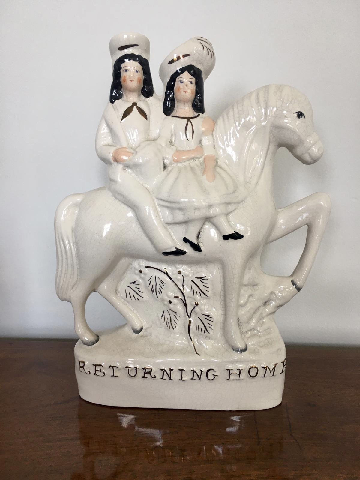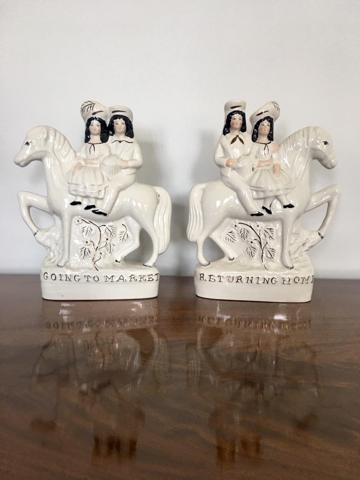 Pair of antique Staffordshire flat back figures being a ‘going to market’ subject and ‘returning home’, male and female horse riding pair in period costume sitting on a white horse surrounded by gold leaf decoration and gold leaf writing to the bases.