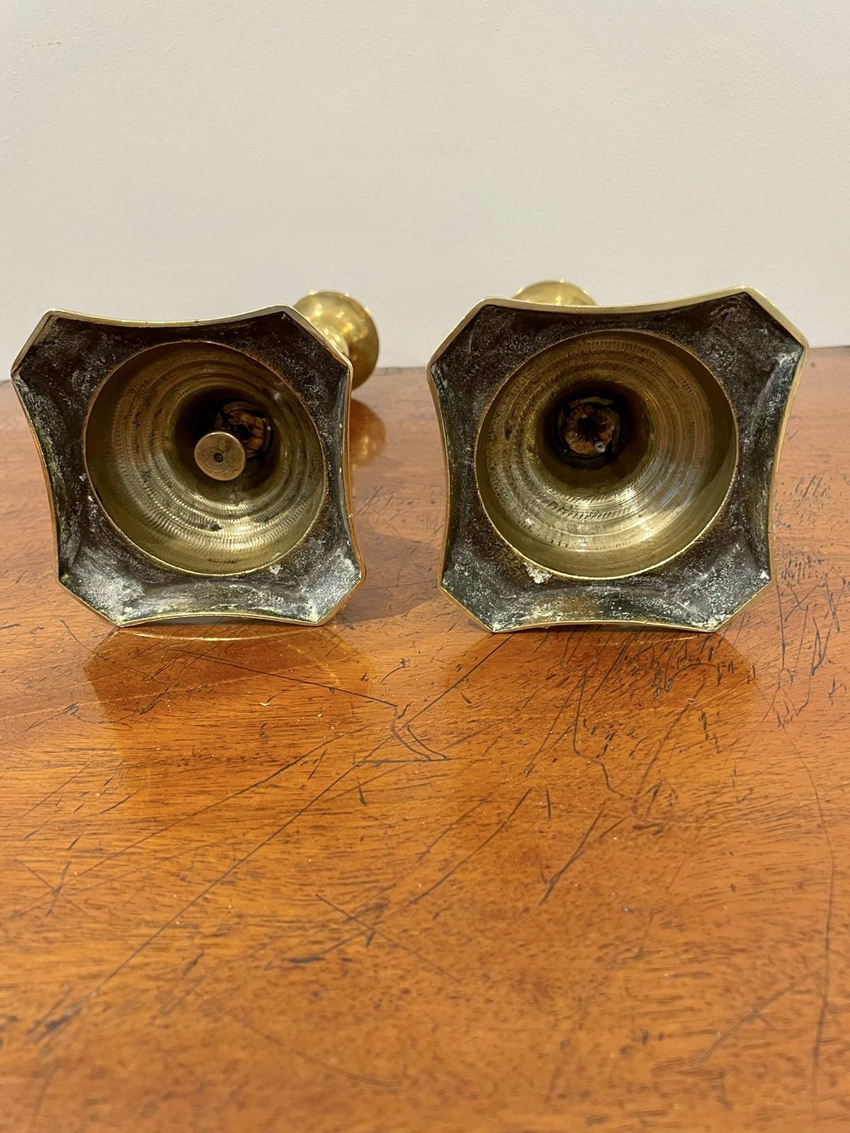 Pair of antique Victorian brass candlesticks having circular tops above a turned shaped column raised on a stepped shaped base