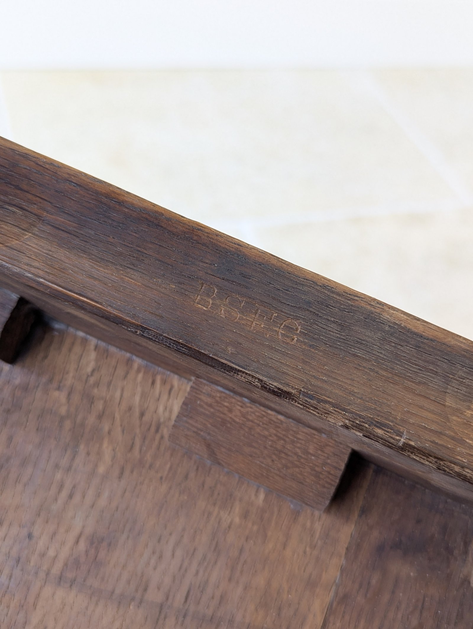 Both chairs are stamped ‘BSFC’ to the underside, maker unknown. Presented in very good antique condition with only some light age related surface wear. One chair features a nice old repair to the front edge as shown. Both chairs are structurally sound with no movement and a clean finish, ready to place in the home.