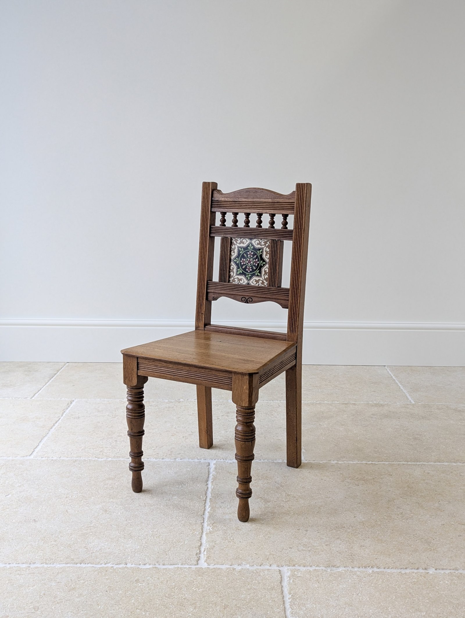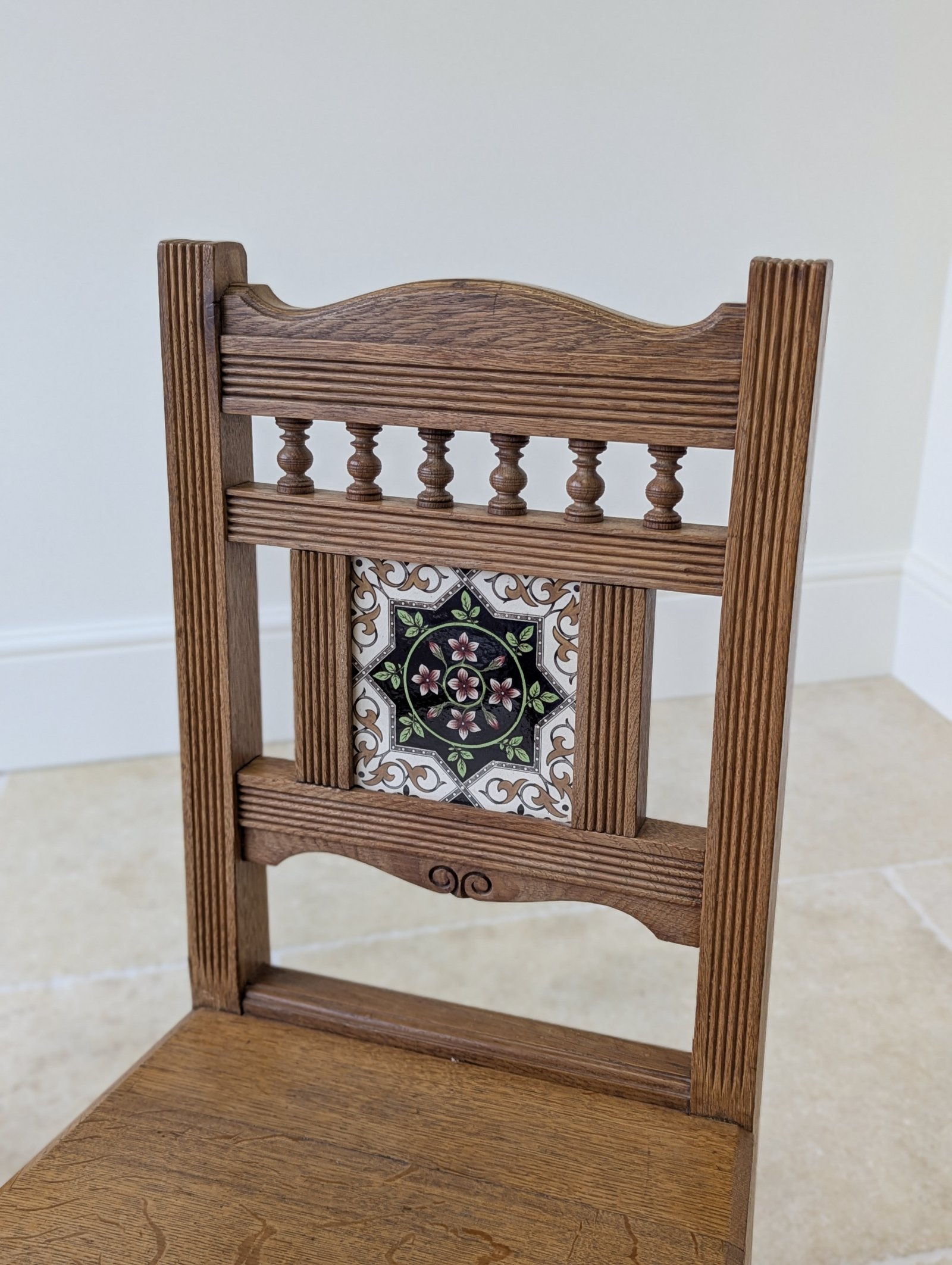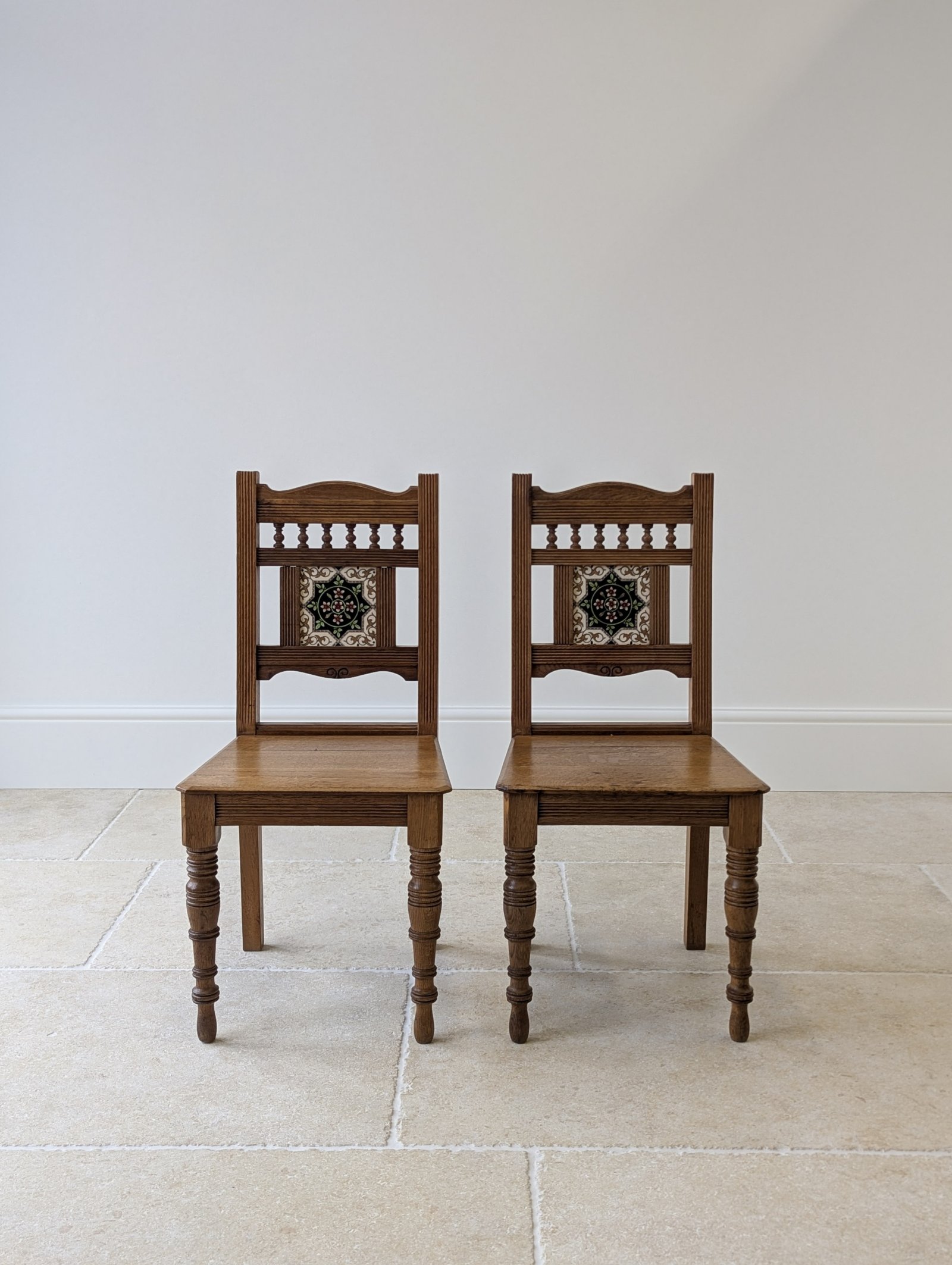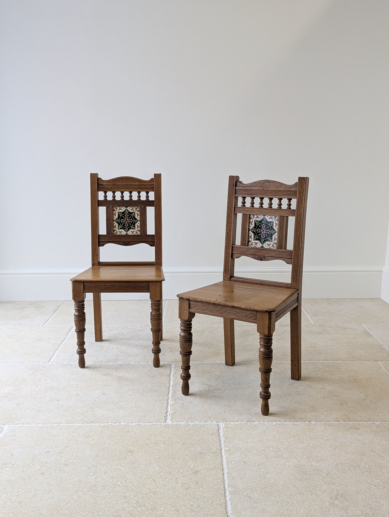 An attractive pair of late Victorian oak side chairs featuring decorative ceramic tile inserts to the backrests, constructed in solid oak with turned front legs and a shaped crest rail above a bobbin-turned gallery.