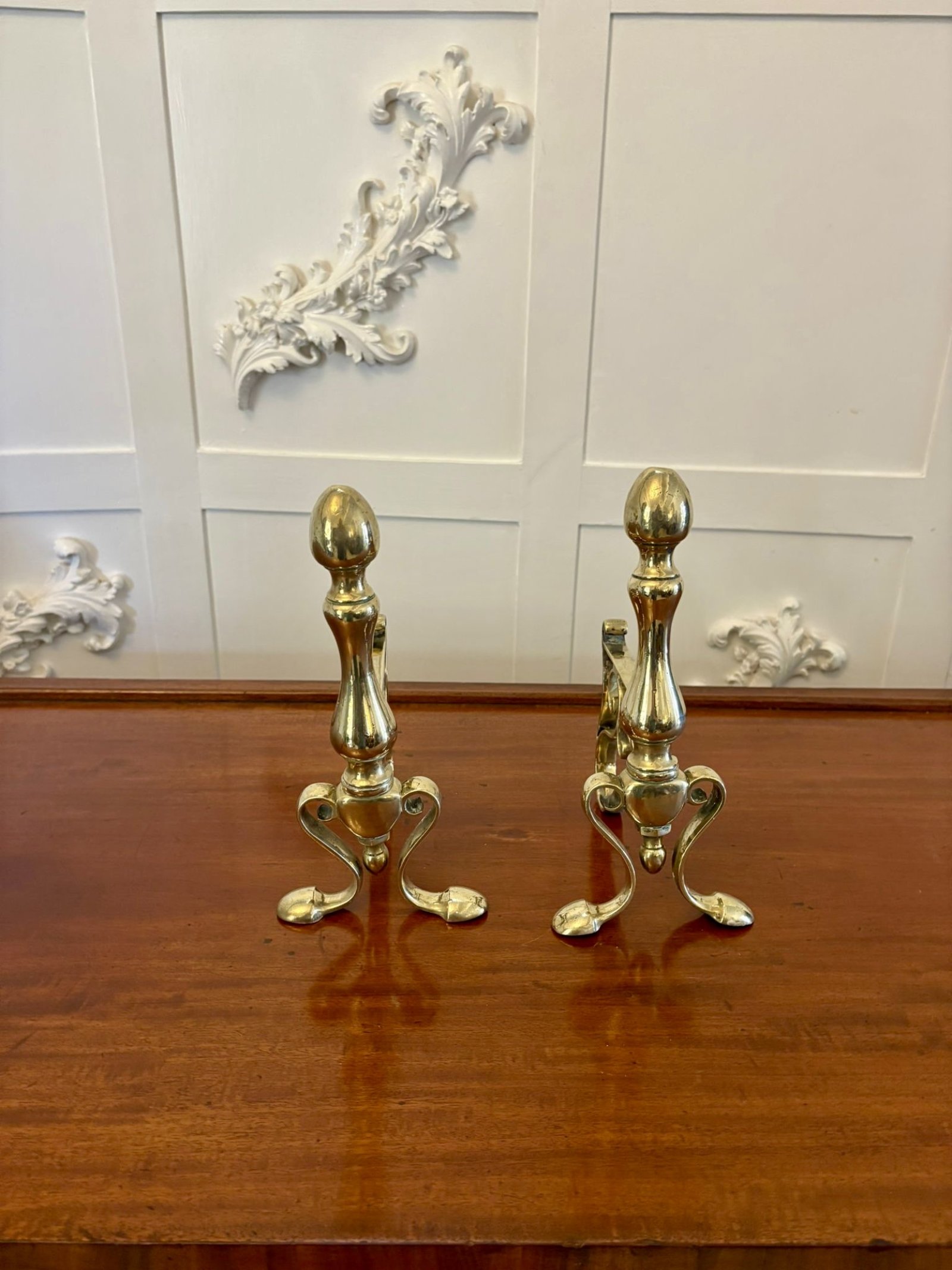 Pair of antique Victorian quality brass fire dogs having a brass turned shaped column with an oval top standing on shaped cabriole legs to the front square leg to the back.