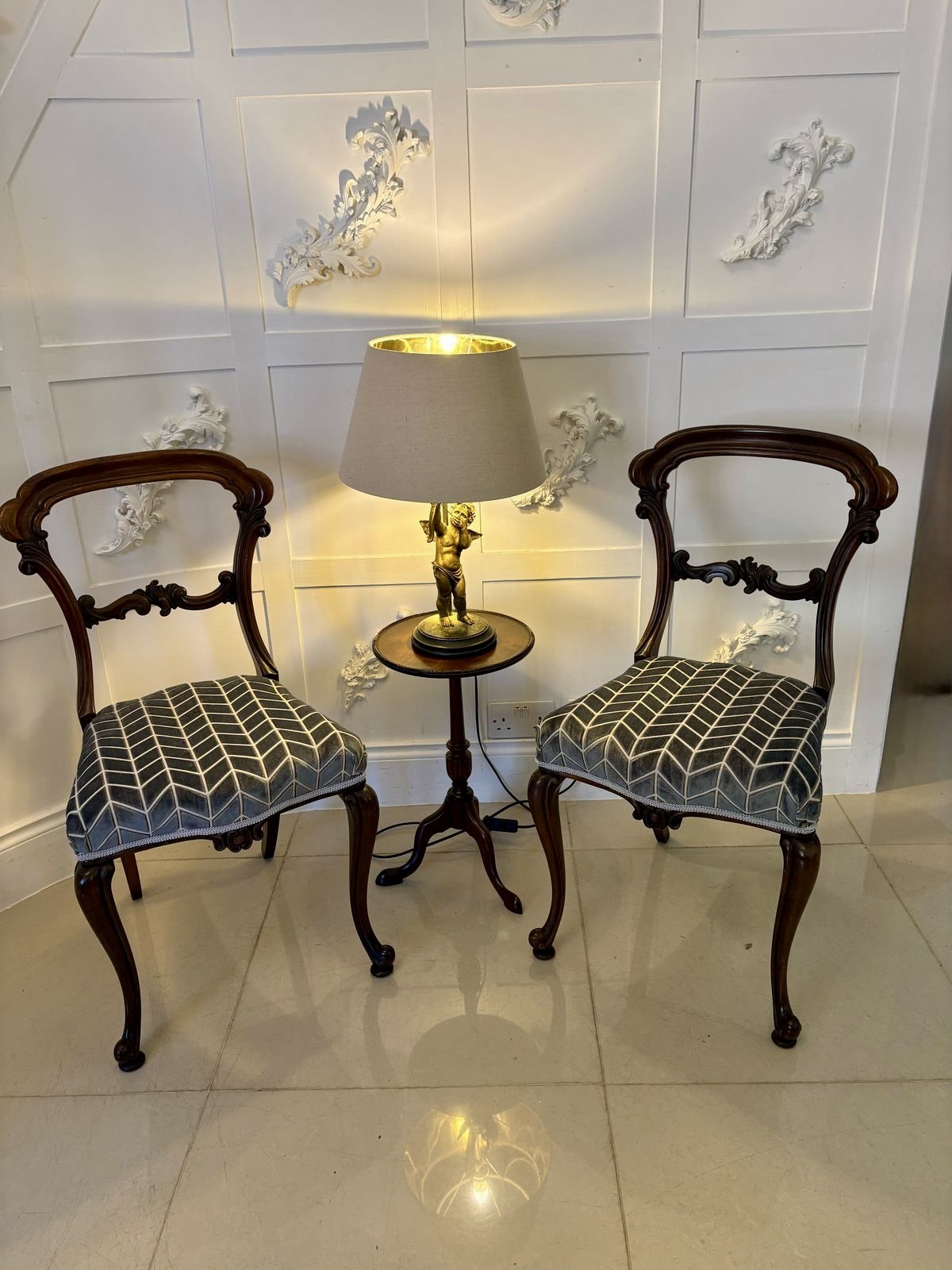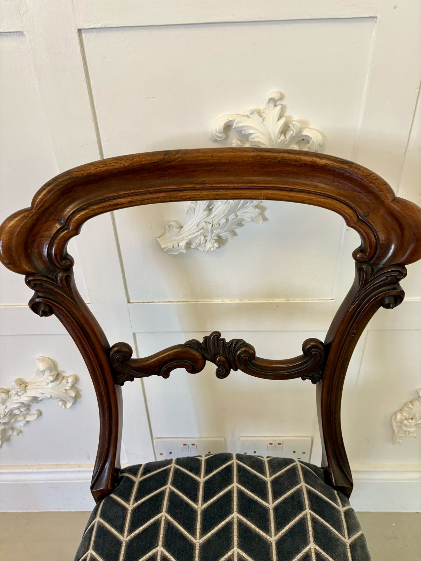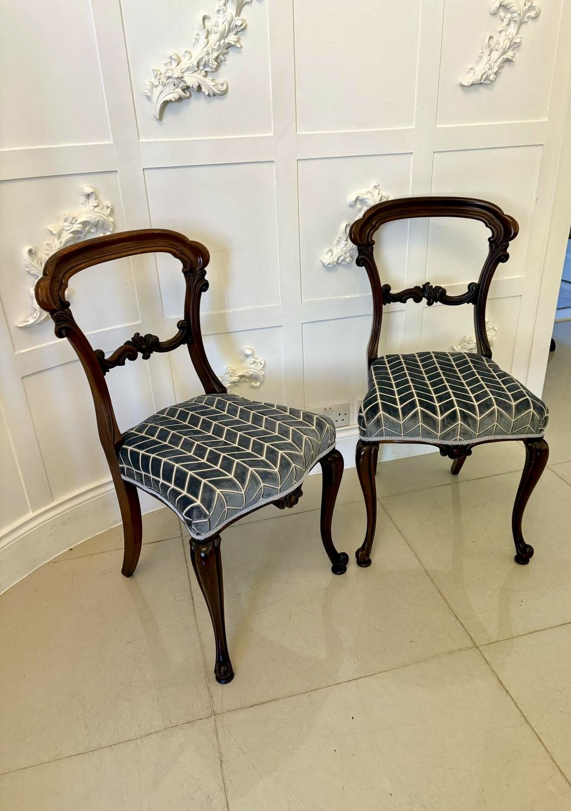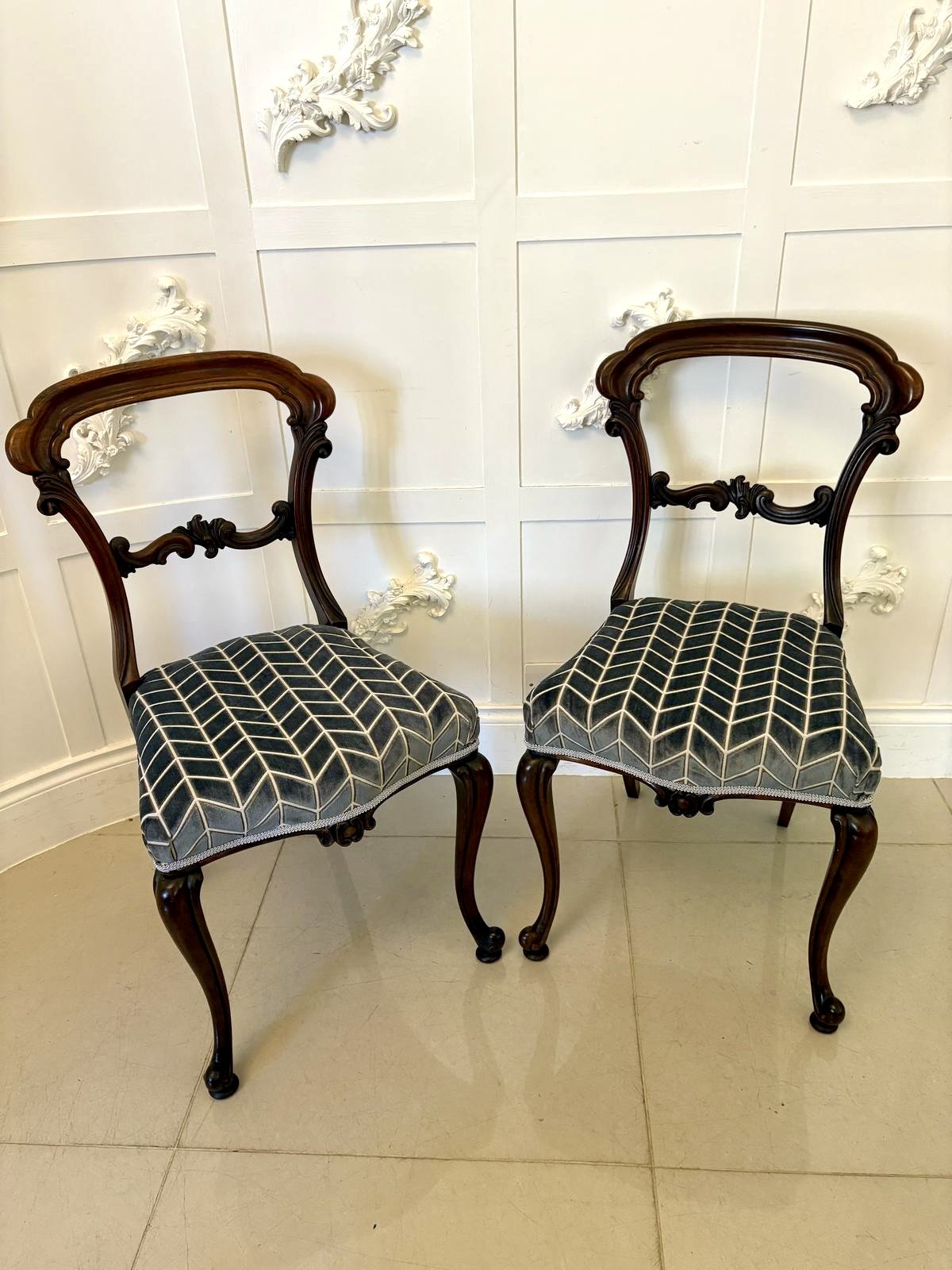 Pair of antique Victorian quality carved rosewood side chairs having a quality carved rosewood balloon back with a shaped carved splat to the centre, newly reupholstered serpentine shape seats in a quality fabric, carved frieze standing on shaped cabriole legs to the front and out swept back legs.