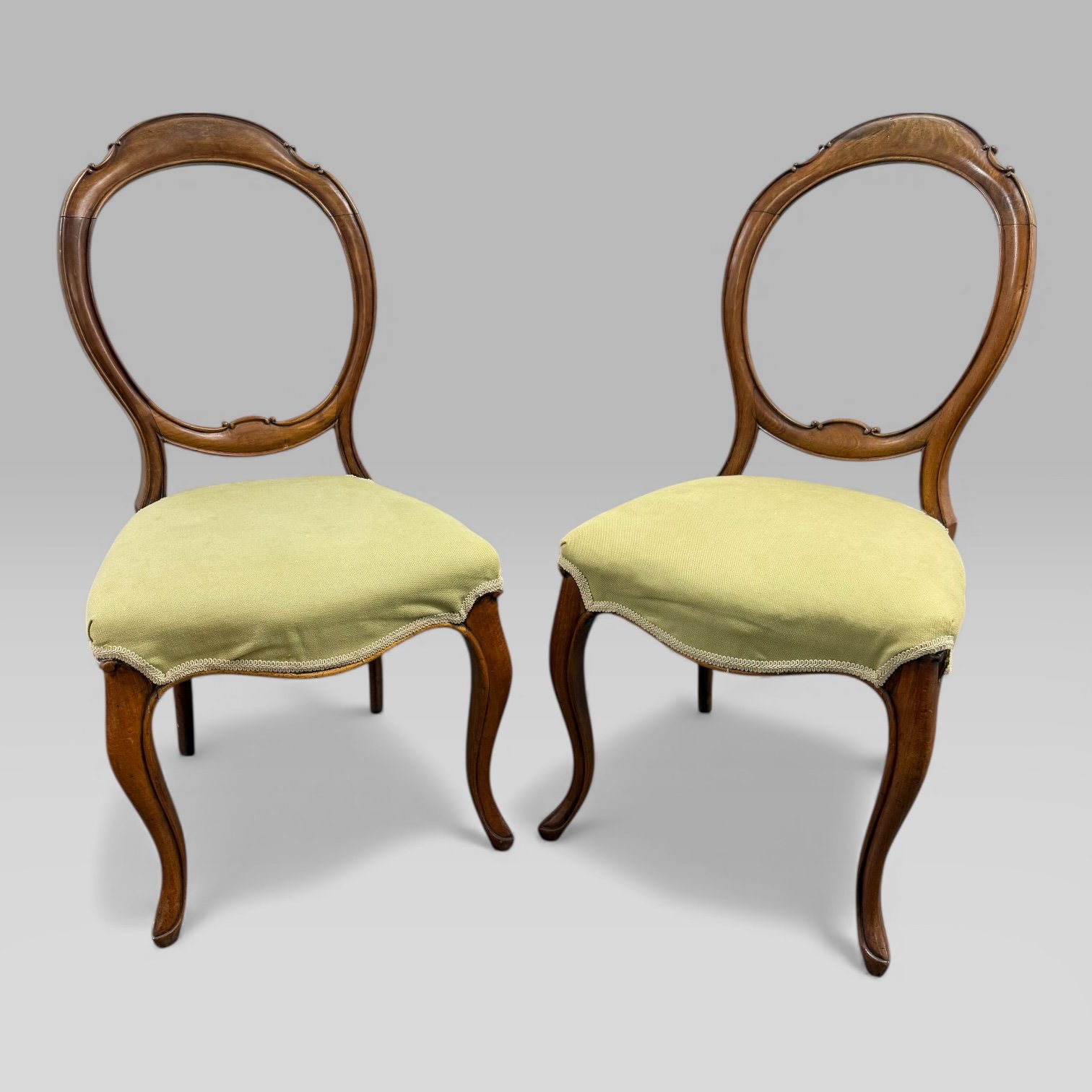 A pair of mid Victorian walnut balloon back chairs, each with cabriole legs and green upholstered seats. The balloon back design and flowing legs are typical of Victorian seating and make the chairs suitable for use as dining chairs or occasional chairs.