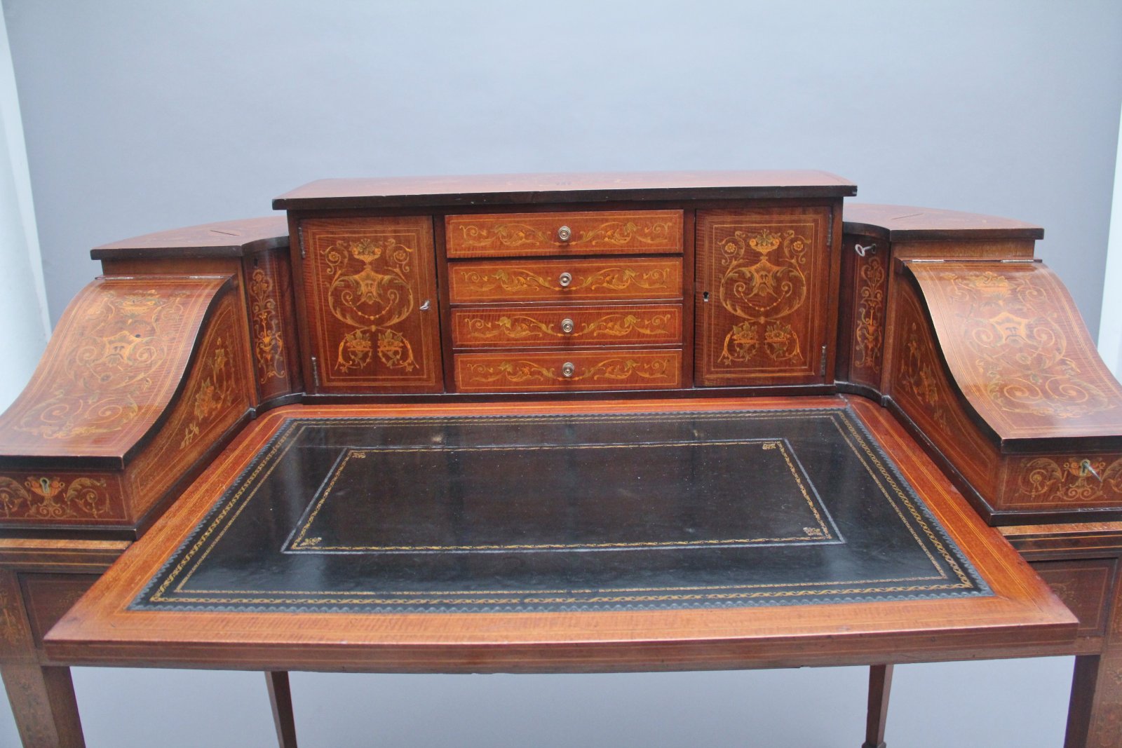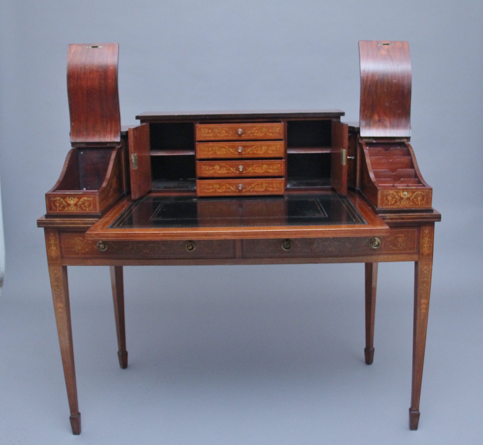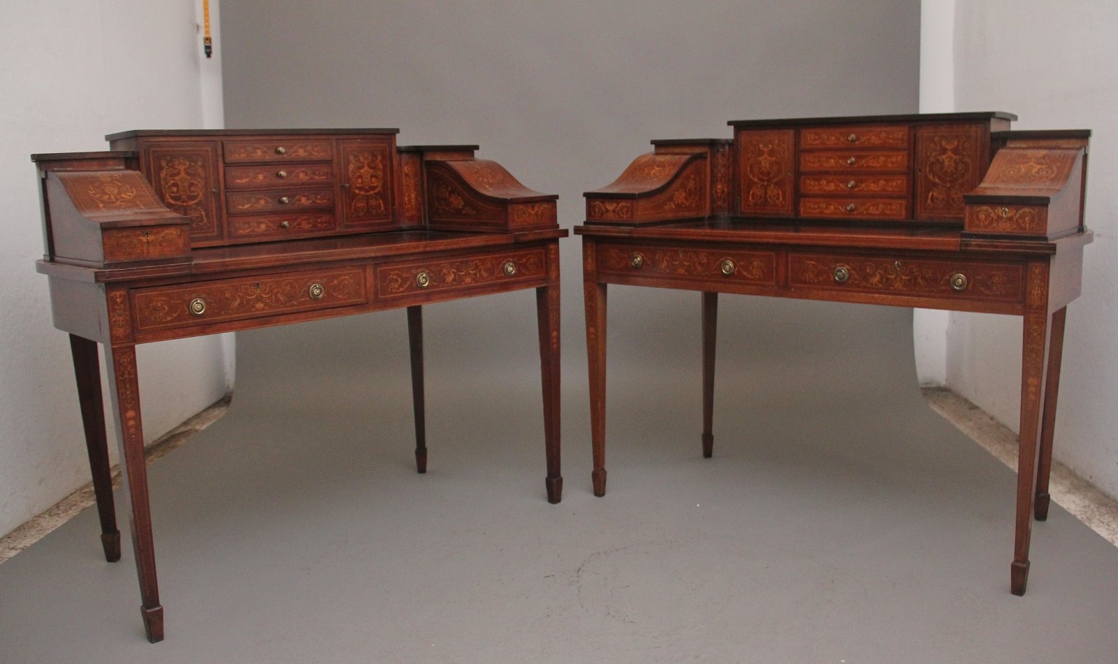A fabulous quality near pair of freestanding early 20th Century mahogany and inlaid Carlton house desk's, both desks having a super structure comprising of four mahogany inlaid drawers at the centre with original brass turned knob handles, cupboards either side with workable lock and key with a single fixed shelf inside, there is a pull out writing slide with a black leather writing surface decorated with blind and gold tooling, stationary compartments either side with lift up lids to reveal a pen tray and various compartments, at each corner there are pull out letter slides with concave fronts and at the top there are letter slots, both letter slides and the lift up stationary compartments also have workable locks and keys. The frieze below having two mahogany lined drawers with original brass ring handles, standing on square tapering legs with with spade feet.