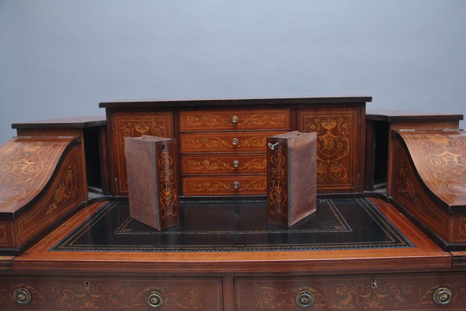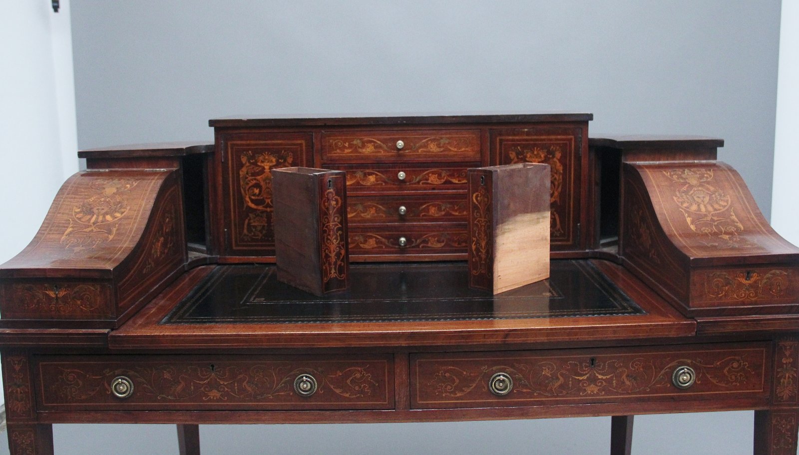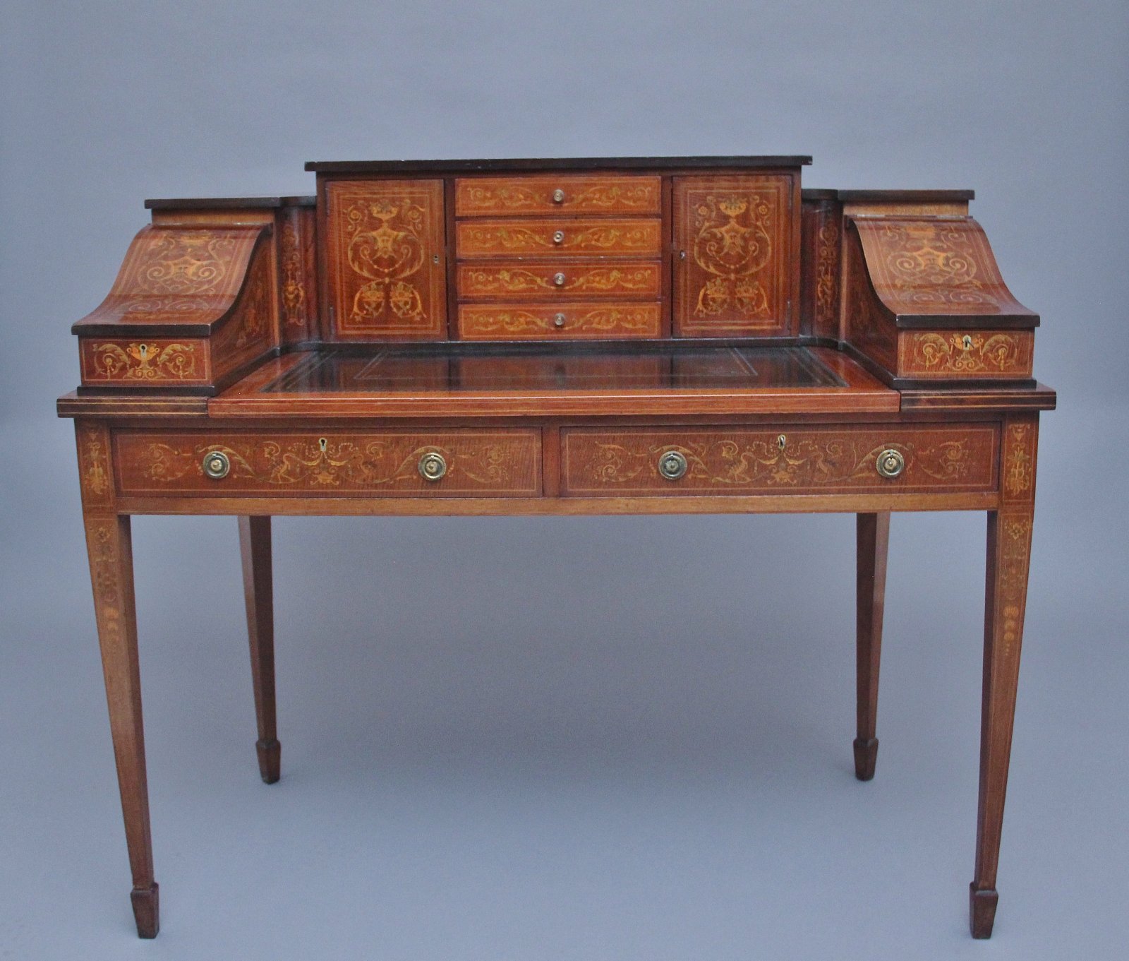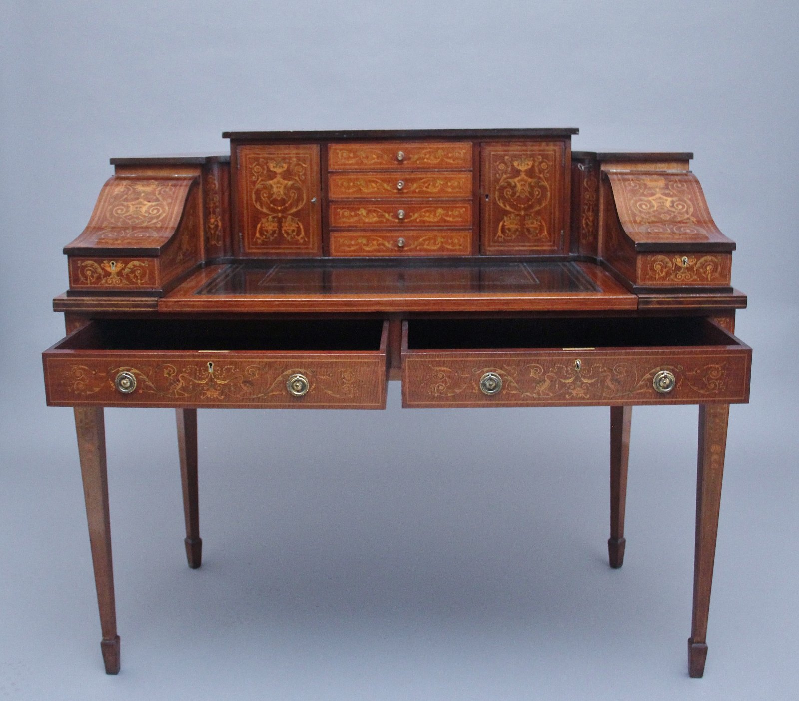 A fabulous quality near pair of freestanding early 20th Century mahogany and inlaid Carlton house desk's, both desks having a super structure comprising of four mahogany inlaid drawers at the centre with original brass turned knob handles, cupboards either side with workable lock and key with a single fixed shelf inside, there is a pull out writing slide with a black leather writing surface decorated with blind and gold tooling, stationary compartments either side with lift up lids to reveal a pen tray and various compartments, at each corner there are pull out letter slides with concave fronts and at the top there are letter slots, both letter slides and the lift up stationary compartments also have workable locks and keys. The frieze below having two mahogany lined drawers with original brass ring handles, standing on square tapering legs with with spade feet.