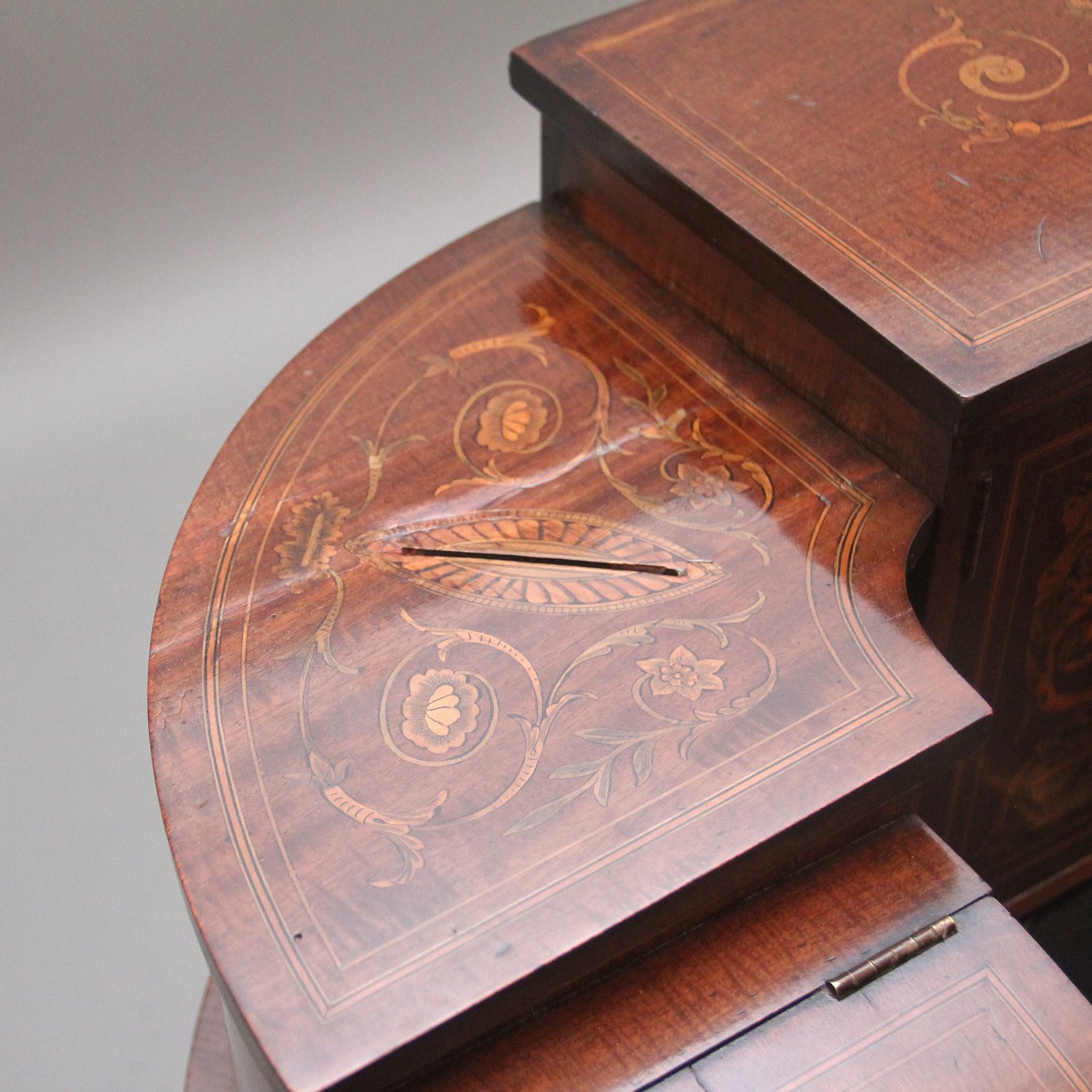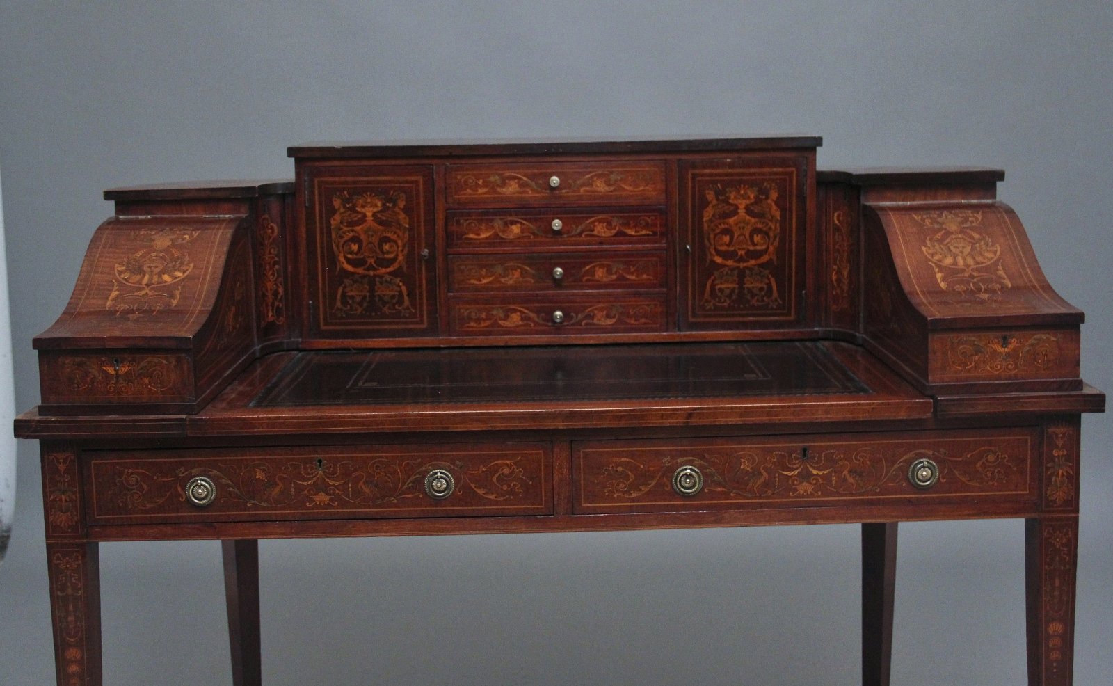Both desks are near identical in every way including the dimensions, the only difference is the inlaid figure heads on the lift up lids and sides, one is of a male and the other a female, so they could be used as "His & Hers" writing desks. The desks are in excellent condition and profusely inlaid all over incorporating various figure heads, urns and floral inlay. Circa 1910.