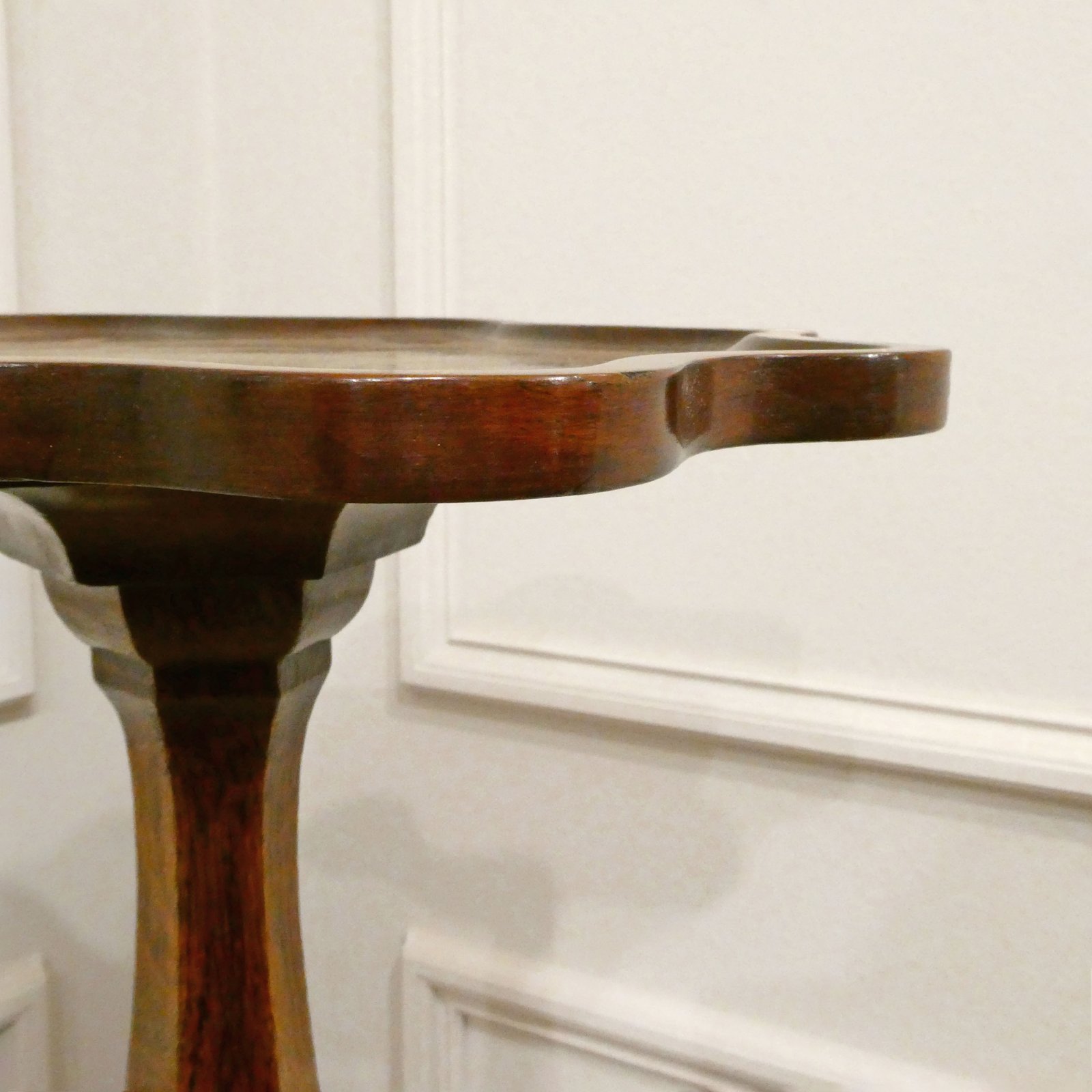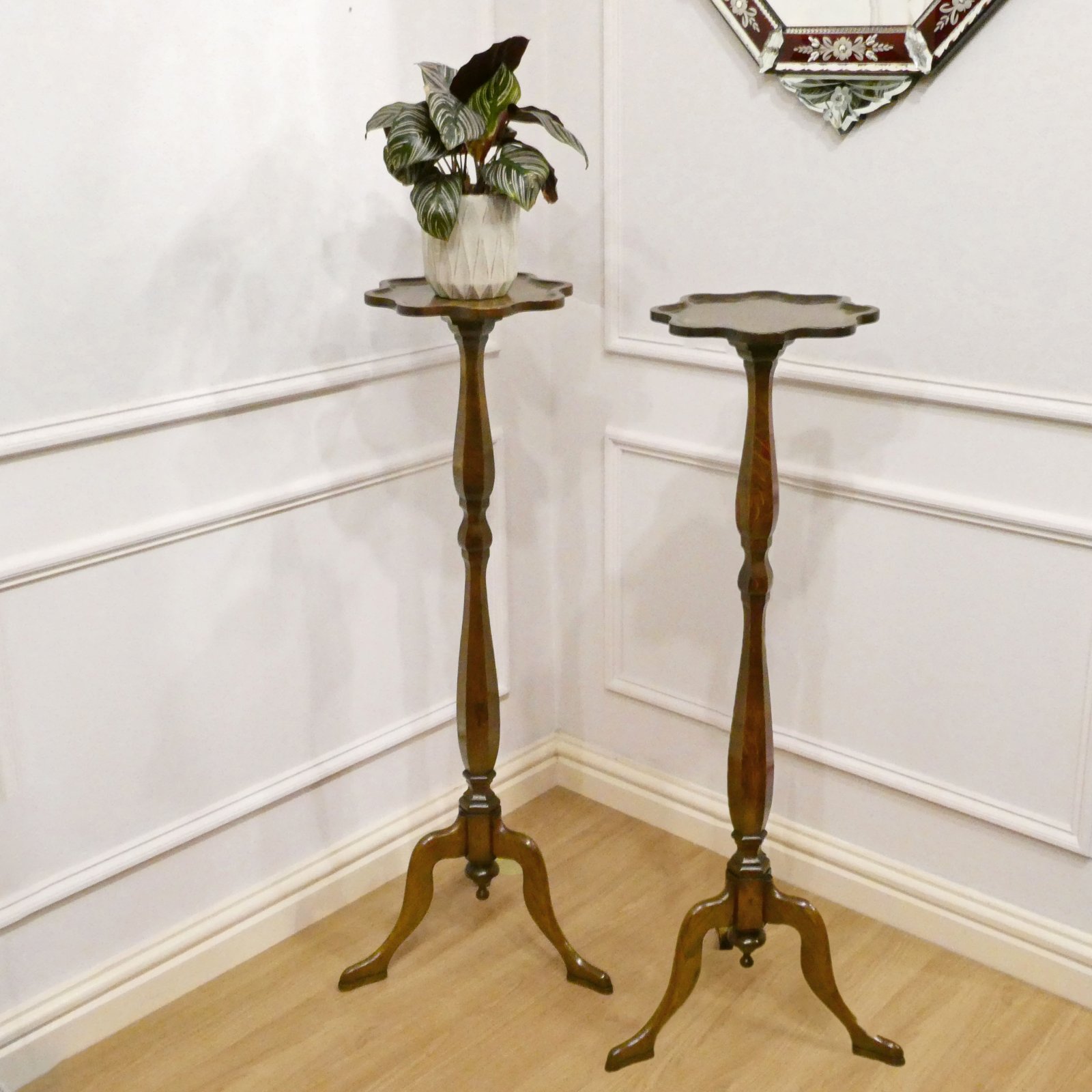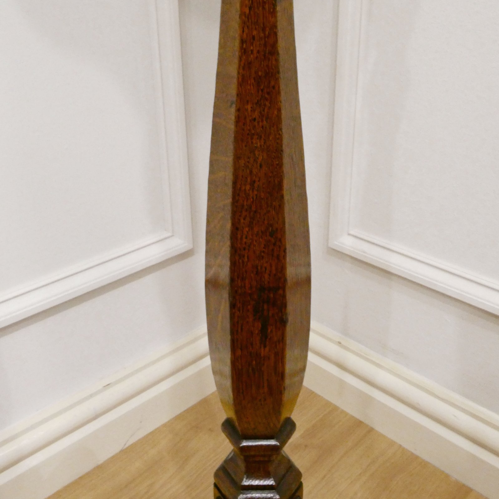 A good quality pair of Edwardian oak antique torchères or plant stands with vase shaped hexagonal central columns, standing on tripod bases with out swept legs finished with turned finial underneath.