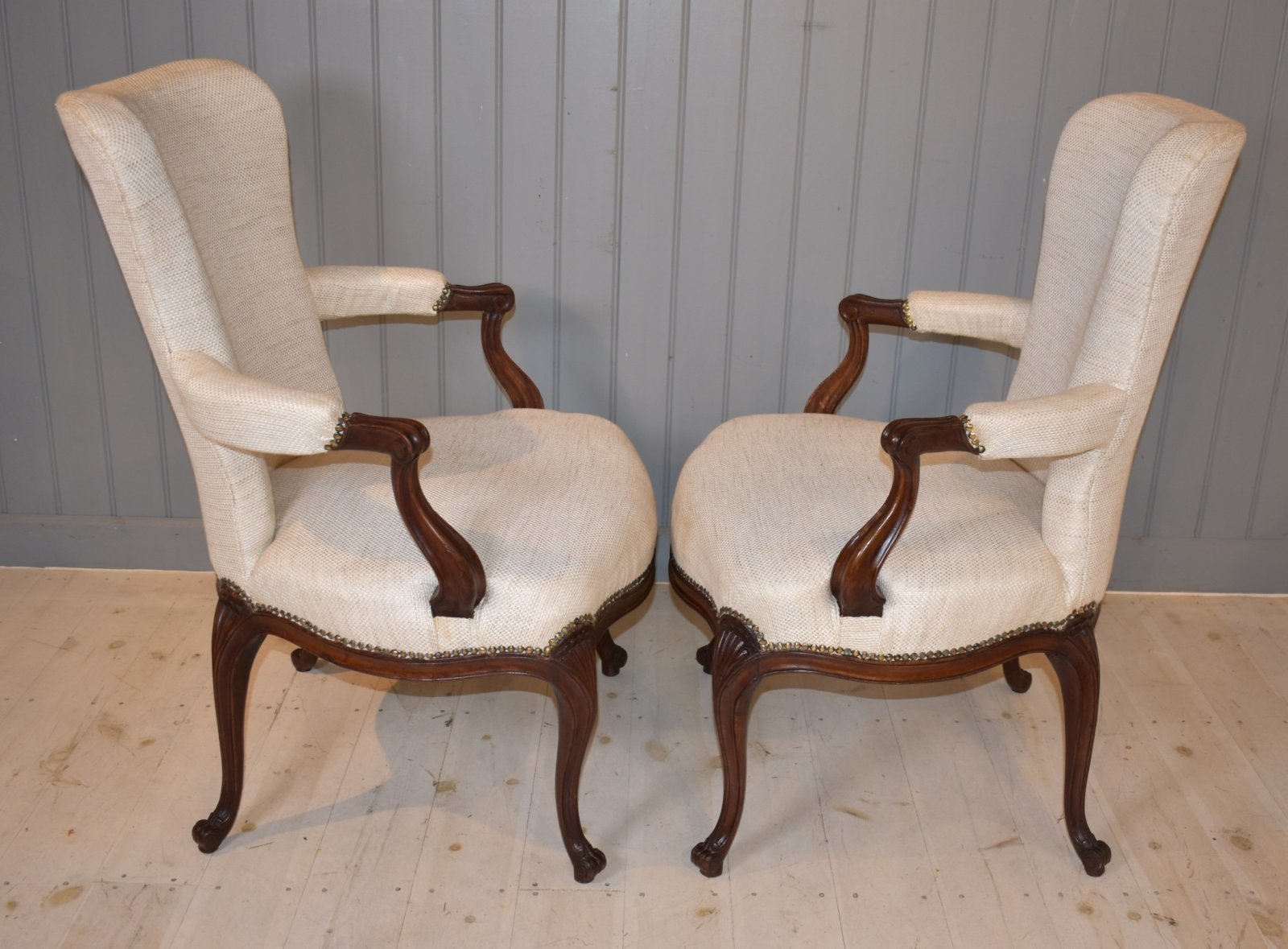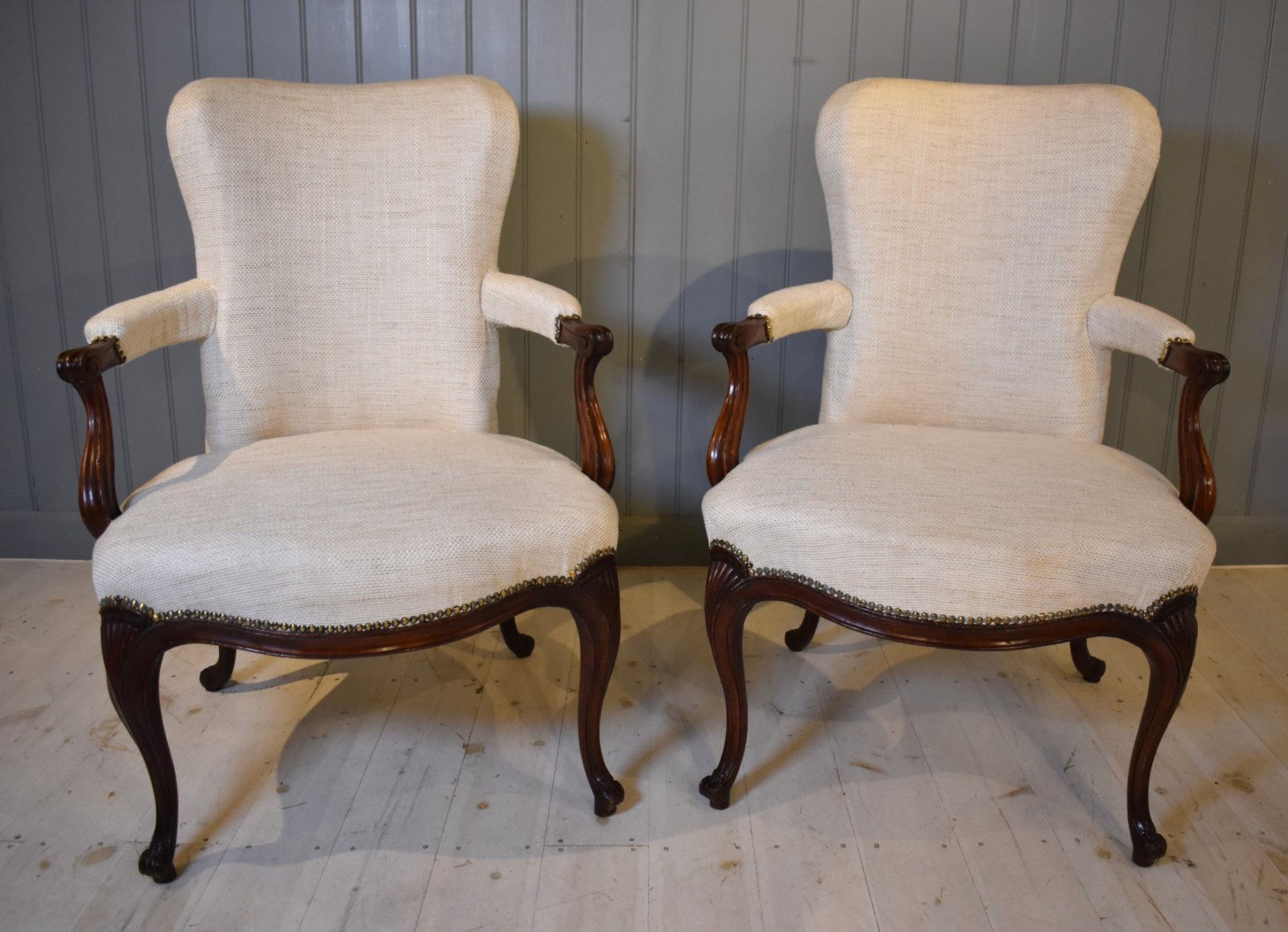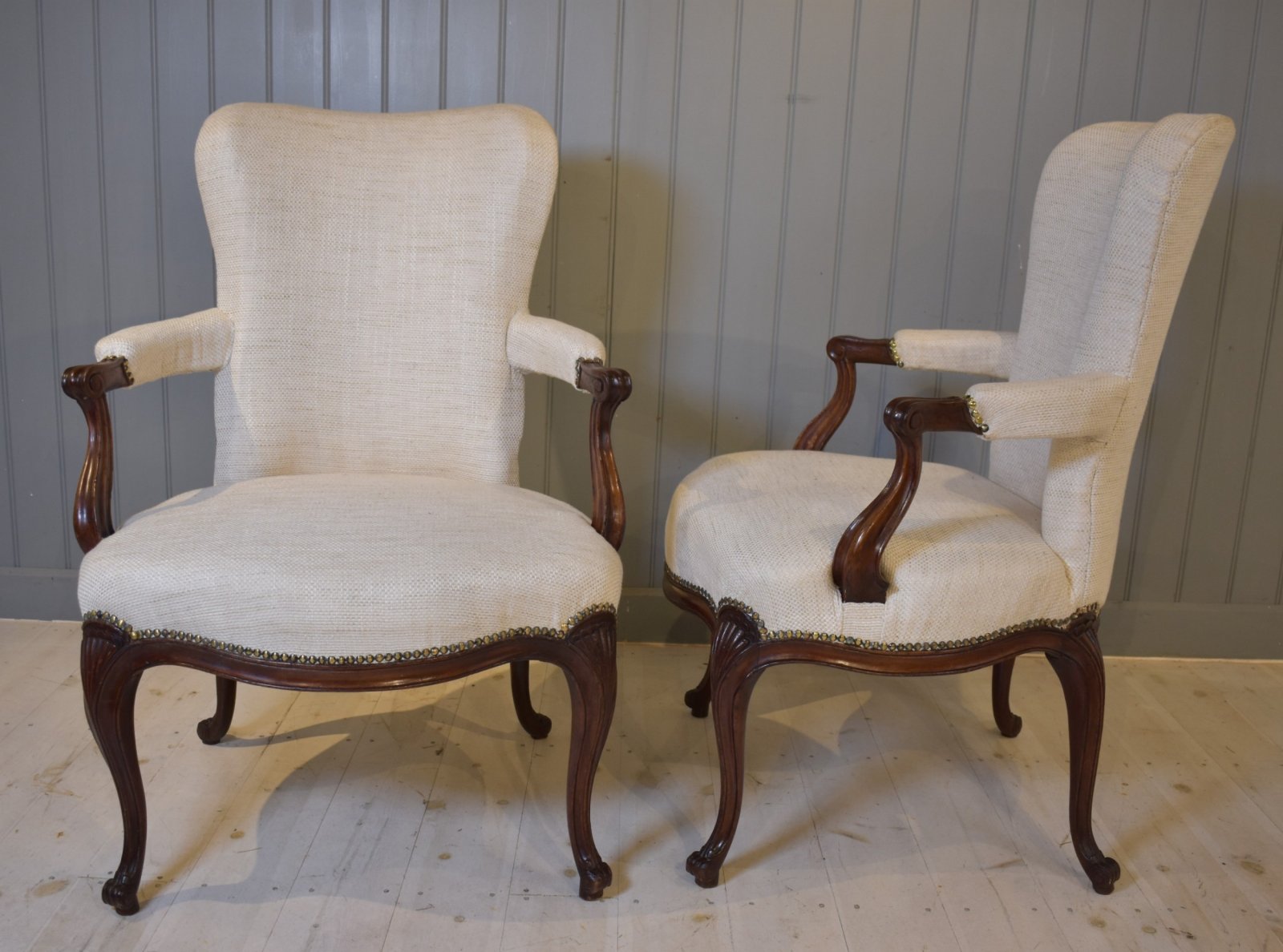 Fine pair of 18th century mahogany open armchairs in the French Hepplewhite style. A style defined by the beautiful scrolling arm and typical cabriole legs with shell carving on the knees. Although French in design, these chairs are quintessentially English. George Hepplewhite''s workshop was in London and his manual of furniture design was first published in 1788.