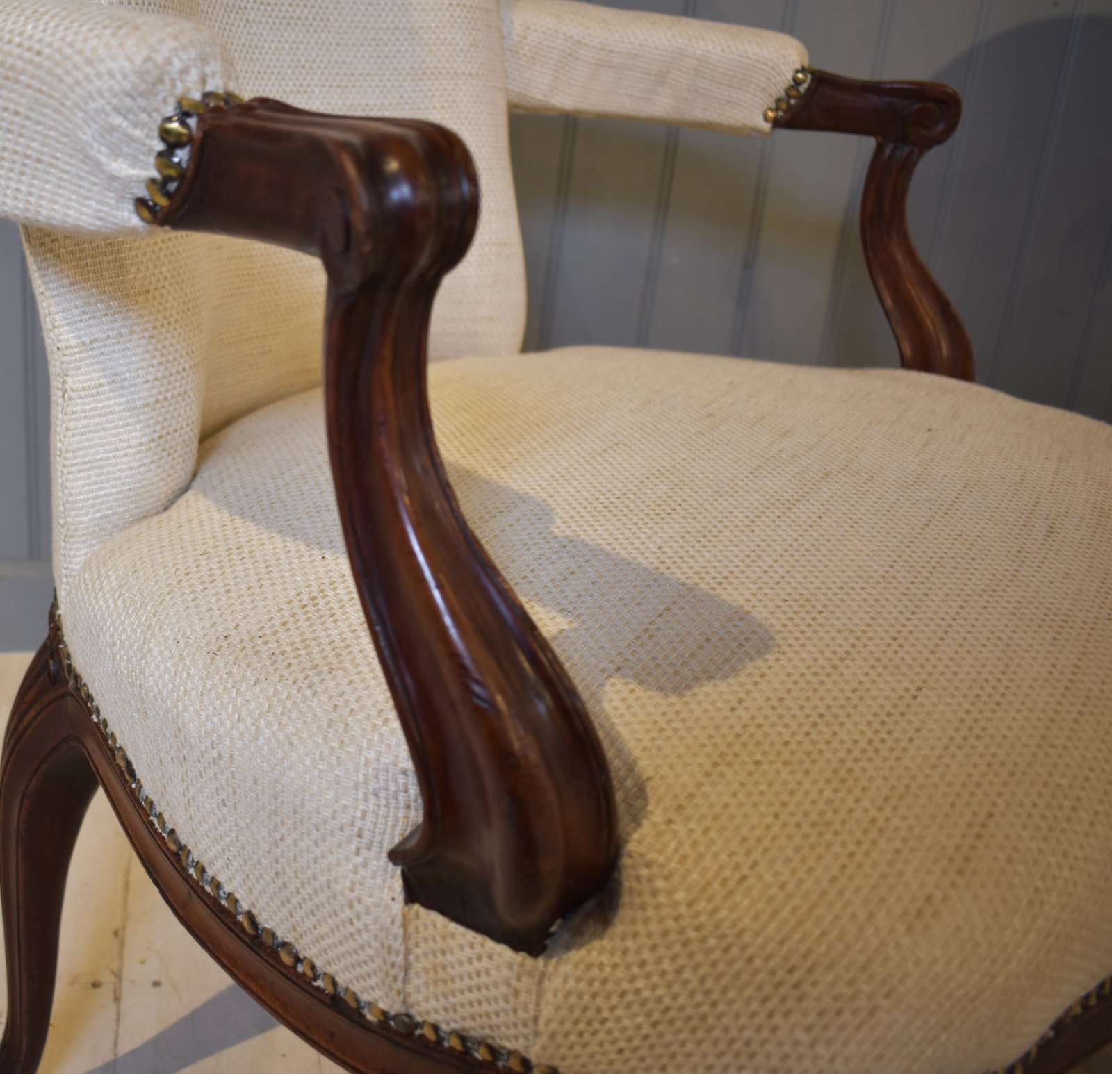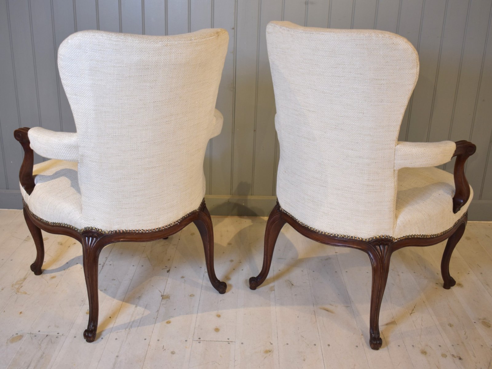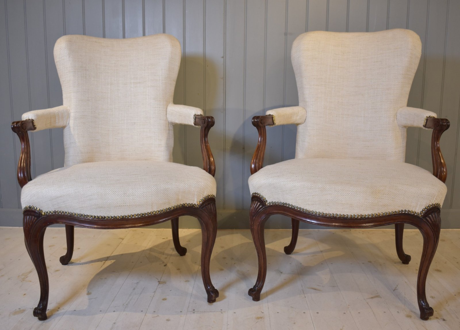 Fine pair of 18th century mahogany open armchairs in the French Hepplewhite style. A style defined by the beautiful scrolling arm and typical cabriole legs with shell carving on the knees. Although French in design, these chairs are quintessentially English. George Hepplewhite''s workshop was in London and his manual of furniture design was first published in 1788.