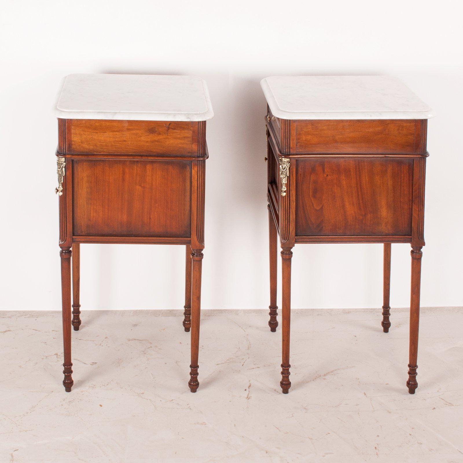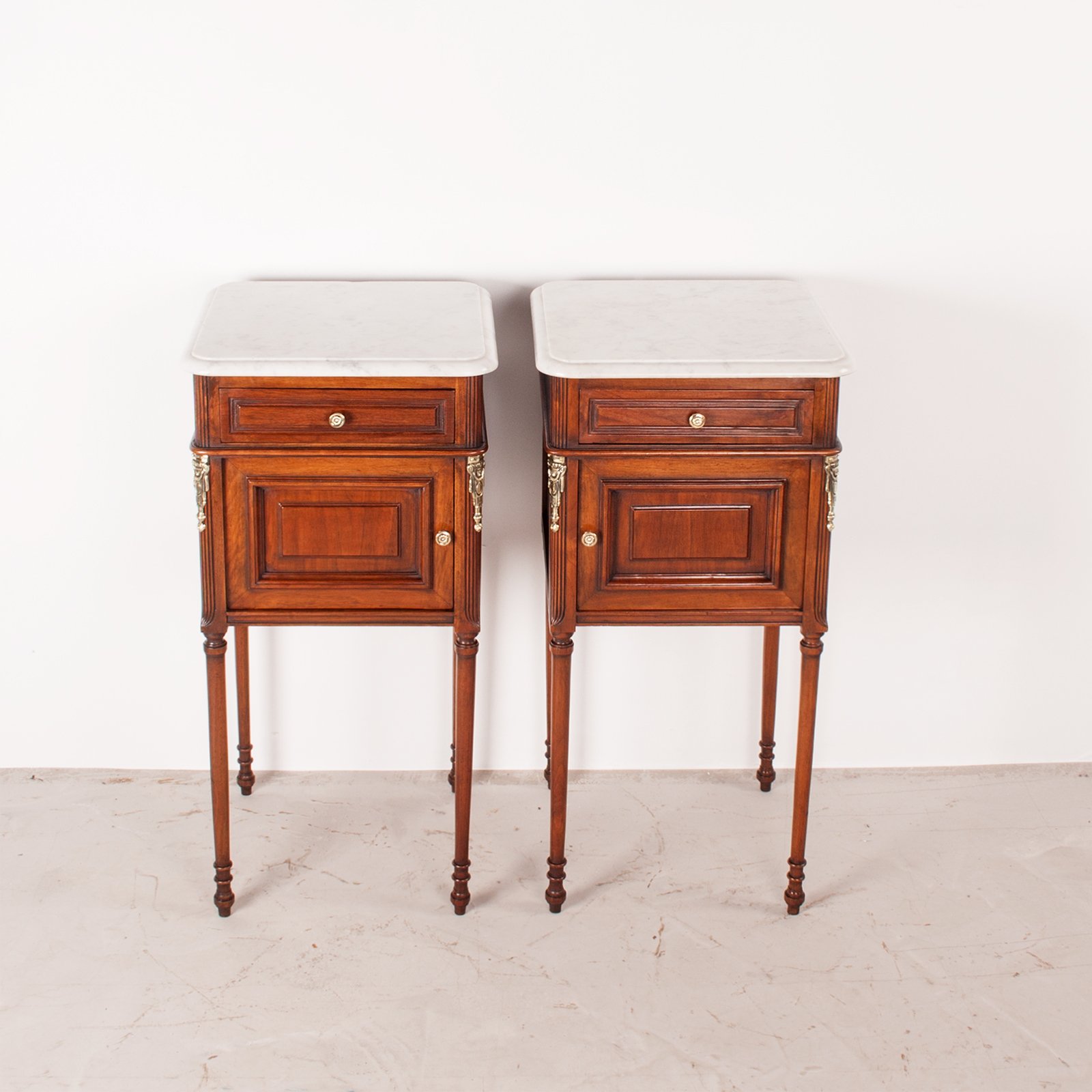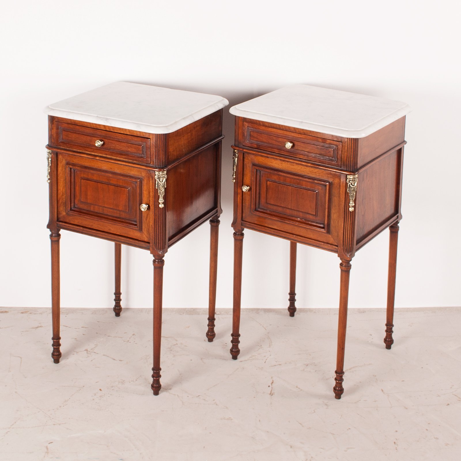 This Pair Of French Walnut Bedside Cabinets offer both elegance and practicality. Standing on finely turned legs that lead into their reeded top halves, topped off by ormolu mounts. The cupboard doors have a fielded panel to them which is a sign of quality, and open to reveal generous storage space. The free running oak lined drawers offer further storage.