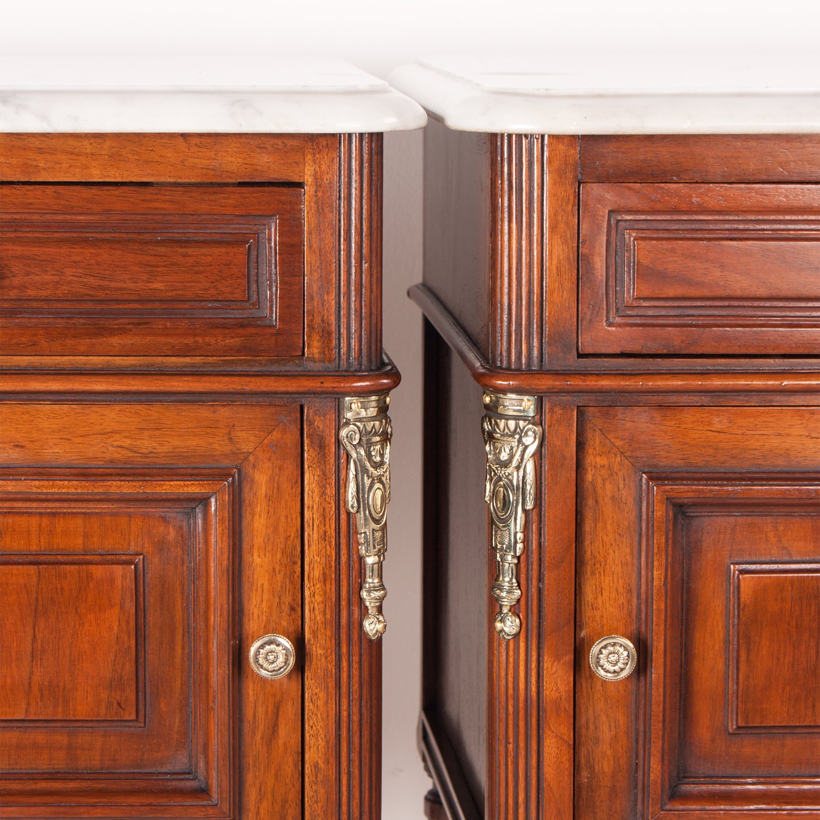 The rich warm hue of the walnut contrasts so well with the ormolu mounts and brass handles. You will notice that the cabinets are beautifully finished to the back, another indicator of superior quality. The lightly coloured marble tops with their darker grey veining, which have a few minor marks and abrasions to them as to be expected of furniture of this age, adds further practicality to this pair of cabinets.