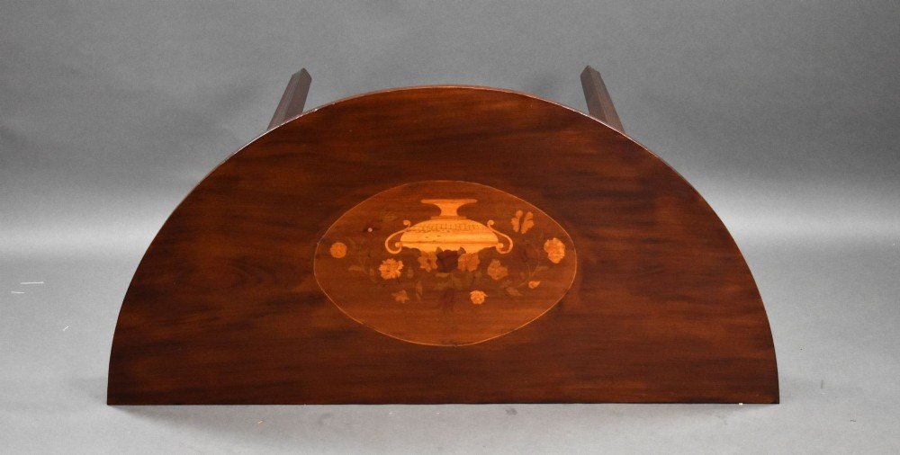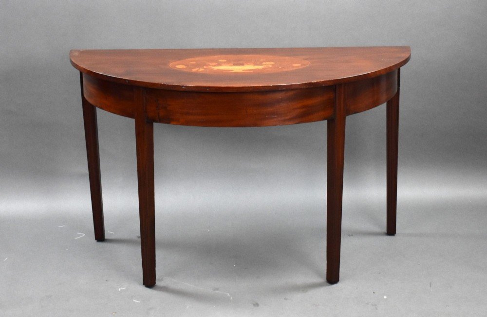 For sale is a pair of good George III mahogany inlaid console tables, having oval marquetry inlays to the centre, raised on square tapered legs, each table remains in good condition, showing minor signs of wear commensurate with age and use.