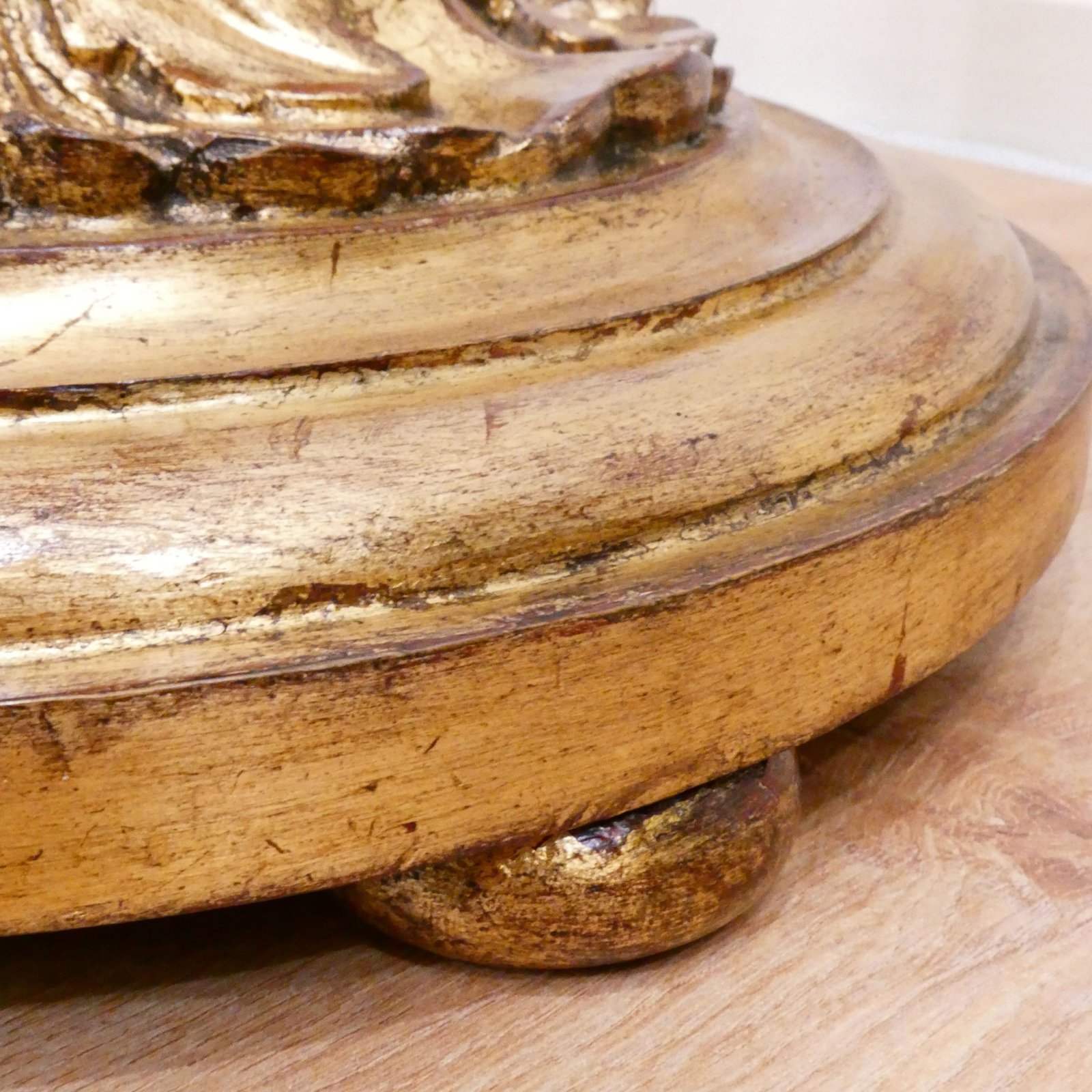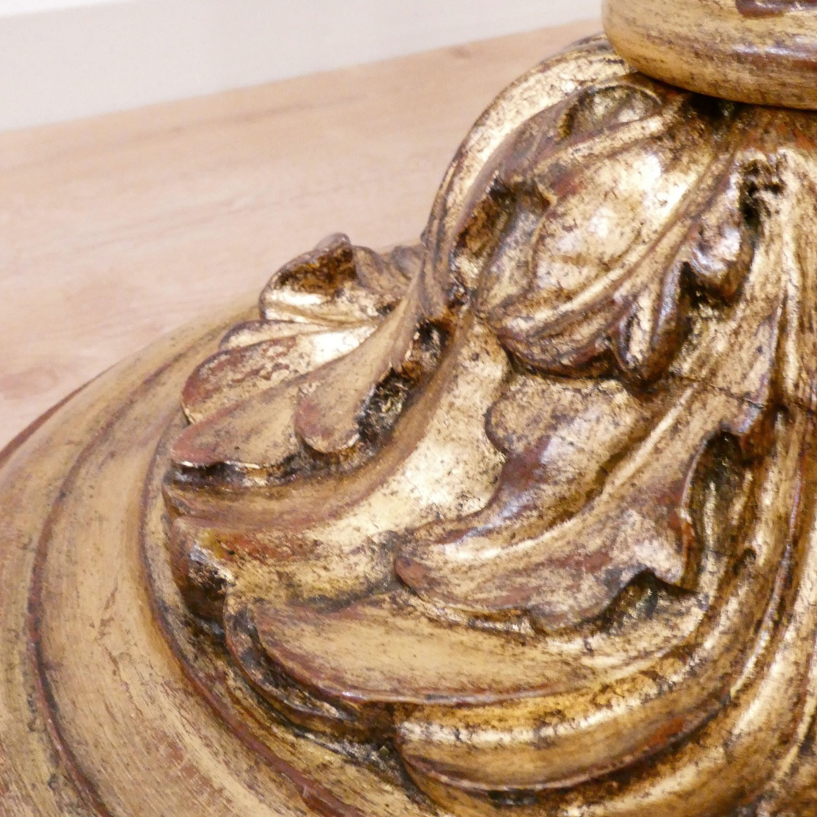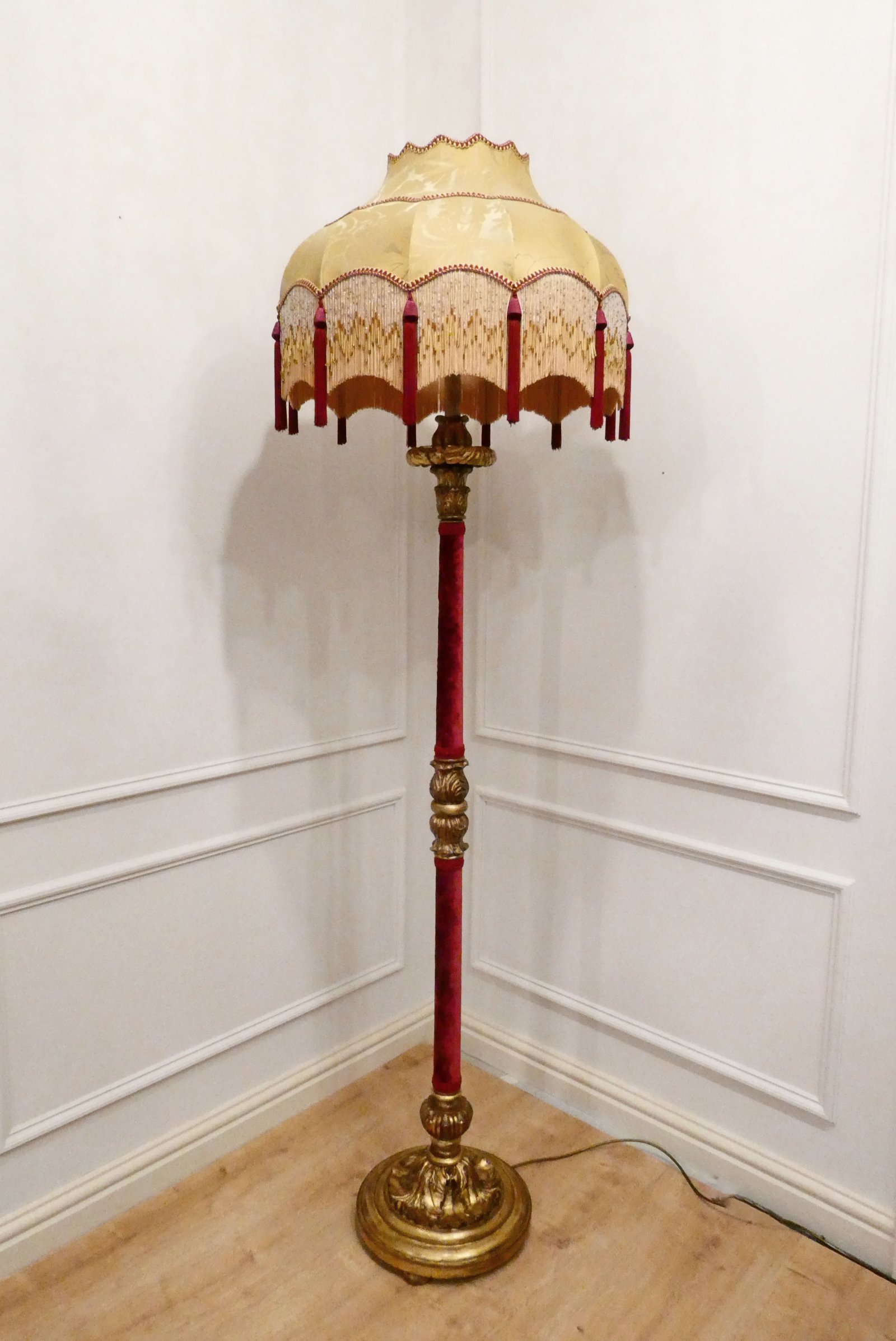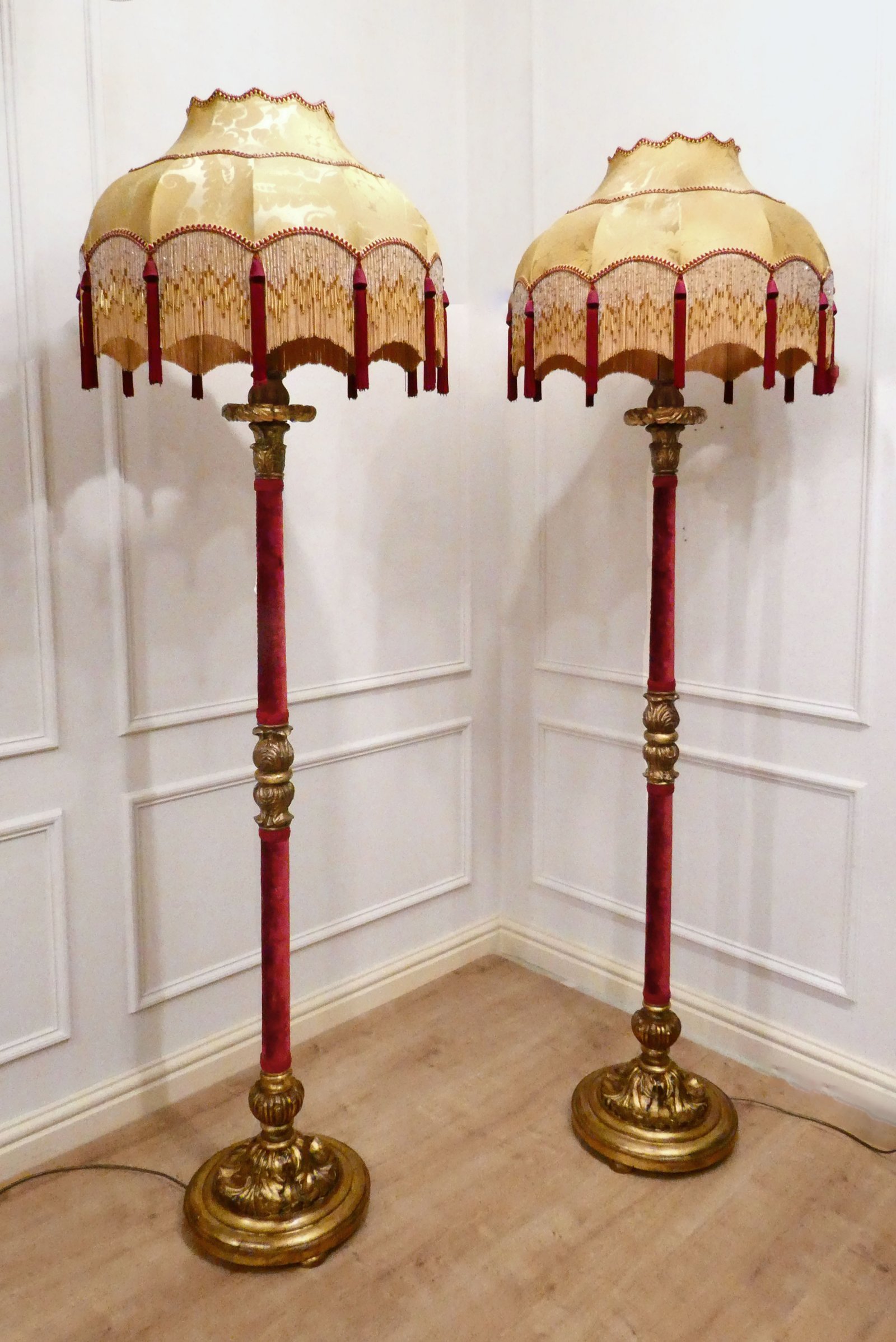 A decorative pair of early 20th century Italian giltwood floor lamps in the Baroque style, with central column and acanthus leaf carvings, terminating to circular bases, standing on bun feet.