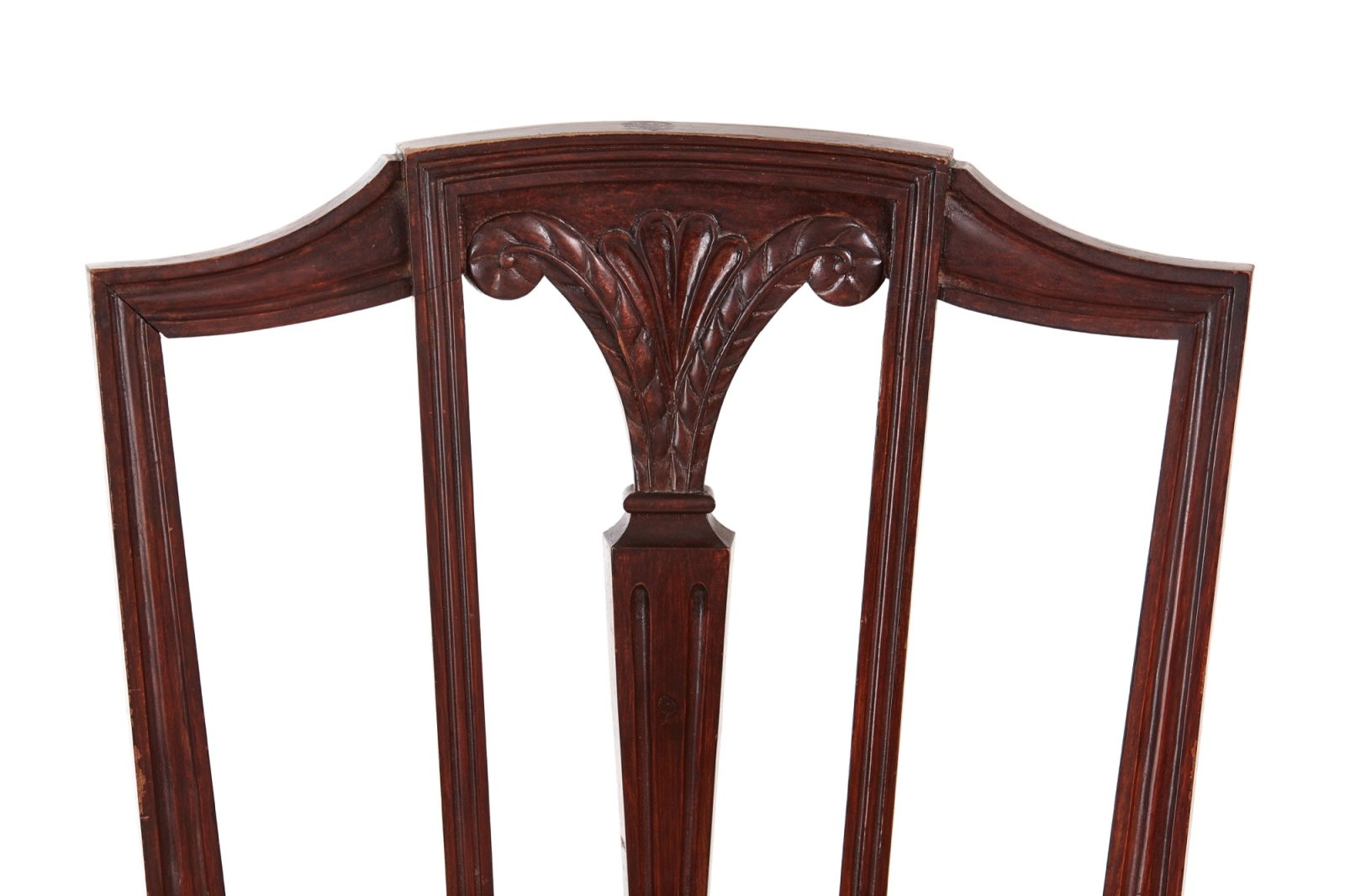 These are a pair of 19th Century antique mahogany Hepplewhite style side chairs with shaped top rail and a carved and reeded centre splat. They have had newly reupholstered seats. They stand on reeded tapered front legs with out-swept back legs.