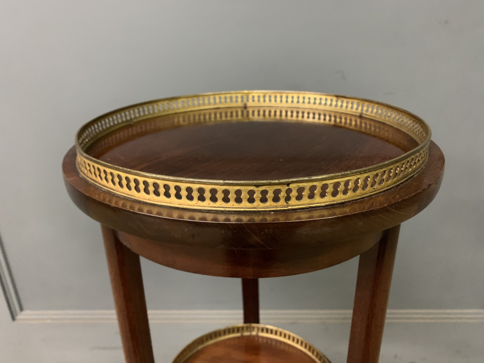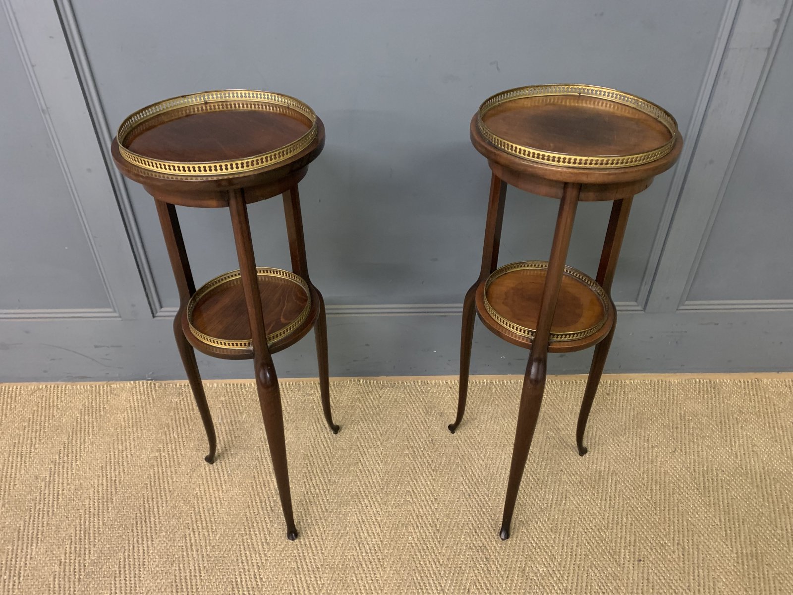 A lovely pair of early 20th century mahogany stands, or jardiniere stands. Well constructed in solid mahogany with lovely sweeping cabriole legs. With 2 tiers, each fitted with a pierced brass gallery. Offered for sale in very good original condition, ready to go straight into the home.