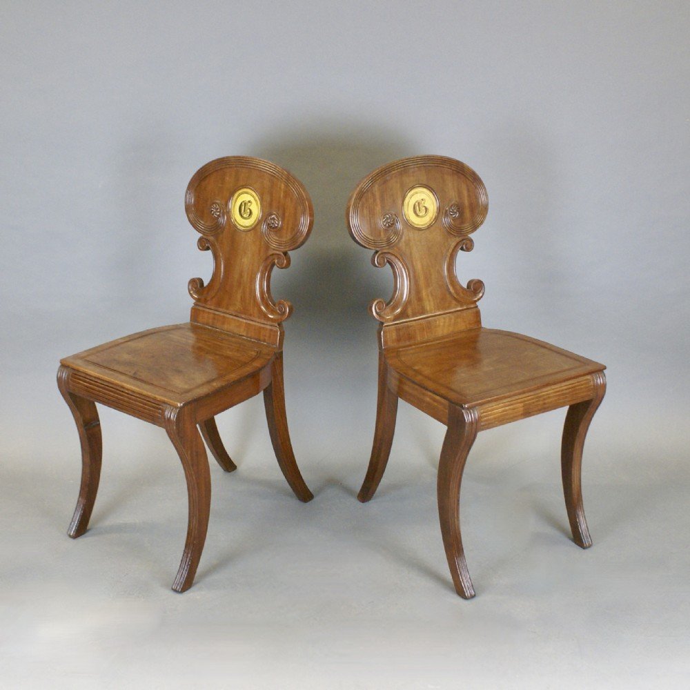 Pair of Regency Hall chairs attributed to Gillows. Raised on reeded sabre legs with panelled seats and decorative backs with ''C'' scrolls, carved paterae and painted amorial. In dense mahogany and very good condition, with a good colour and waxed patina. 840mm high, 450mm wide and 470mm deep. English. circa 1830.