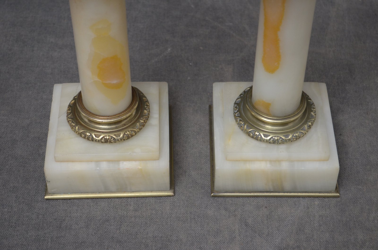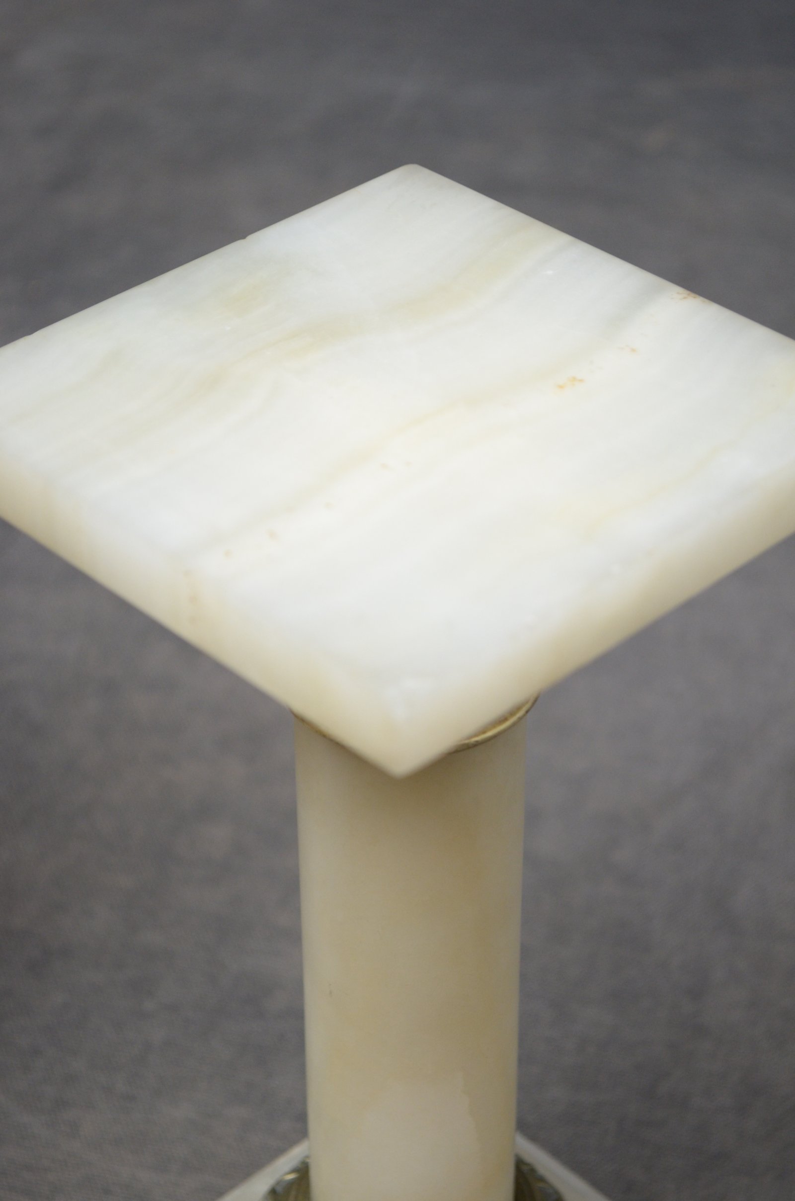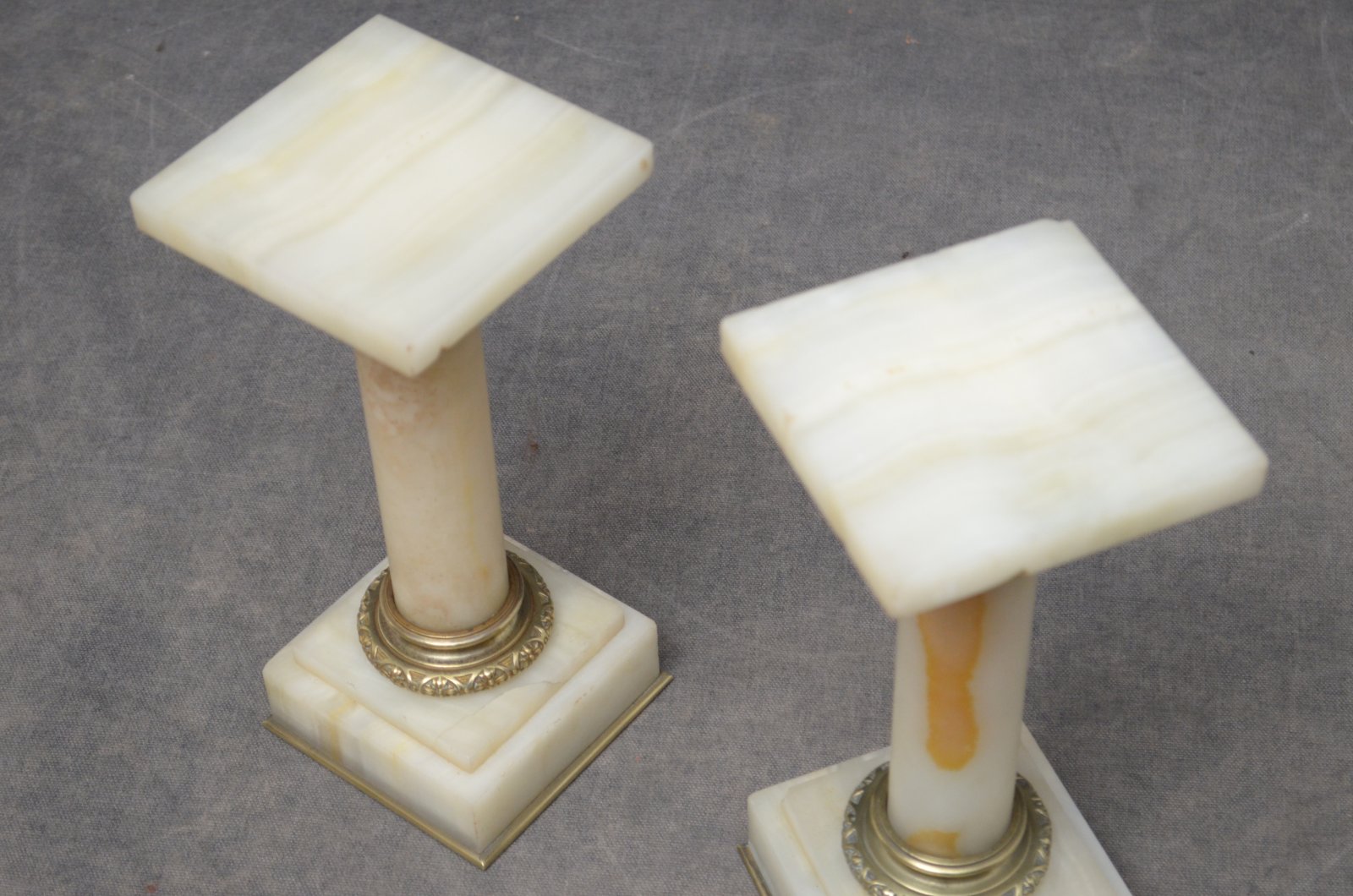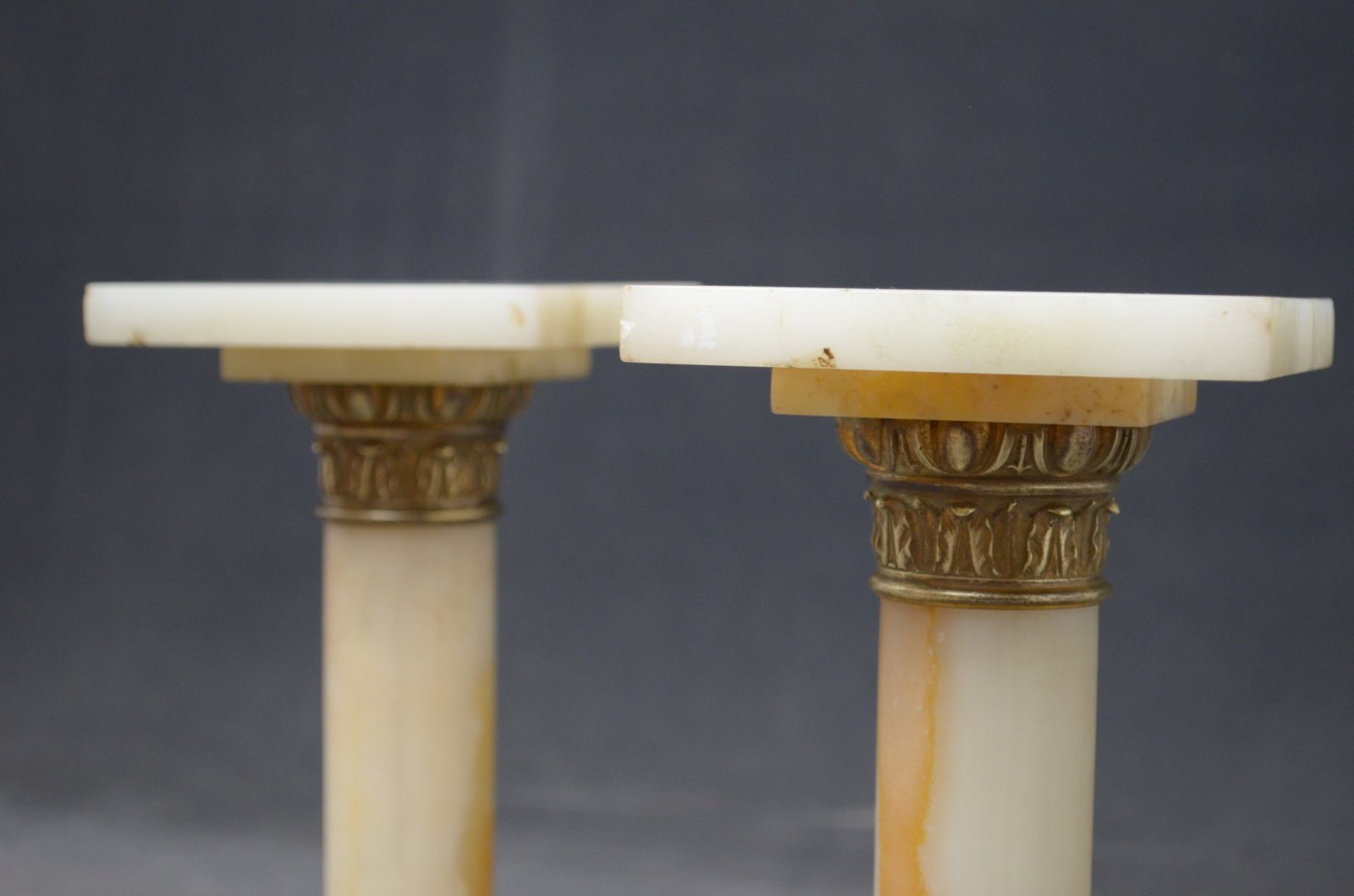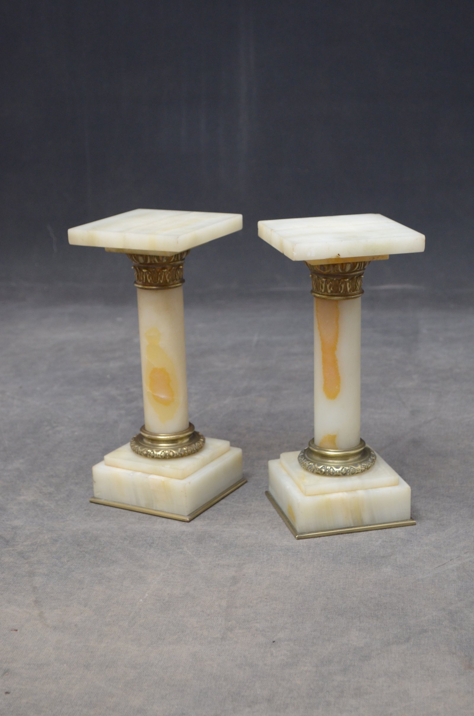 P081, A rare pair of antique marble columns in onyx, each having a square platform top (one with small chip to the corner), brass collar, veined columns terminating in brass collar and stepped veined base, standing on brass moulding. This antique pair of pedestals is in home ready condition, circa 1880