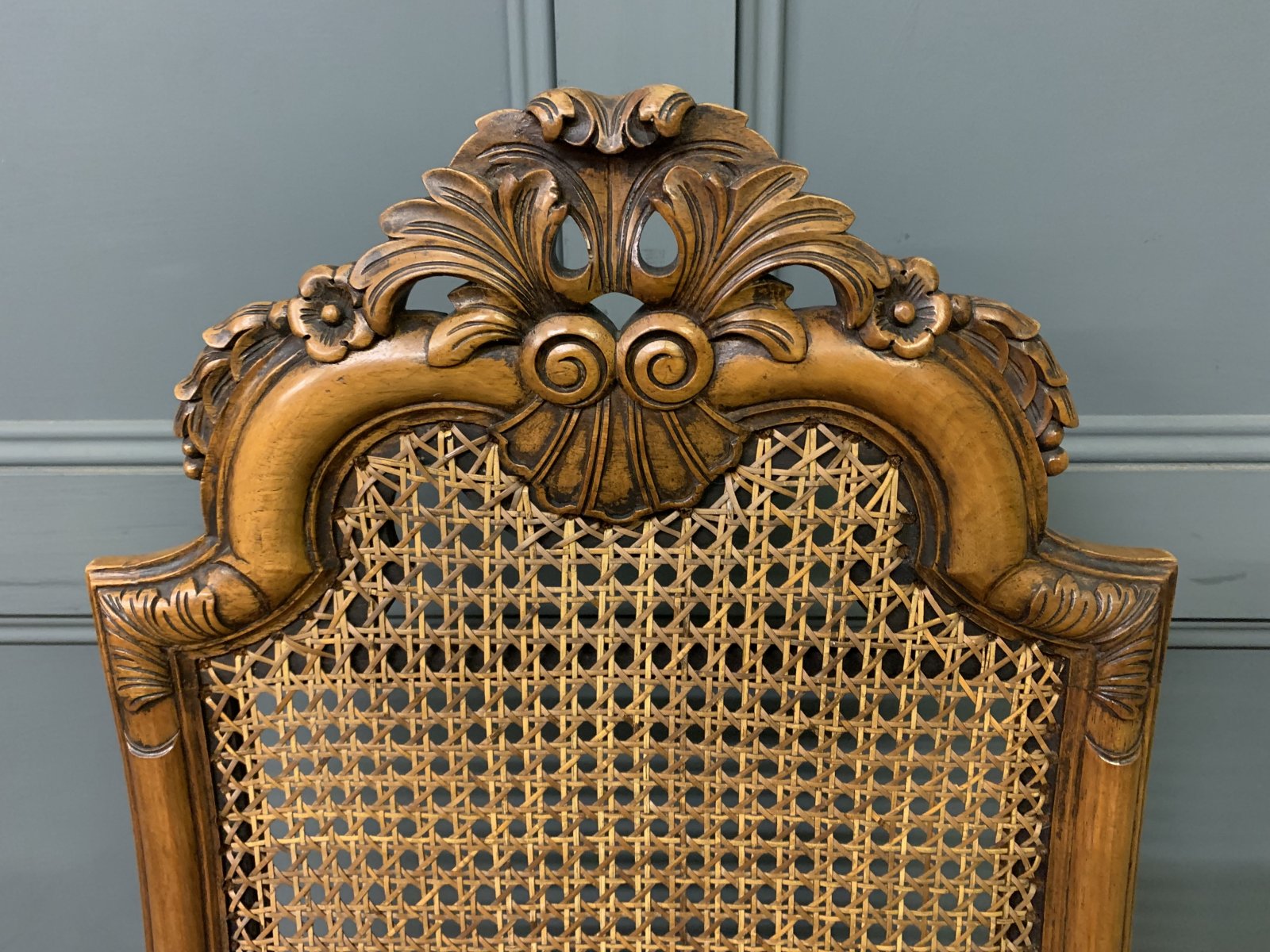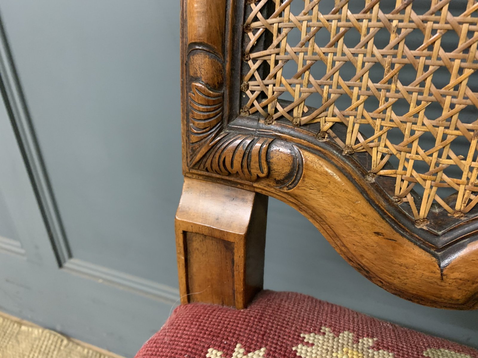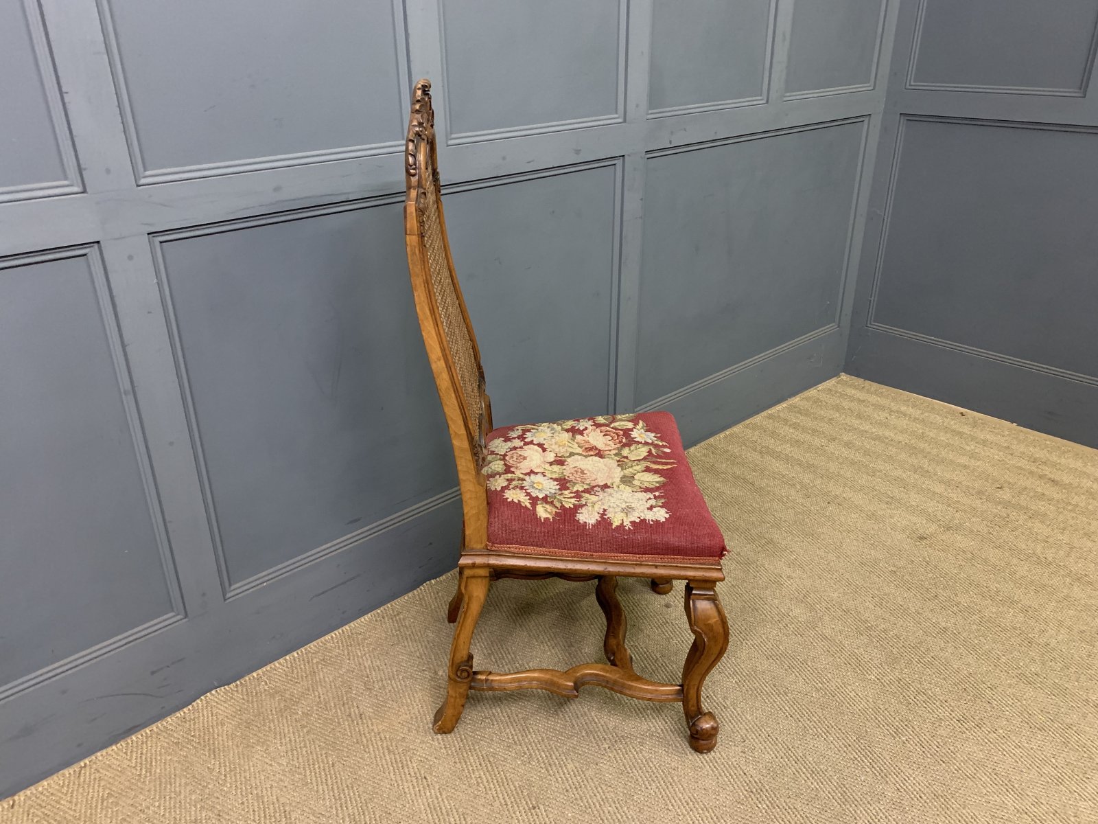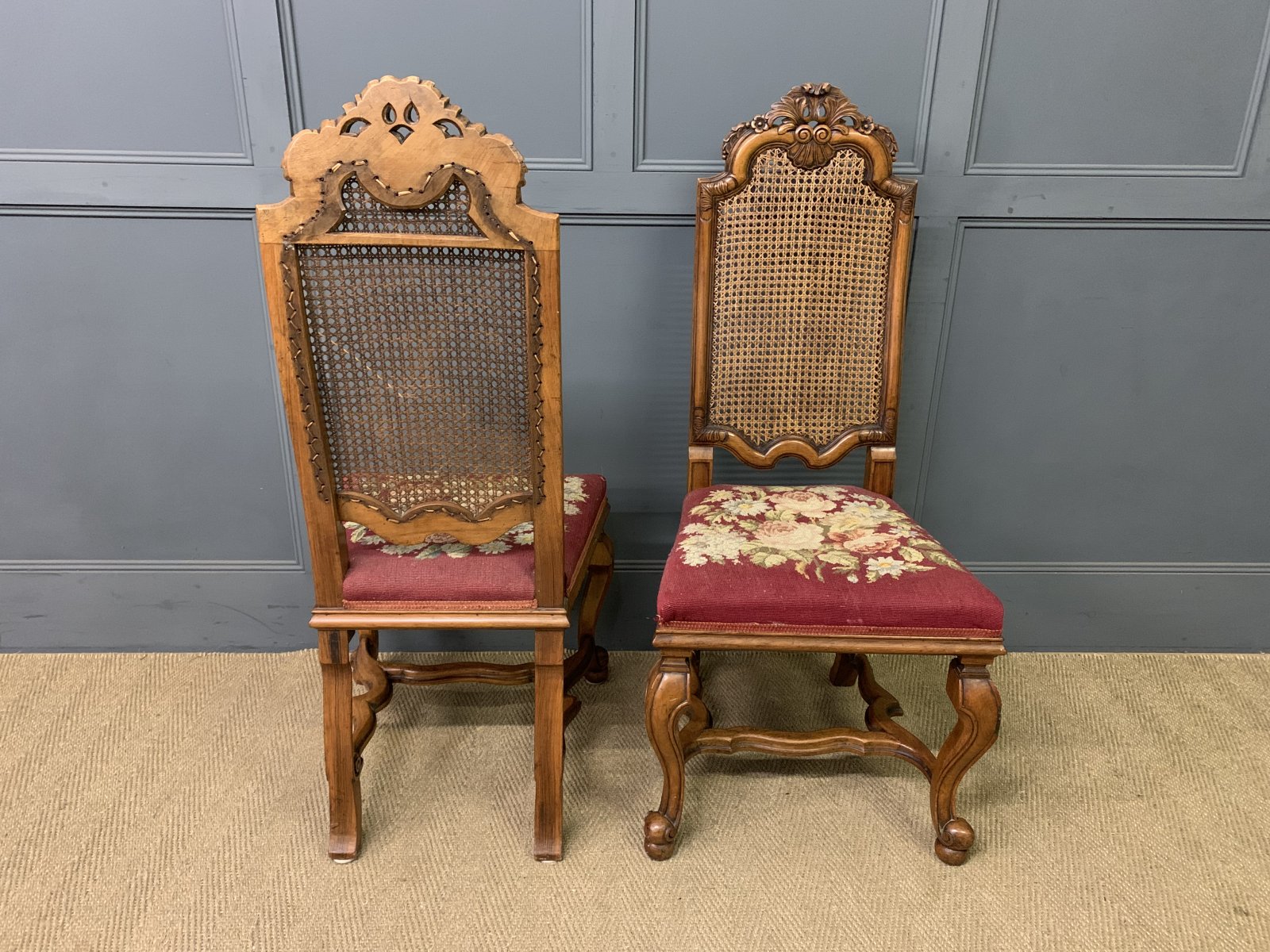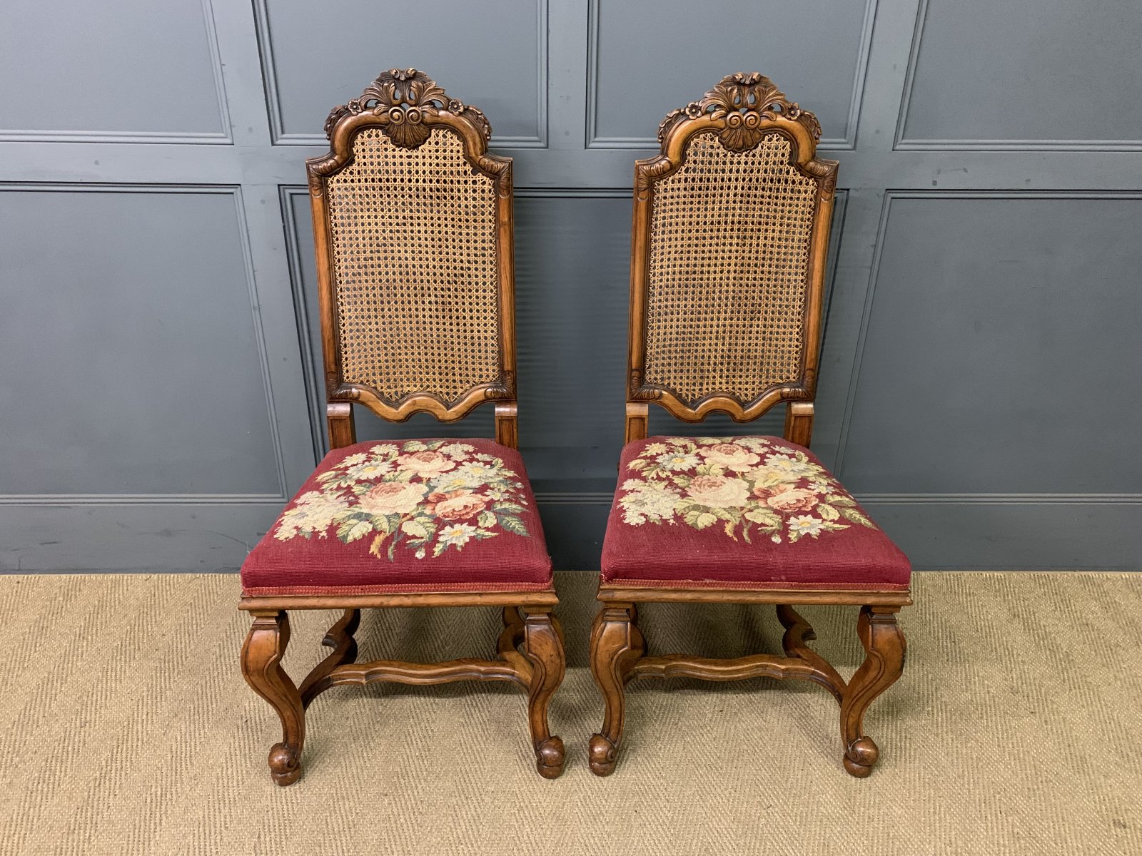 A very good pair of walnut William and Mary style chairs by Waring and Gillow. Of excellent construction in solid walnut and dating to the Edwardian period. With high backs fitted with their original cane work. The upholstered seats with the original needle-point woolwork upholstery. Decorated with carved detailing to the backs and crests. With scrolling cabriole legs united by stretchers. Offered for sale in very good original conditon, with a good colour. Would sit well within a number of different room scenarios within the modern home.
