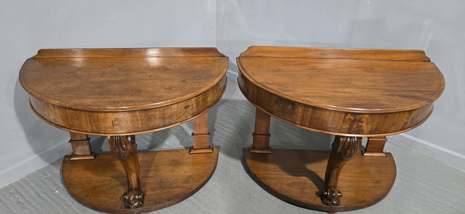 A very nice pair of Victorian demi loon console tables with single lions leg to the front, in overall very good original condition.