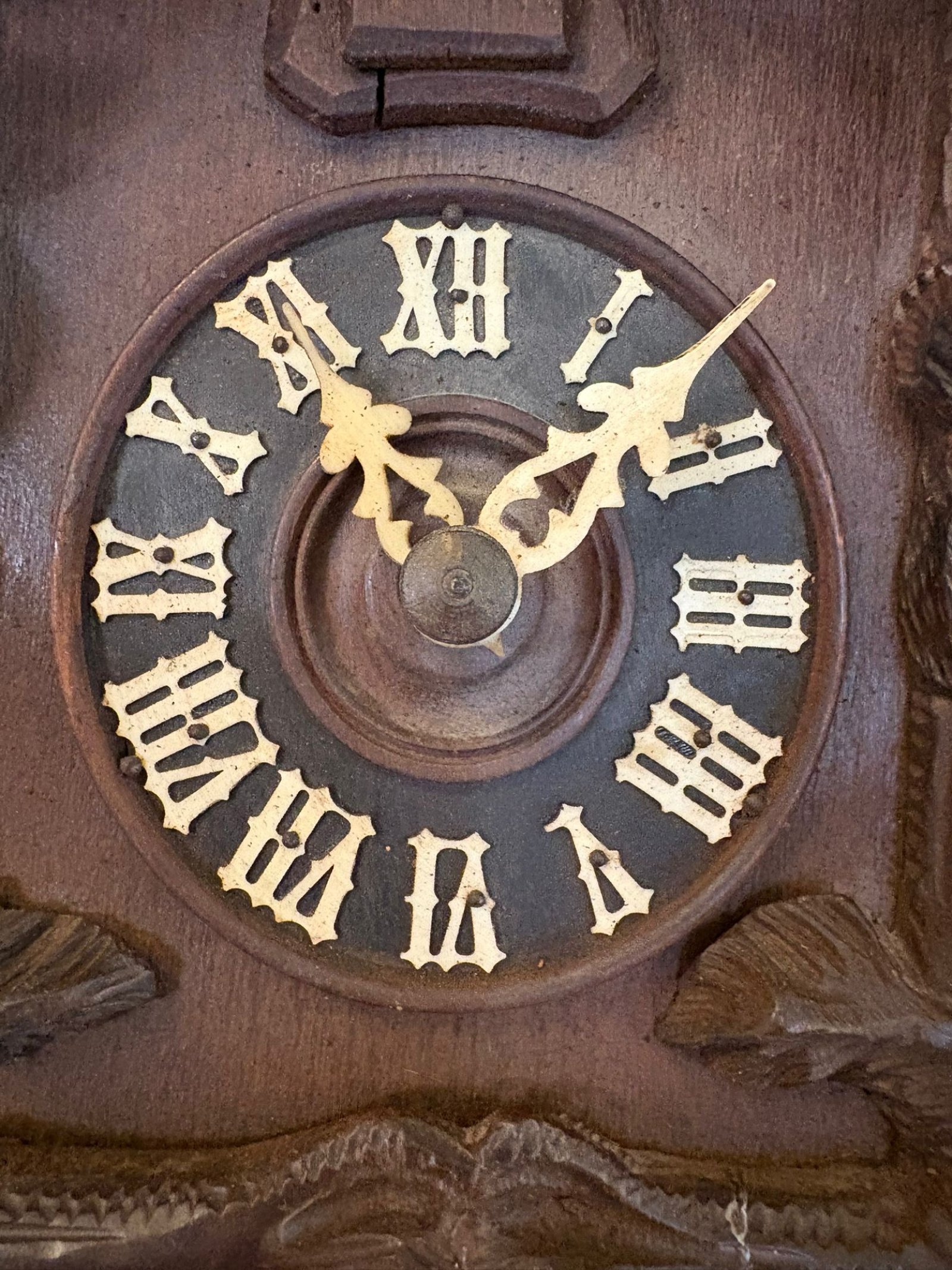 Clocks of this type were produced in the Black Forest region of Germany where skilled craftsmen combined timekeeping with decorative carving to create pieces that were both functional and visually engaging. Bear examples are particularly sought after as they are less common and offer a stronger visual impact than standard leaf designs.