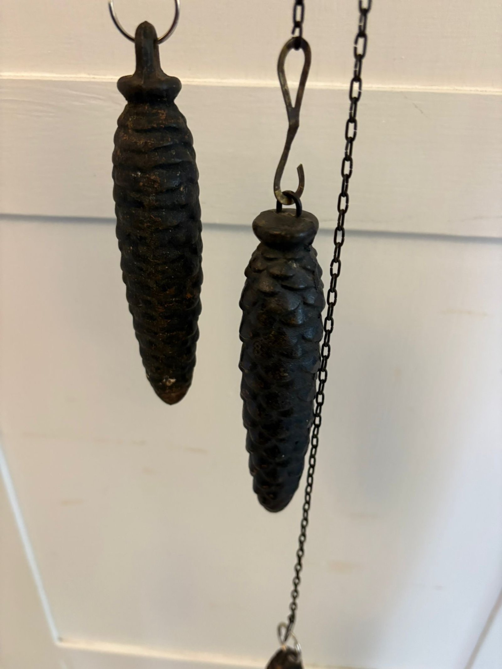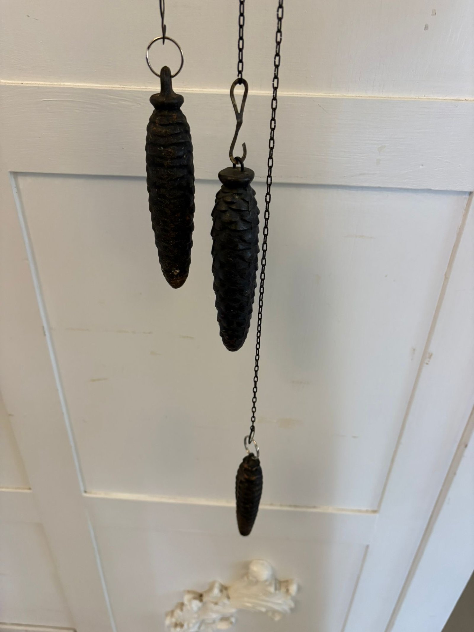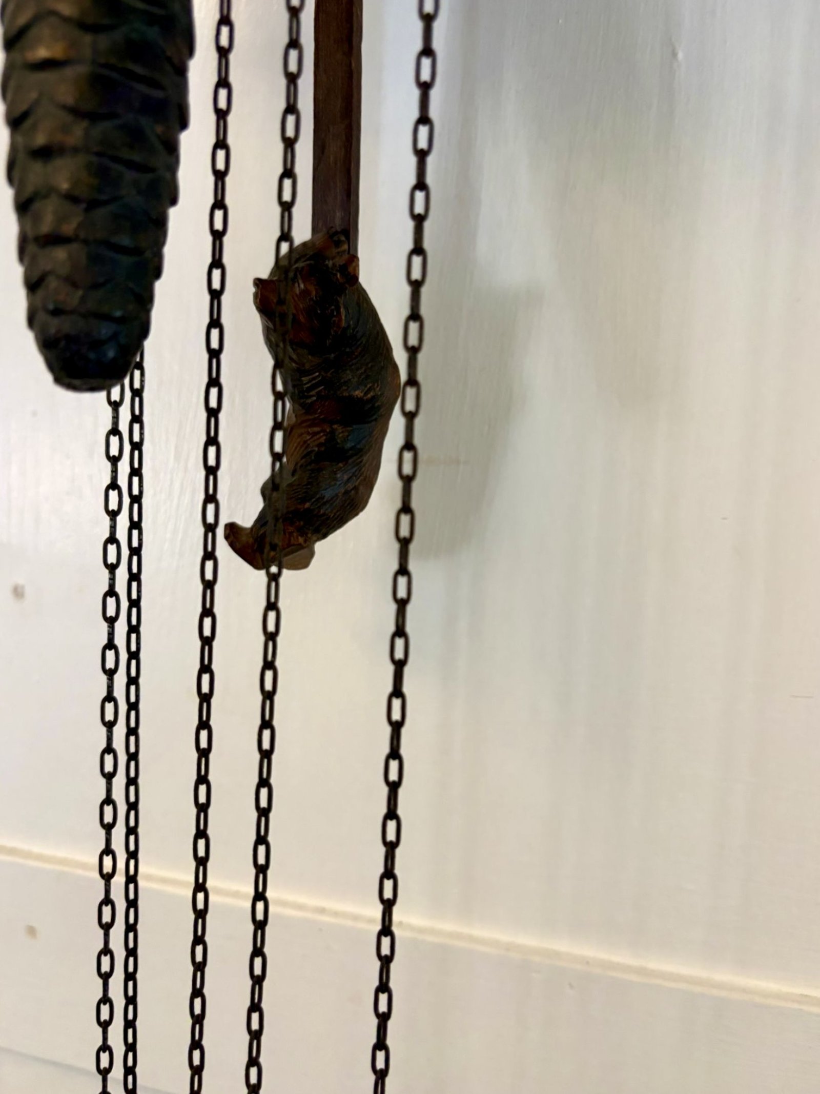 The clock retains its original chain's pinecone weights and pendulum and operates with a traditional weight driven movement. The cuckoo bird emerges on the hour adding both charm and movement making this not just a timepiece but a focal feature within a room.