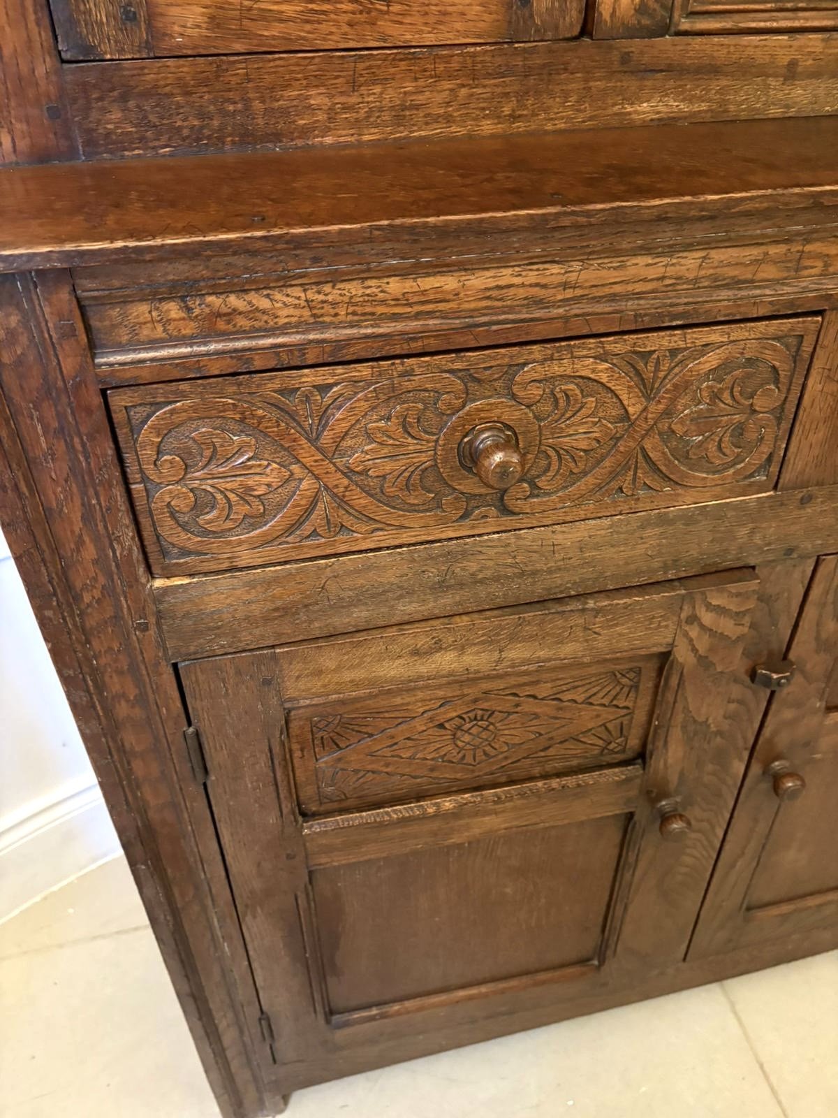 The warm patina and deeply carved decoration make this a striking example of the early 20th-century revival of English vernacular furniture. Perfect for a hallway, kitchen, dining room or as a statement storage piece in any interior.