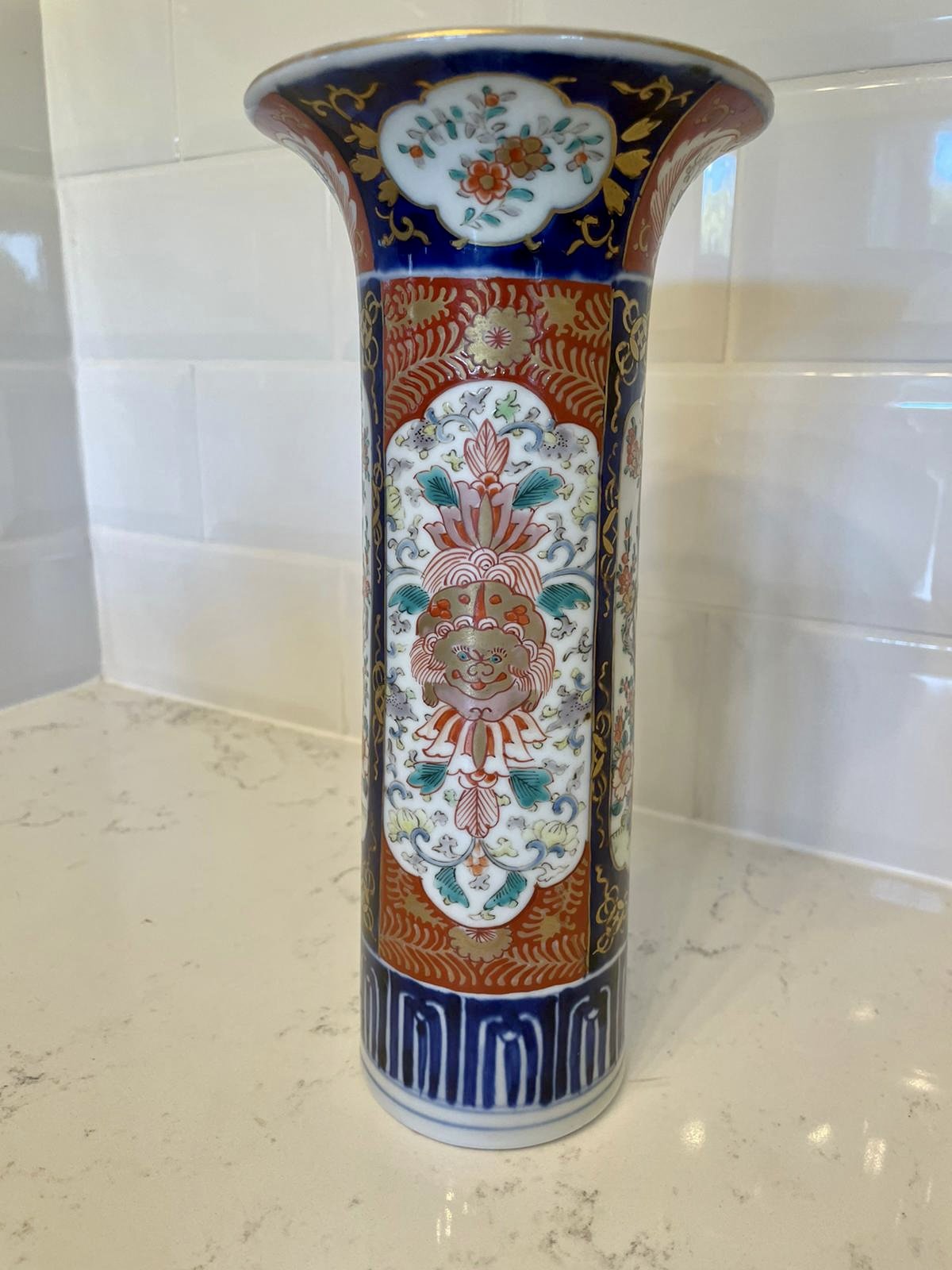 Quality antique Imari vase having quality hand painted panels with flowers, leaves and dogs and hand painted in fantastic red, blue, green, yellow and gold colours.