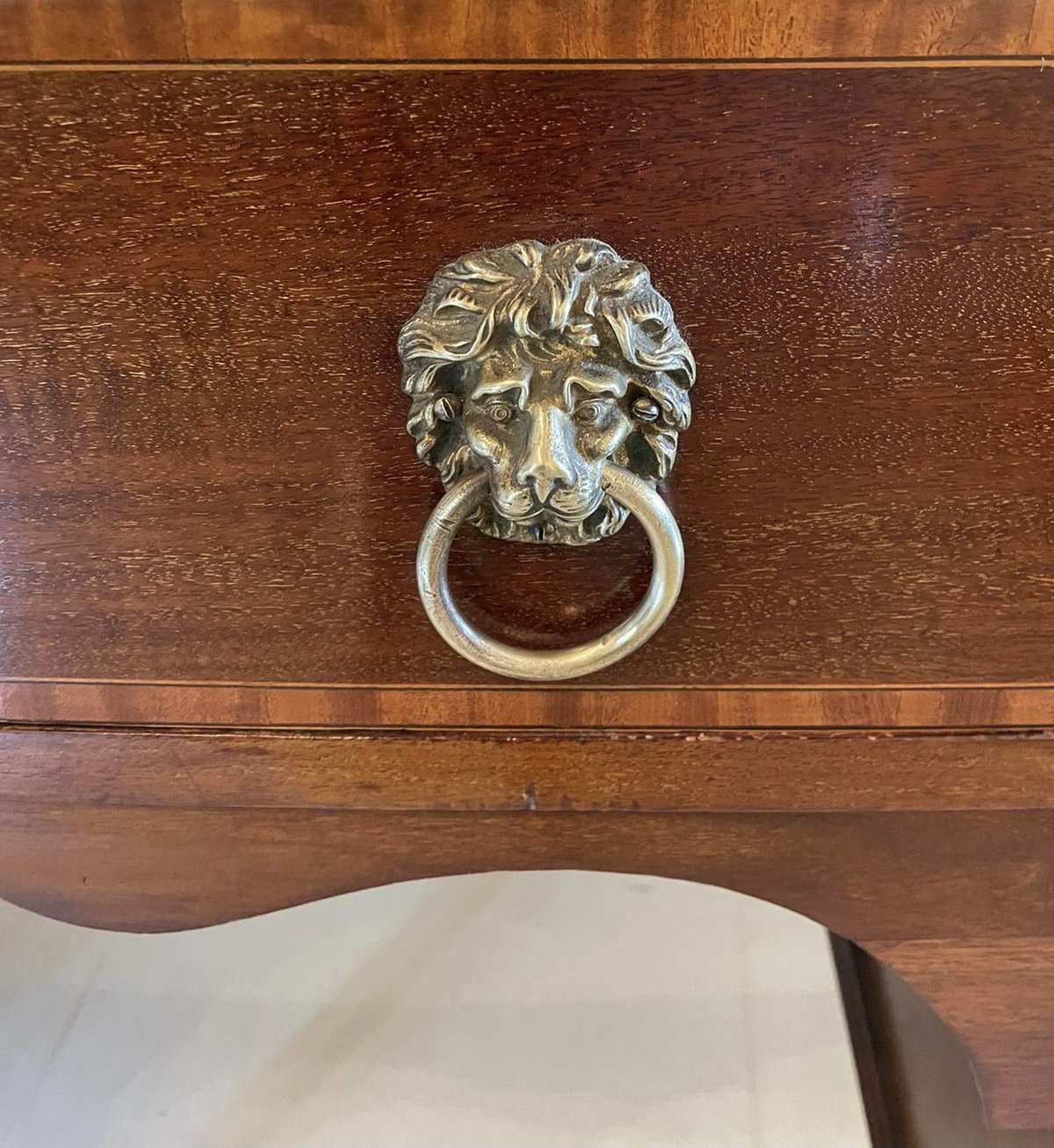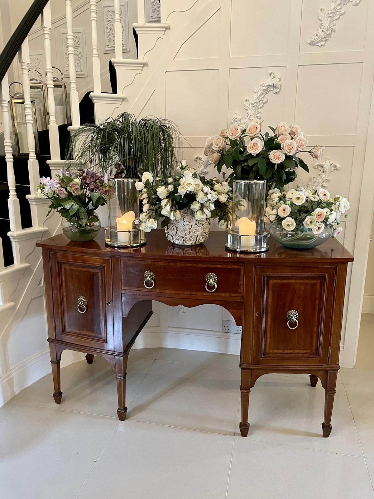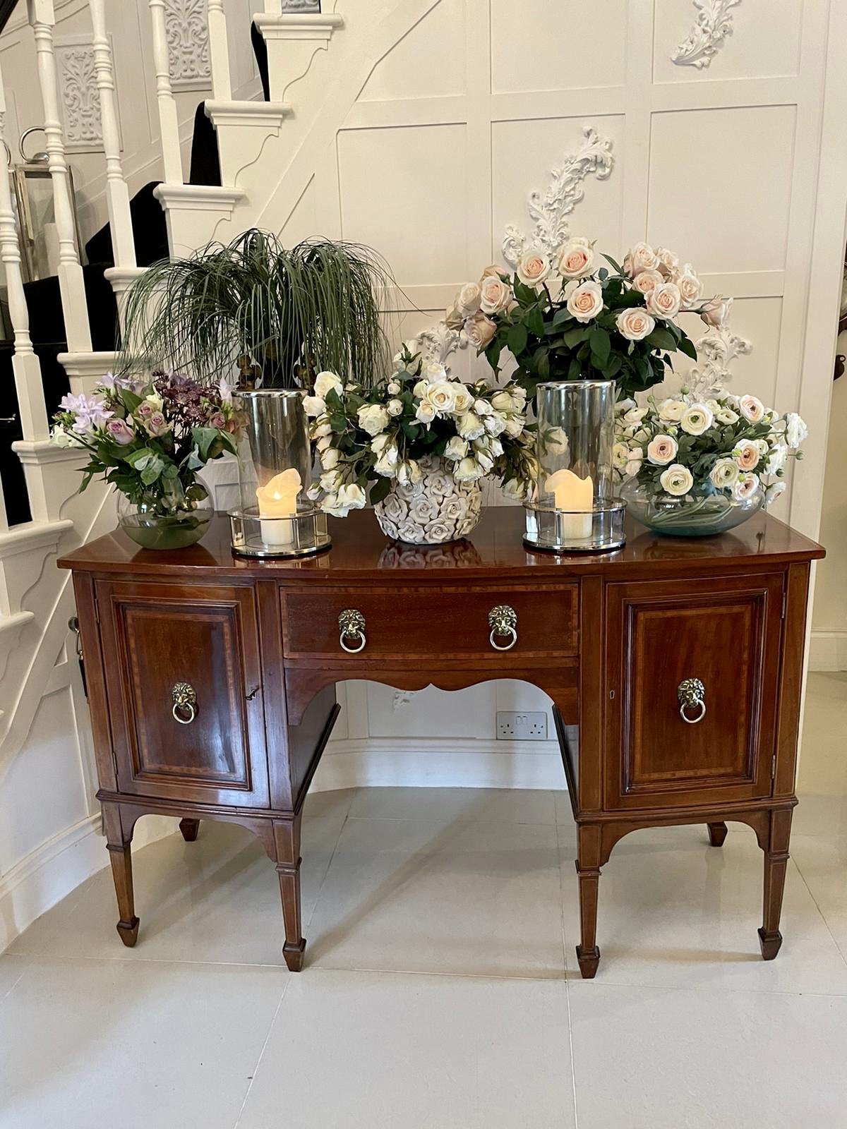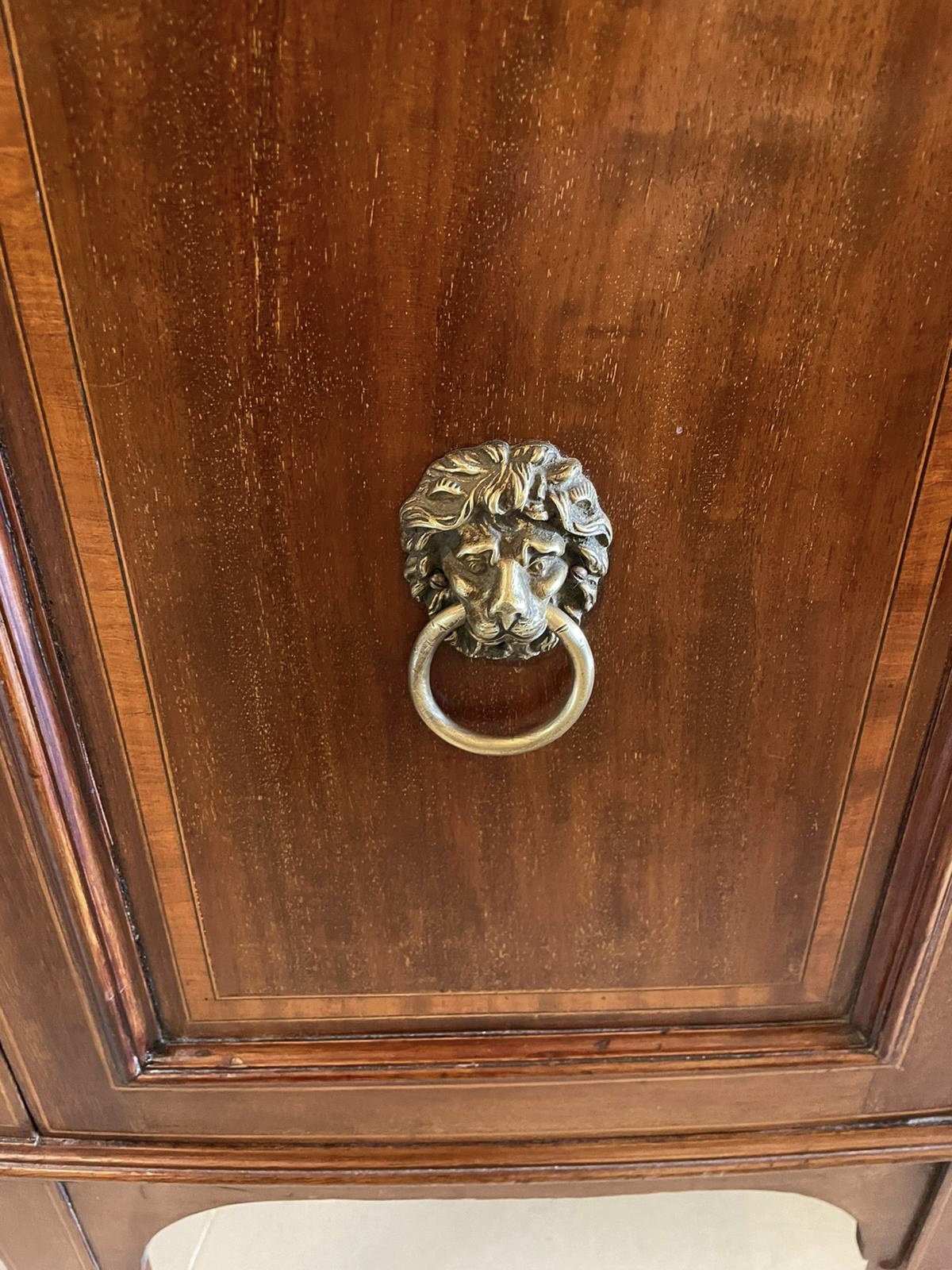 Quality antique Edwardian inlaid mahogany bow fronted sideboard having a quality mahogany top with pretty satinwood crossbanding, mahogany inlaid drawer with attractive original brass lions head handles to the centre flanked by two bow fronted moulded panel doors inlaid with satinwood and original brass lions head handles opening to reveal a sliding drawer and shaped apron. It stands on elegant square tapering inlaid mahogany legs with spade feet united by shaped mahogany brackets.