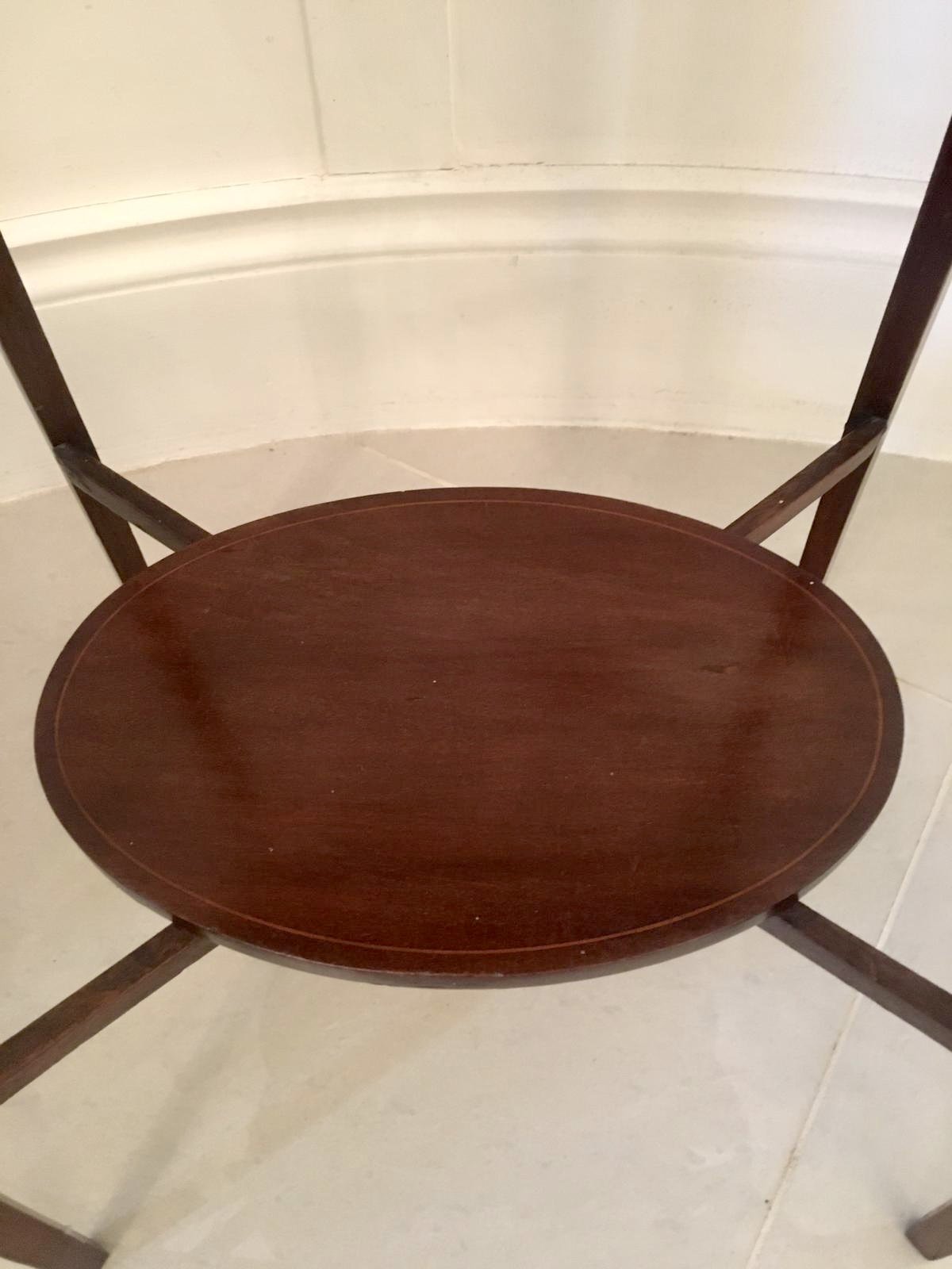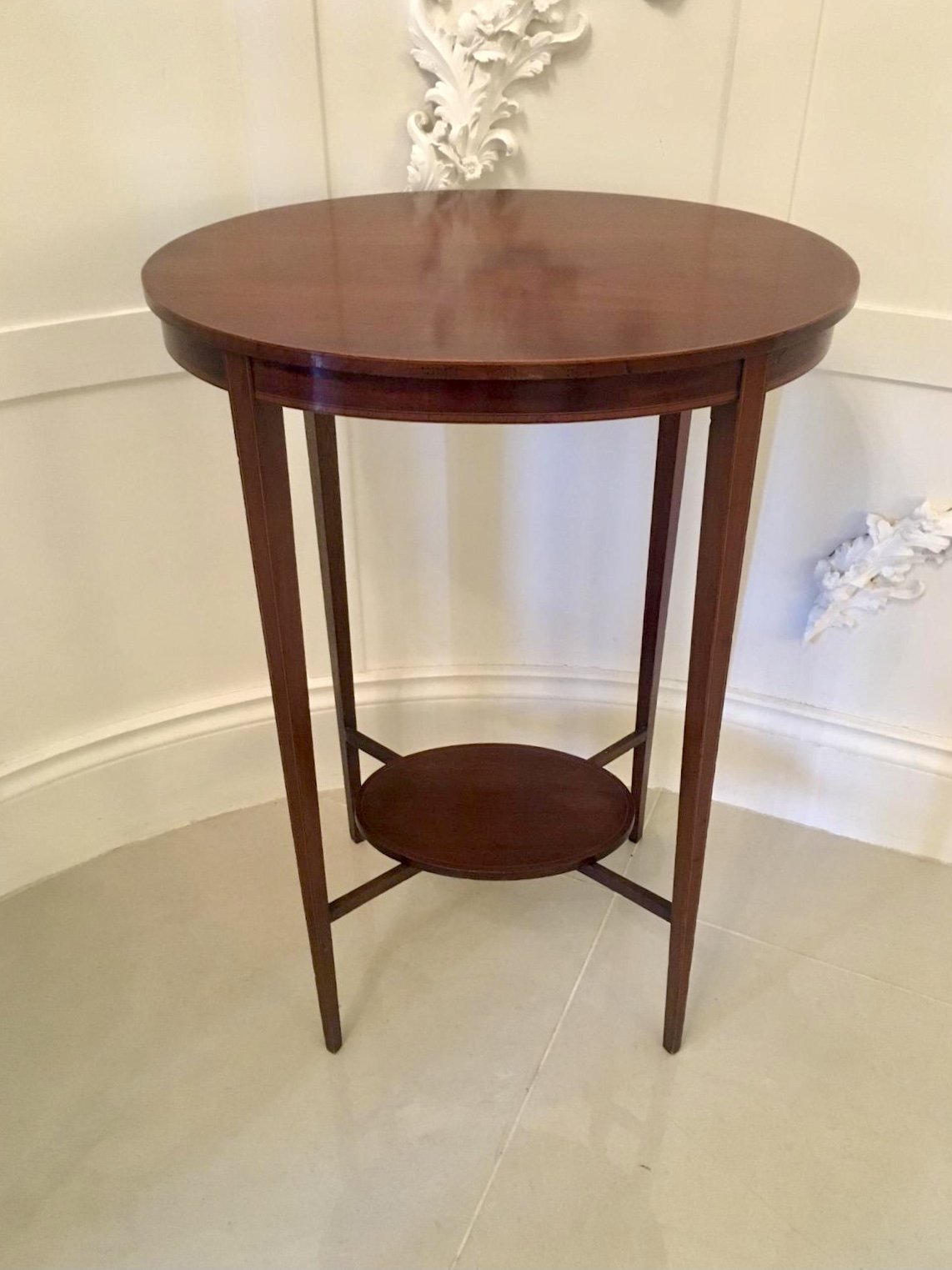 Quality antique Edwardian inlaid mahogany oval lamp table having a splendid quality oval mahogany top with pretty satinwood crossbanding standing on square tapering legs boasting boxwood stringing and united by square stretchers with an oval under tier.