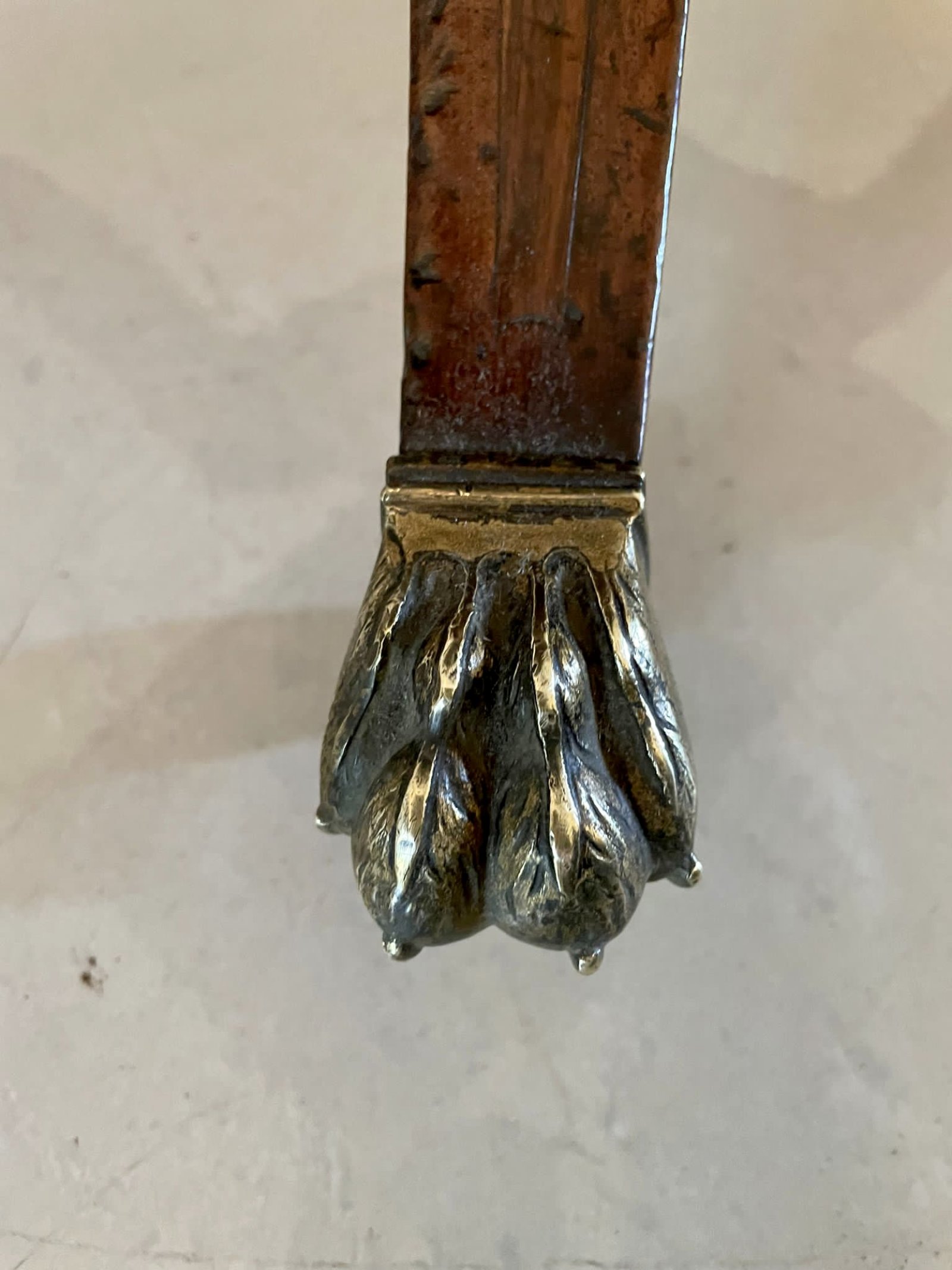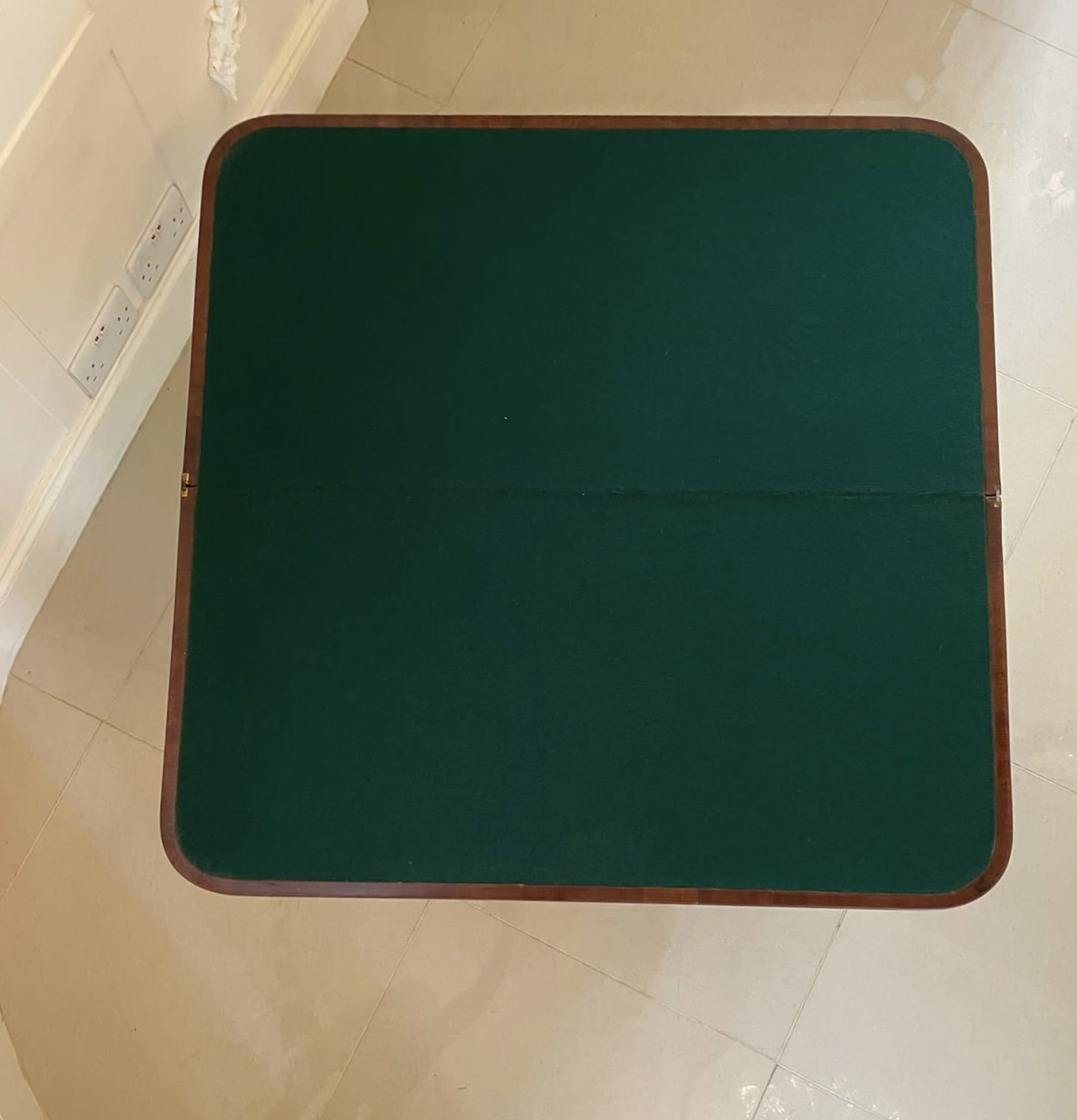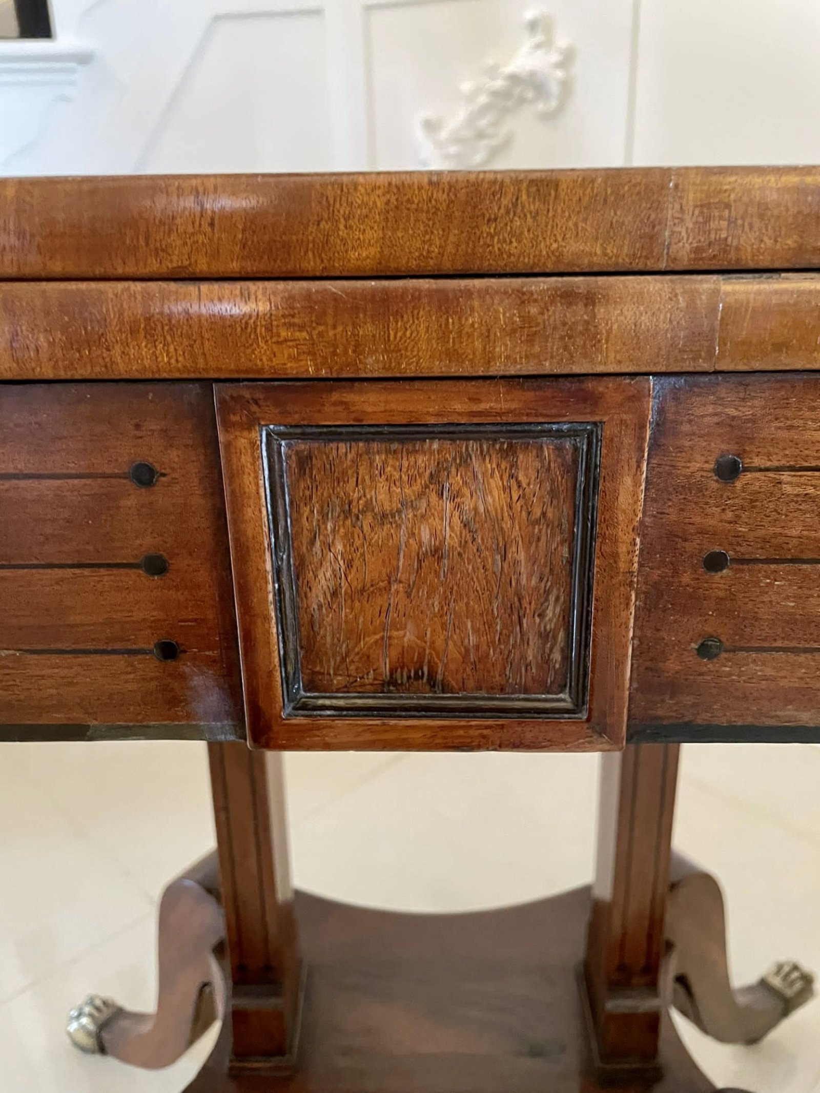 Quality antique regency mahogany inlaid card/side table having a superb quality inlaid mahogany swizzle top opening to reveal a green baize interior and an inlaid mahogany frieze. It is standing on a pair of inlaid mahogany supports to a shaped platform raised on shaped inlaid mahogany sabre feet with original brass claw feet and original brass casters.
