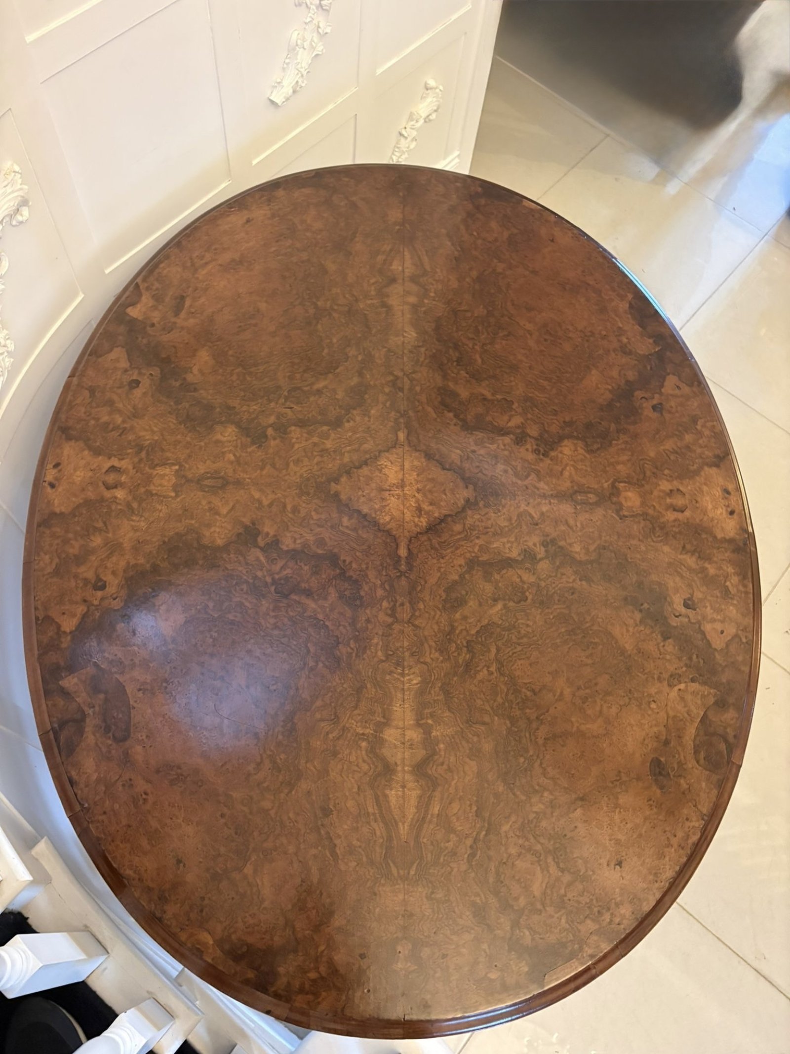 A highly impressive Victorian burr walnut dining table of elegant oval form, the top beautifully veneered in richly figured burr walnut with excellent symmetry and depth of colour. The surface displays dramatic natural figuring throughout, framed by a finely moulded edge that enhances the refined outline of the table.