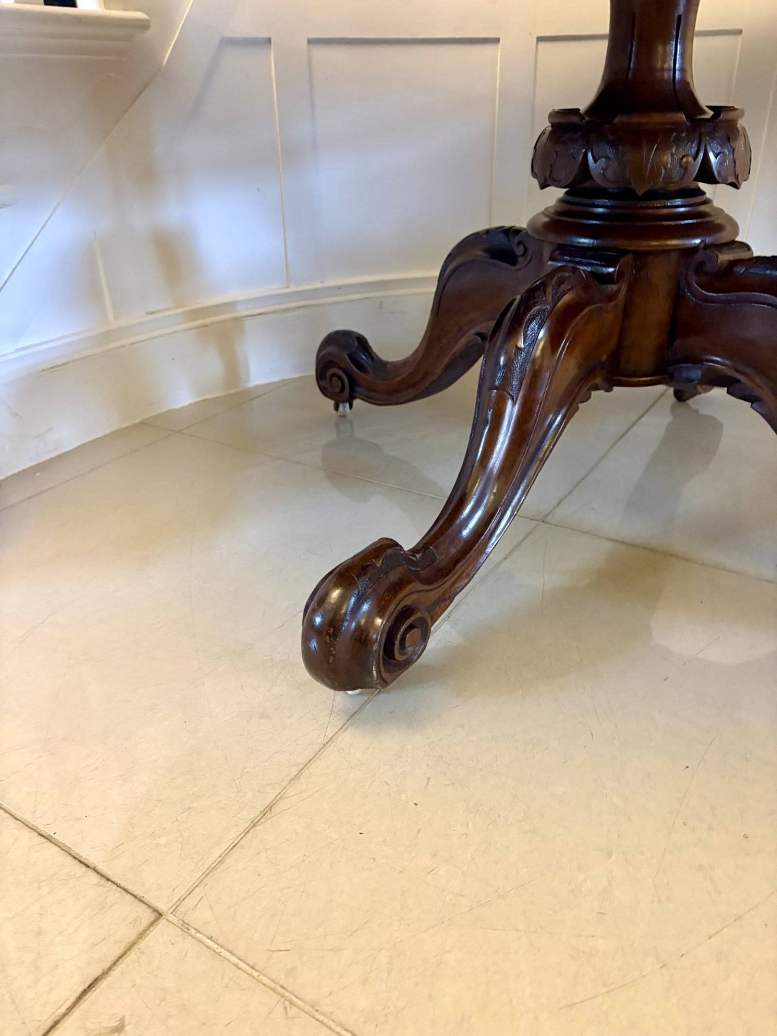 The table is supported on a boldly carved central pedestal base, enriched with acanthus-style carving and terminating in sweeping scroll feet. This substantial pedestal provides excellent stability while allowing generous legroom, making the table both practical and visually impressive.
