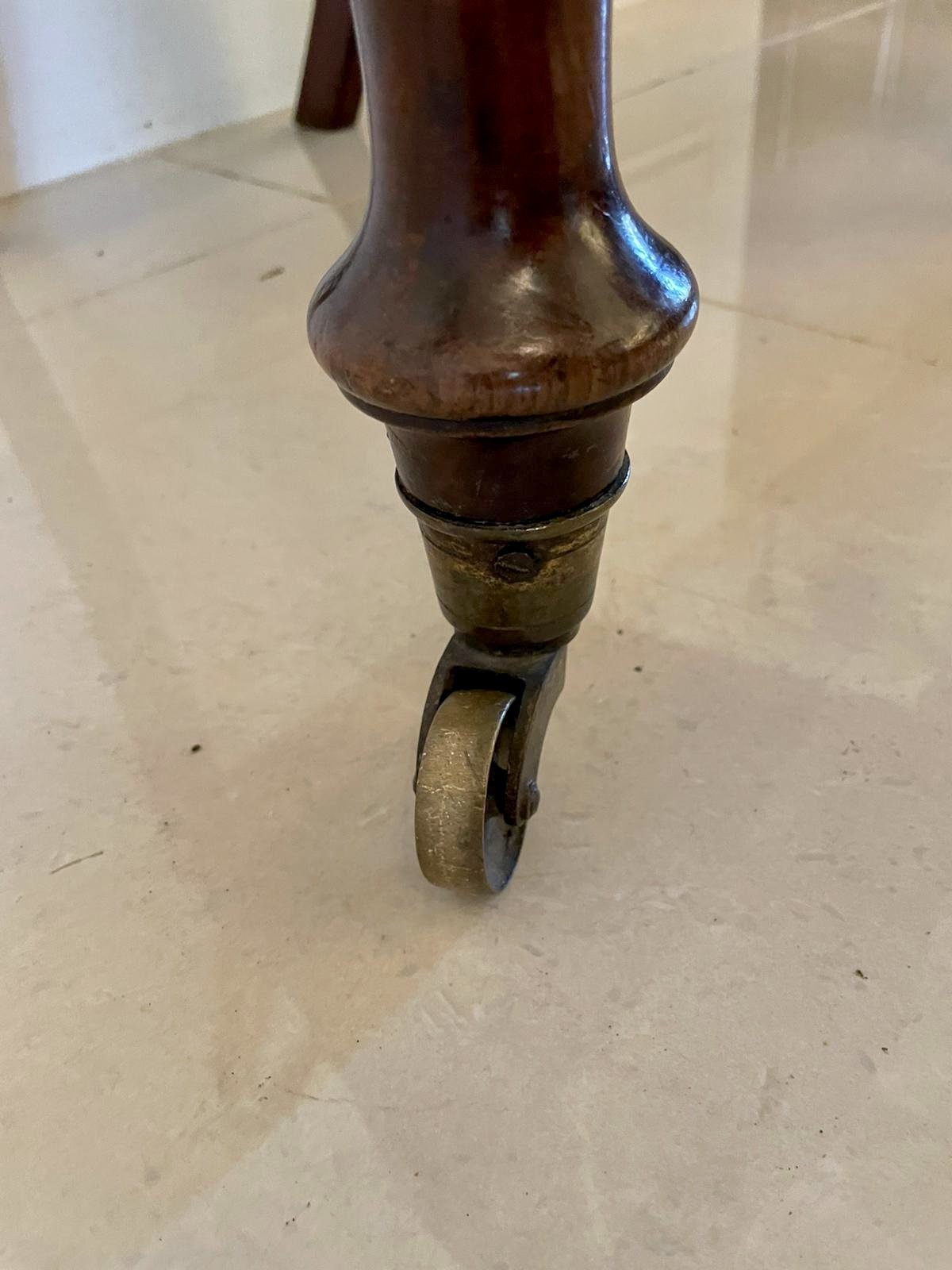 Quality antique Victorian mahogany set of four dining chairs having a quality shaped top and a shaped splat to the centre with serpentine shaped seats covered in a quality fabric. They stand on shaped turned legs to the front and out swept back legs with original castors.