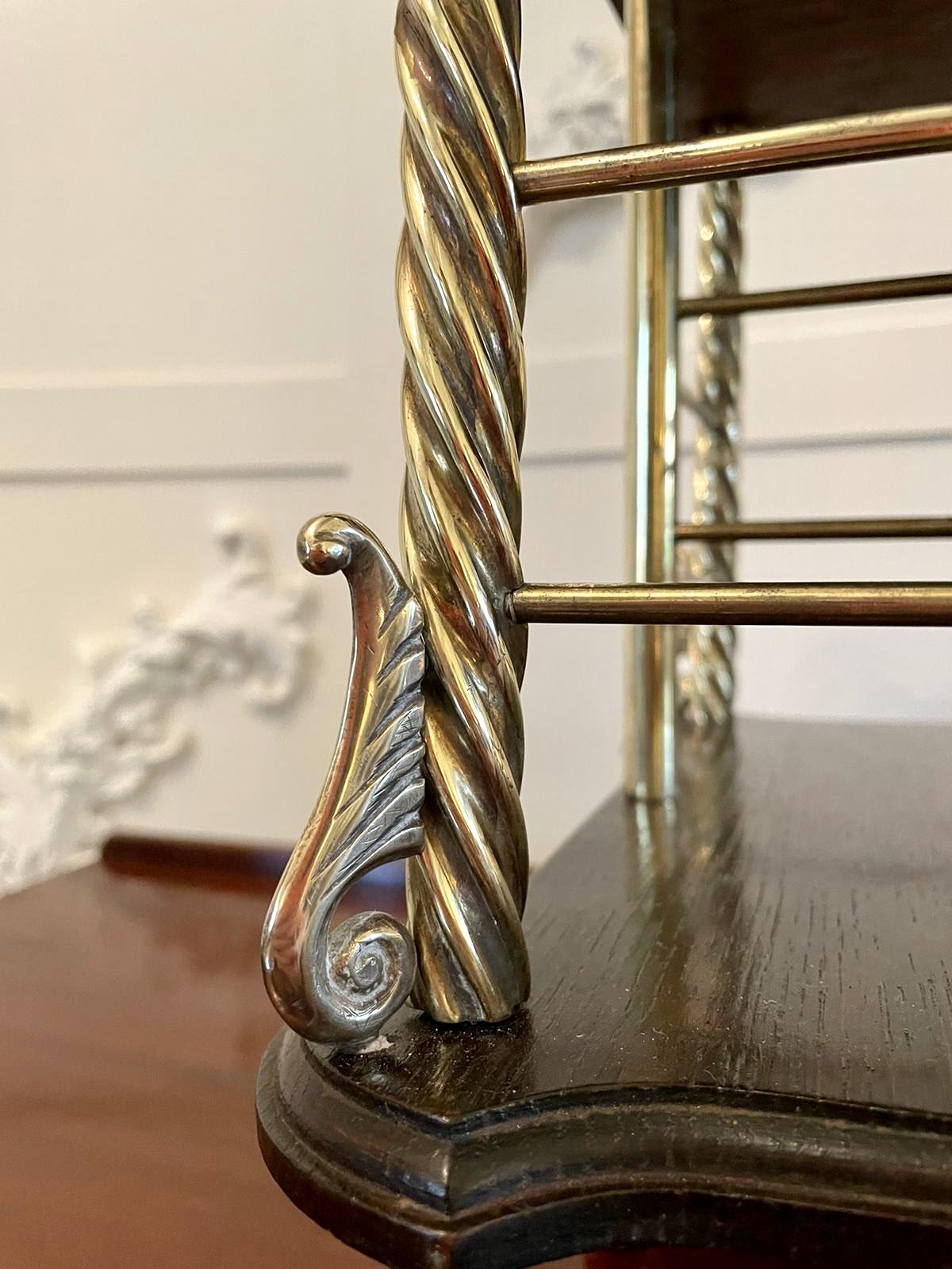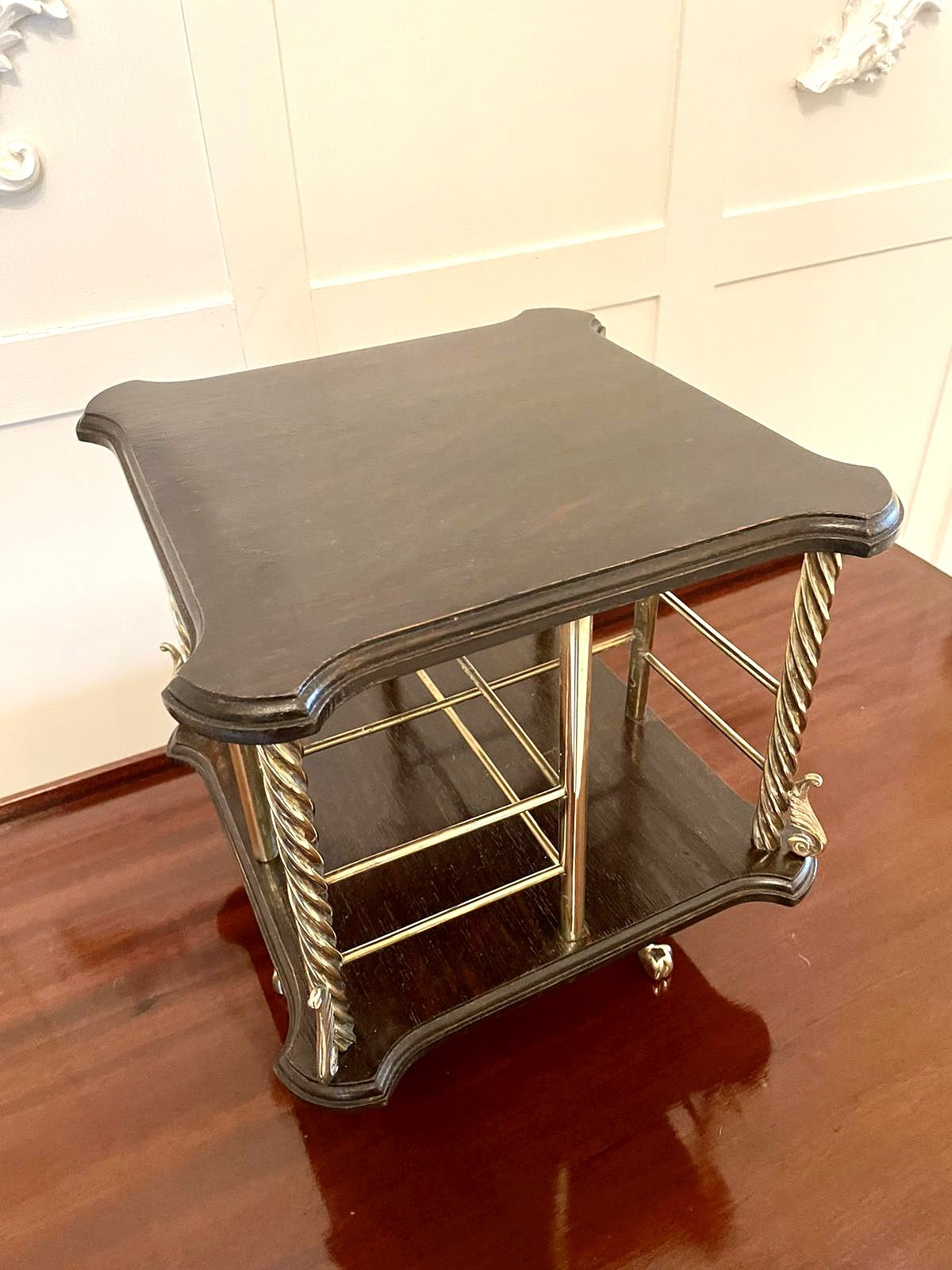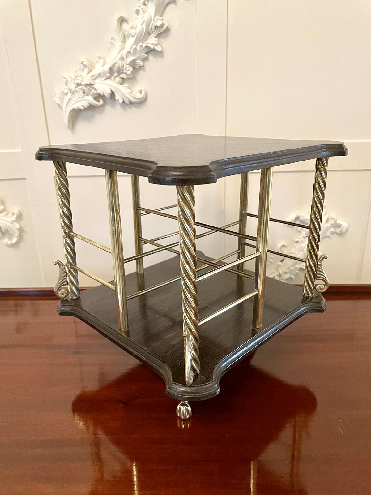 Quality antique Victorian oak revolving bookcase having a shaped oak top with moulded edge supported by four attractive quality roped twist brass columns and four circular brass columns united by sixteen circular brass rails. It is raised on a shaped oak base with moulded edge standing on a delightful revolving brass stand with shaped feet.